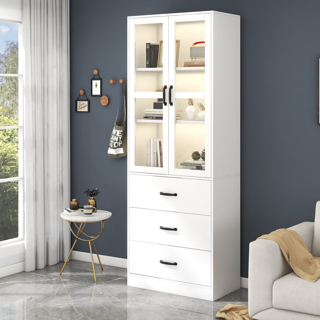 Display Cabinet, 200cm Freestanding with 3 Drawers, 2 Glass Doors, LED Lighting, White