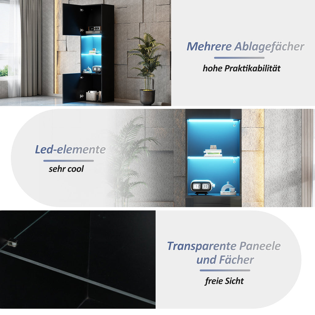 This black high-gloss cabinet features tempered glass dividers and LED strip lights, bringing a stylish and unique modern design to any space. It offers two extra-large storage compartments to meet most of your storage needs.