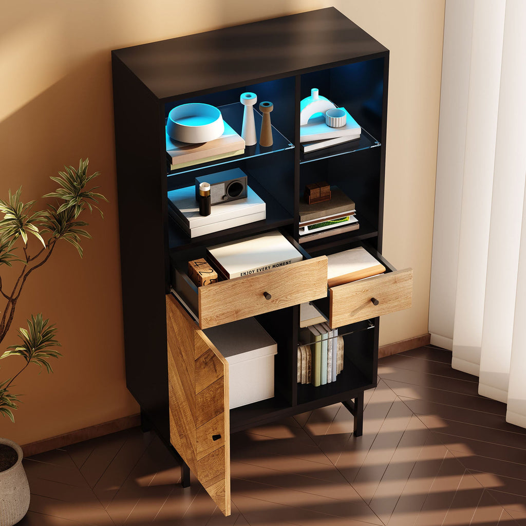 The cabinet features three glass shelves, perfect for displaying decorative items, collectibles, or books, while a hidden storage space with a door and two drawers neatly stores personal belongings. The cabinet is further enhanced by its 12-color, adjustable LED lighting, creating a sophisticated atmosphere and highlighting the beauty of your displayed items. Whether you're entertaining guests or enjoying a quiet evening at home, the lighting can be adjusted to suit any mood or occasion.