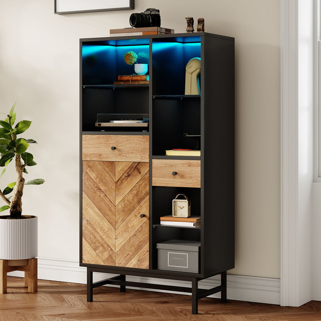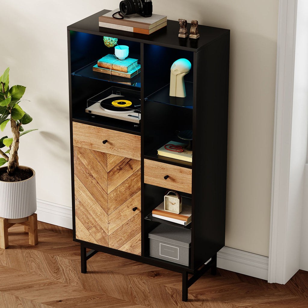 Display Cabinet, LED Light Strip, Drawers, Glass Shelves, Triangular Wood Grain