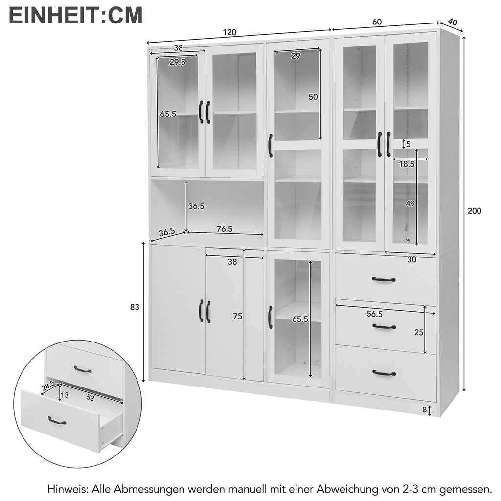 Our combination display cabinet set, impressively measuring 200 cm high and 180 cm long, is the ideal solution for stylish presentation and practical storage. The white freestanding display cabinet features 16-color LED lighting, which not only creates an inviting atmosphere but also showcases your exhibits.