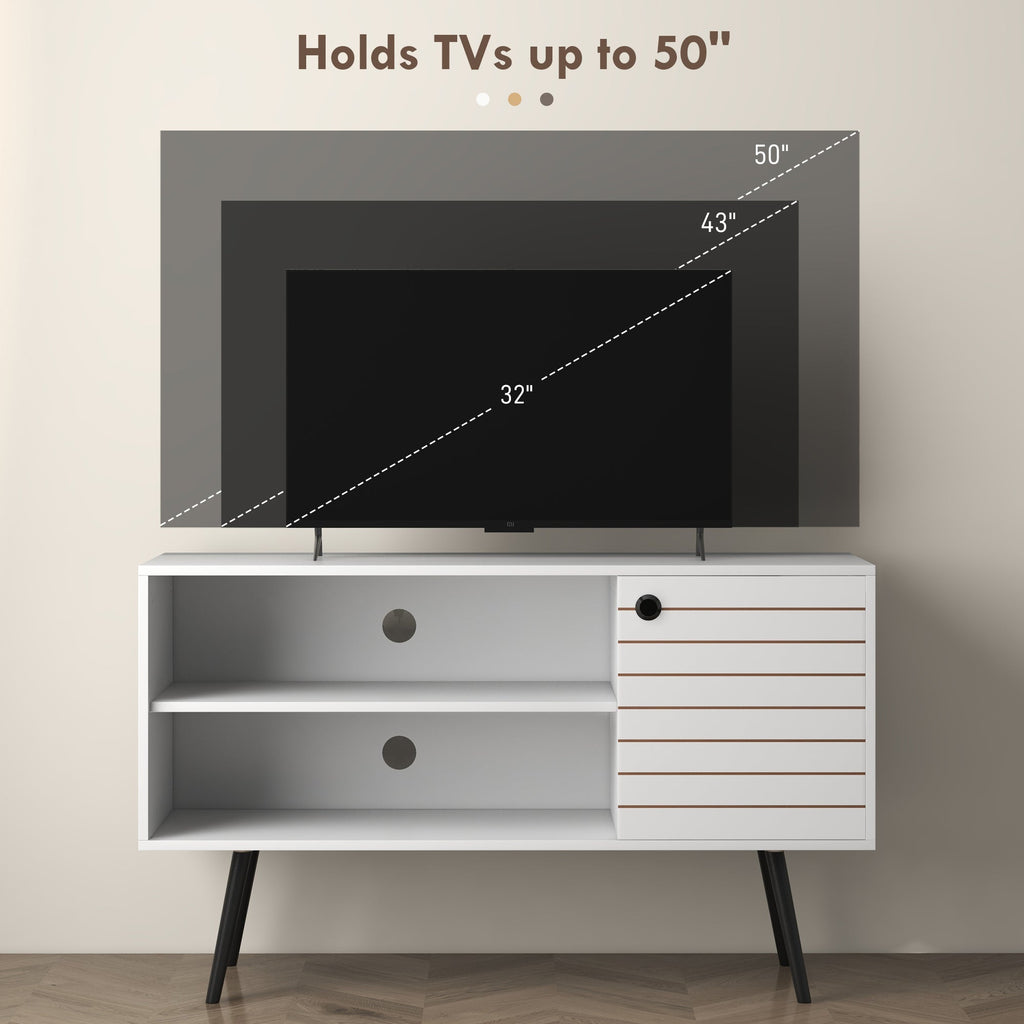 This duo storage TV unit comes with two shelves and a side cupboard, allowing you to keep media devices and accessories organized in one place. The tabletop can accommodate screens up to 50".