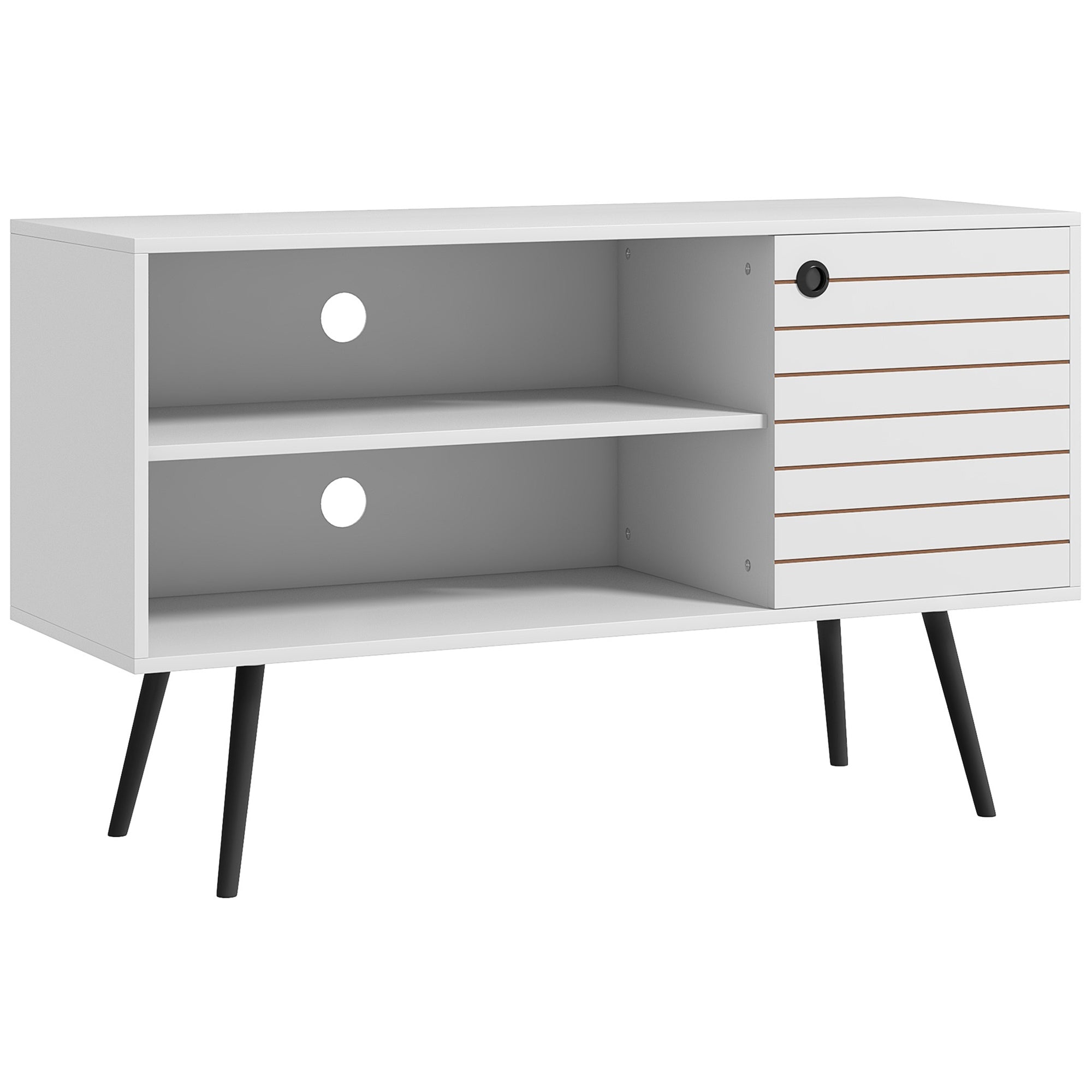 The unit features a striped door, adding a touch of subtle character to this TV bench. It stands on wooden legs, providing a strong supportive base for the TV cabinet.