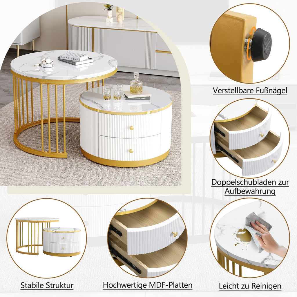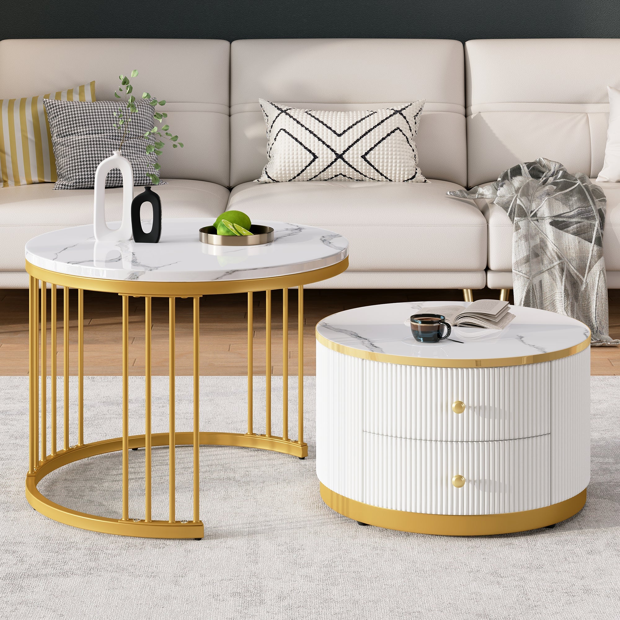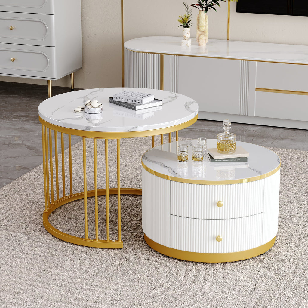 Elegant Nesting Coffee Table Set with Drawers, White Marble Look