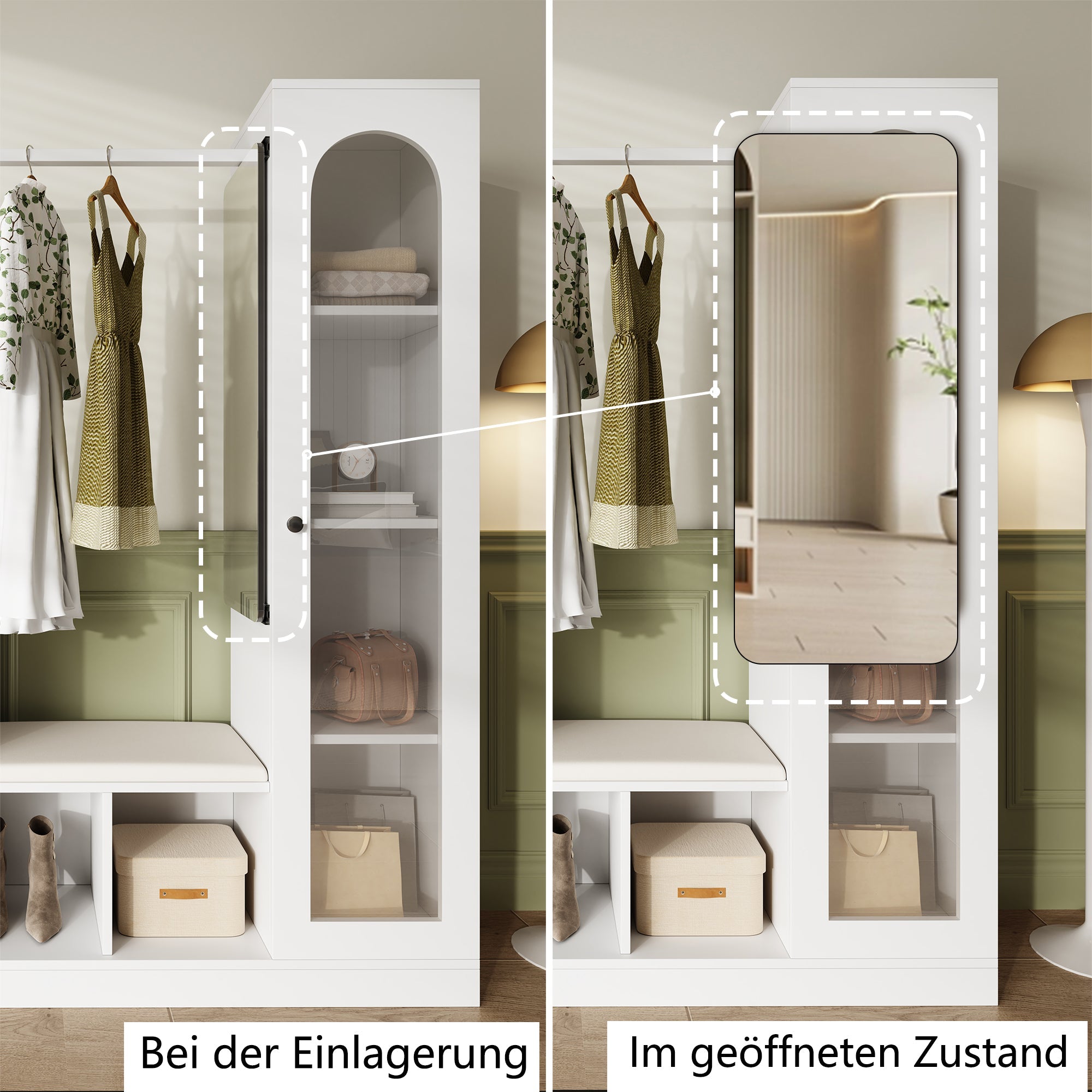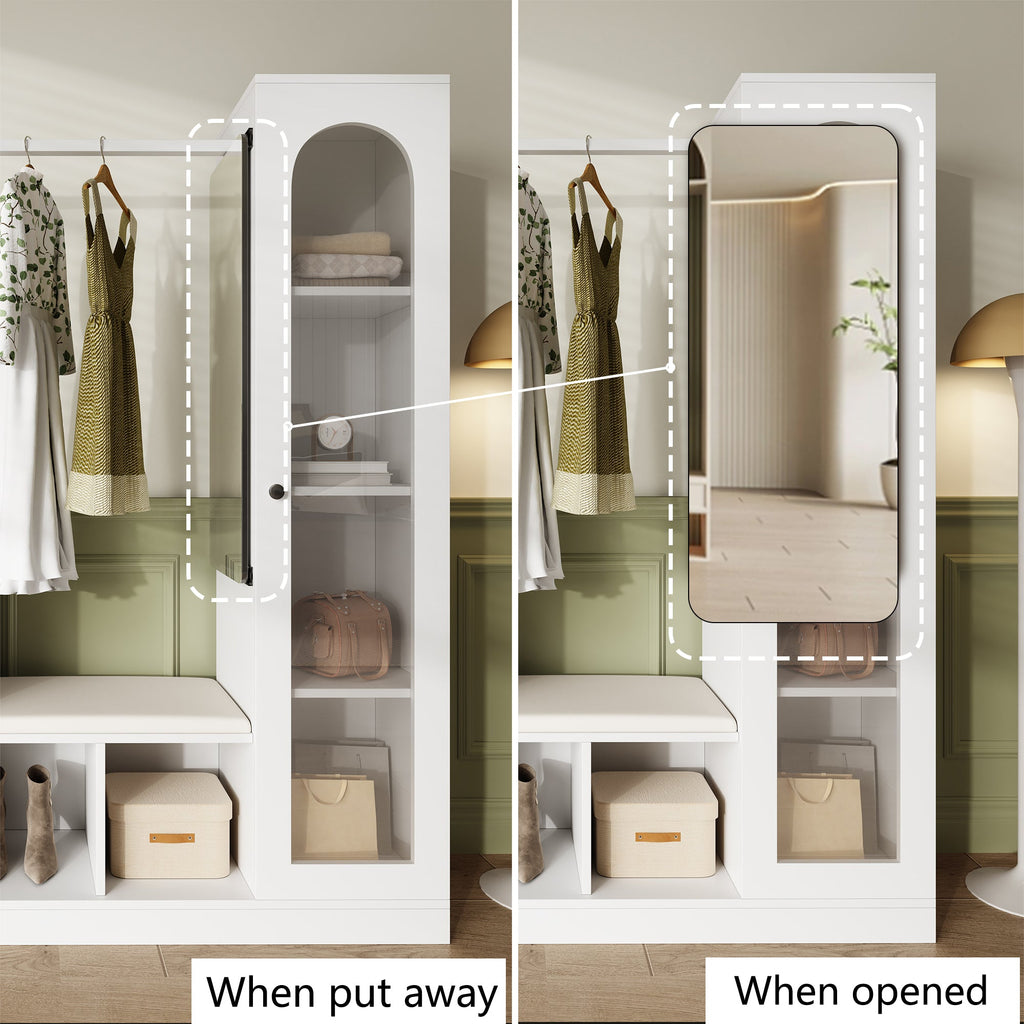 A full-length mirror with a rotating and folding mechanism saves space while creating a private dressing area. The display cabinet with adjustable shelves offers flexible and attractive storage for bags, jewelry, and everyday items. The side umbrella holder and water bowl at the bottom are especially practical on rainy days, while the metal key hook provides a perfect place for small items. This is more than just a piece of furniture; it is a solution that combines storage, display, and lifestyle aesthetics.
