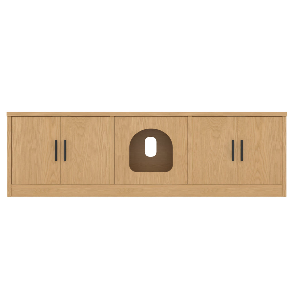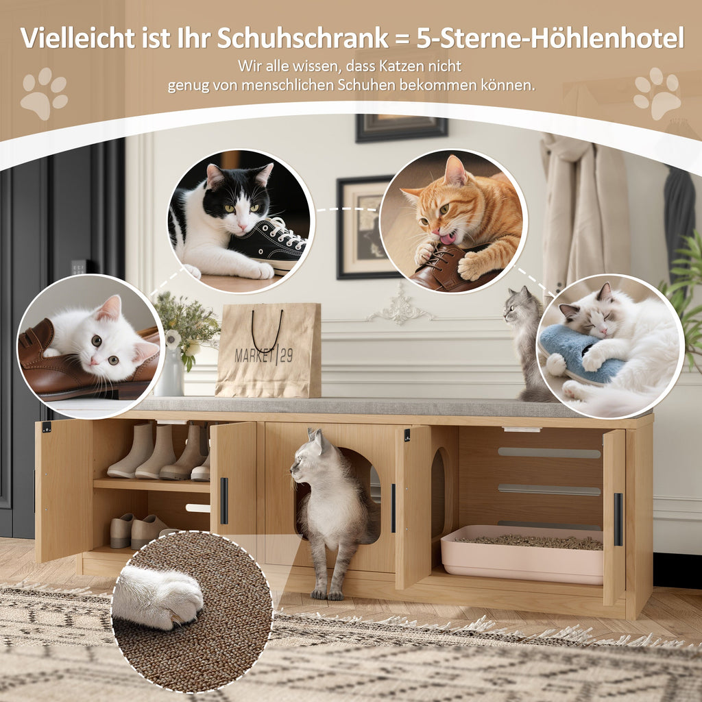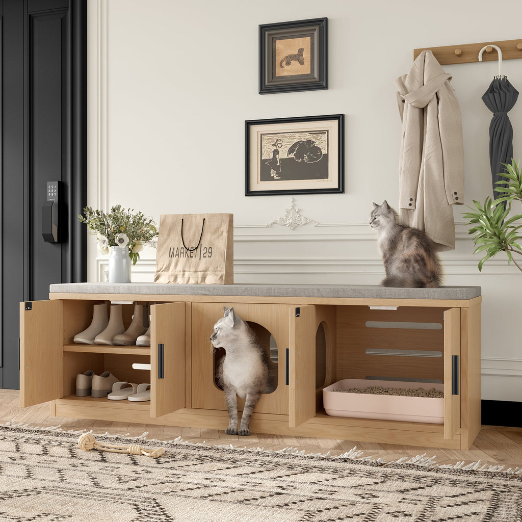 Combines a shoe-changing bench, seating bench, two litter box cabinets, a storage cabinet, and a cat house—all in one stylish piece of furniture.