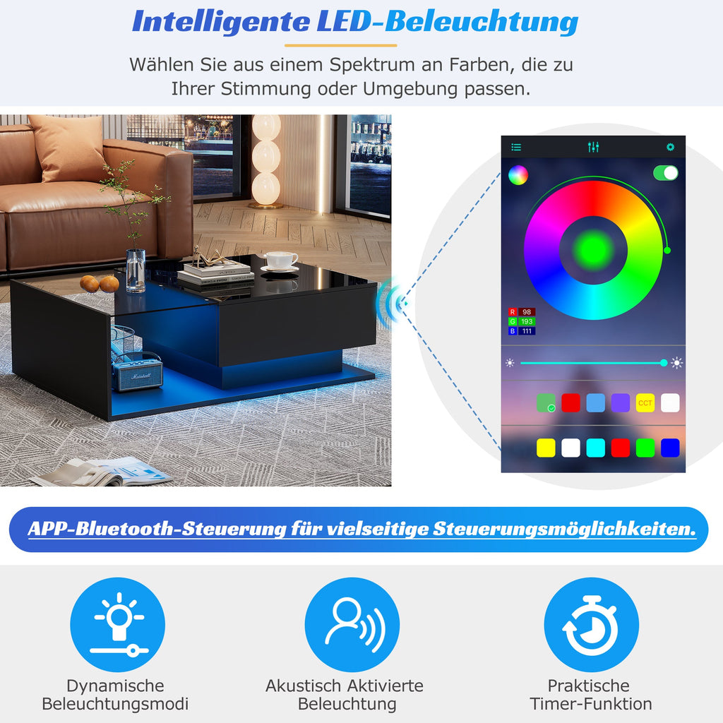 The innovative glass design is a highlight of this coffee table. One half of the tabletop is made of sturdy glass, which is not only aesthetically pleasing but also offers additional functionality. The glass blends seamlessly into the high-gloss surface, giving the coffee table a modern and luxurious look. The interplay between the glass and the high-gloss surface makes this coffee table a true focal point.
