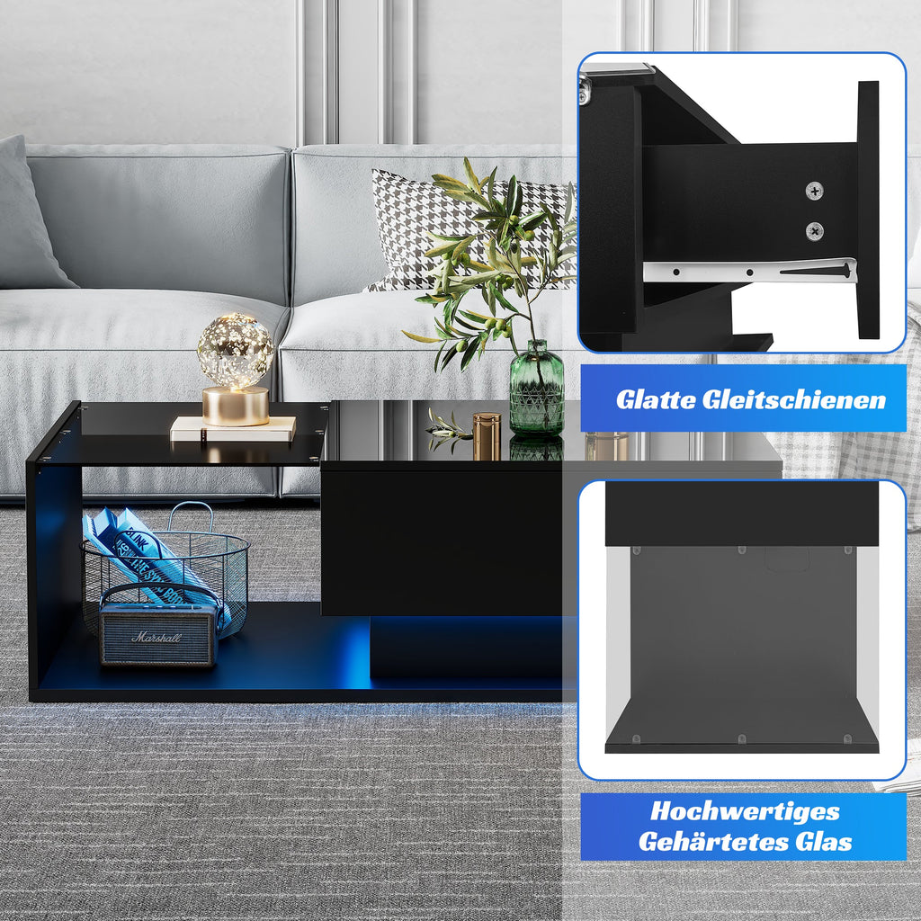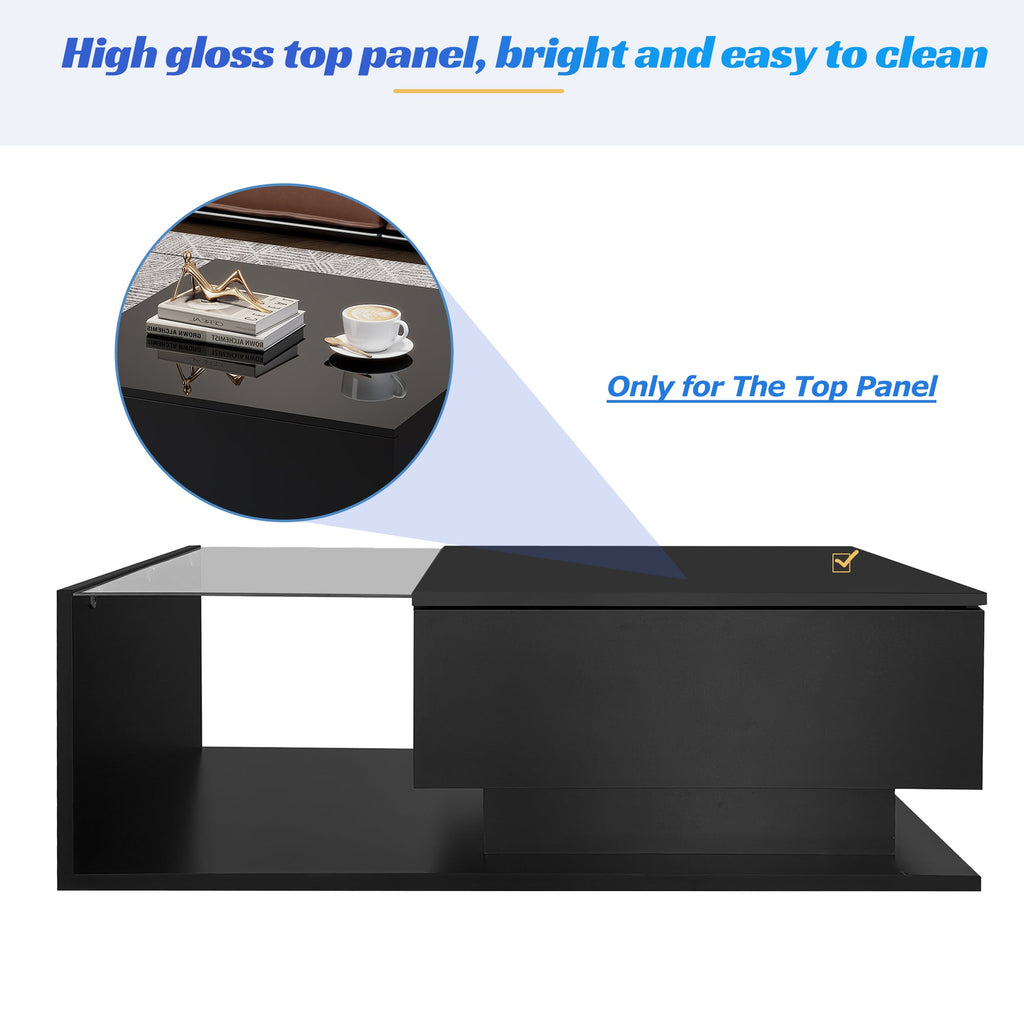 High-gloss Black Coffee Table with Glass Top & Drawers