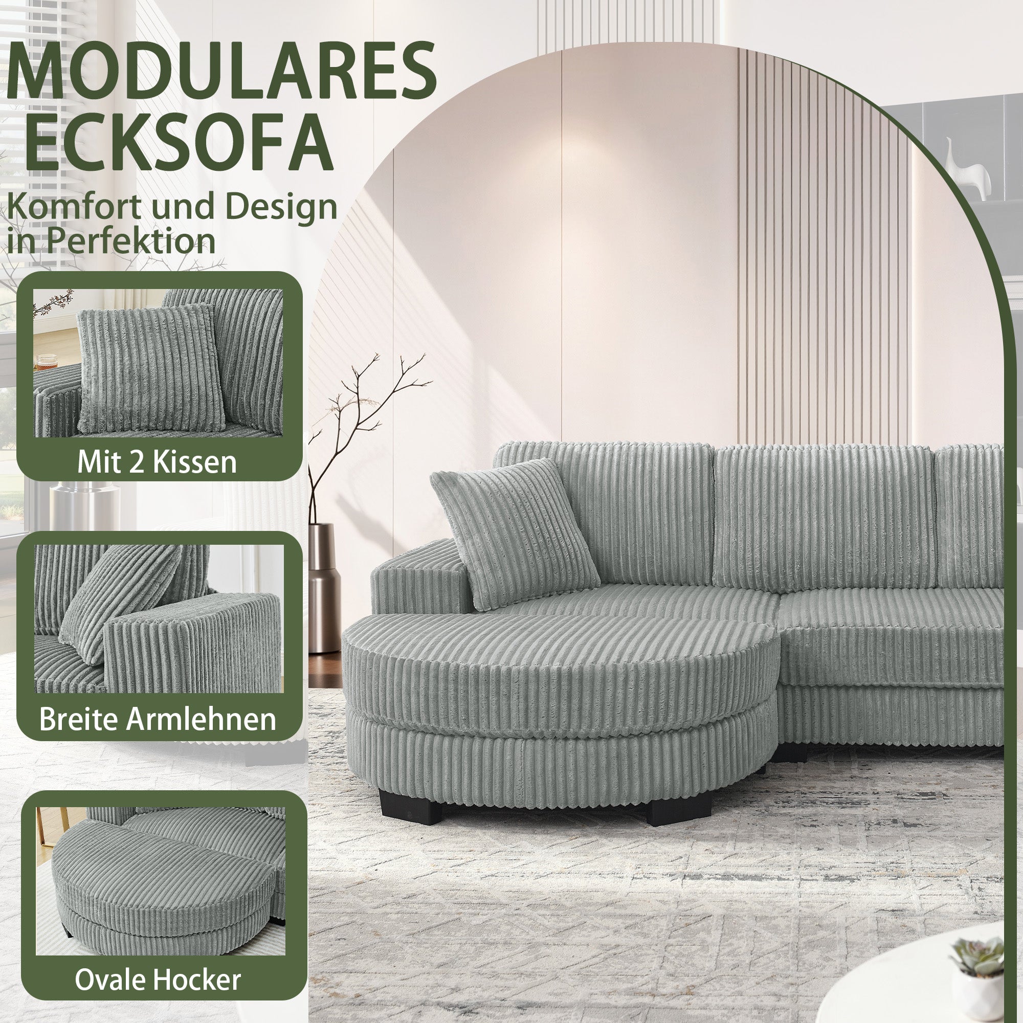 L-shaped Corner Sofa Modular 4-Seater with Oval Ottoman Corduroy Gray