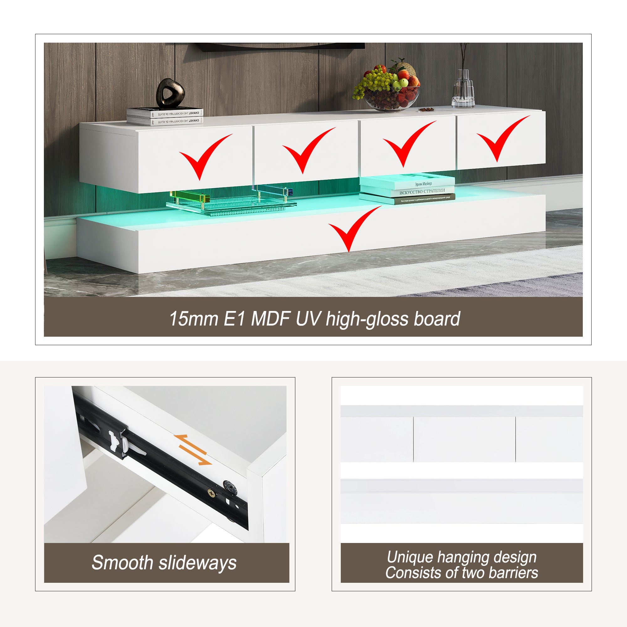 This product seamlessly combines multifunctional storage with an aesthetically pleasing, hanging hollow design. It can be conveniently wall-mounted to maximize space, making it perfect for smaller living areas. Its modern, lightweight appearance effortlessly blends into any decor. Four equally sized drawers on the top, with internal dimensions of 23.5 x 25 x 6.5 cm, provide organized space for books, clothing, or various utensils. The hollow design may incorporate transparent elements, adding extra charm to the piece. This ensures everything is neatly stored while the stylish design enhances your home. It's both practical and elegant!