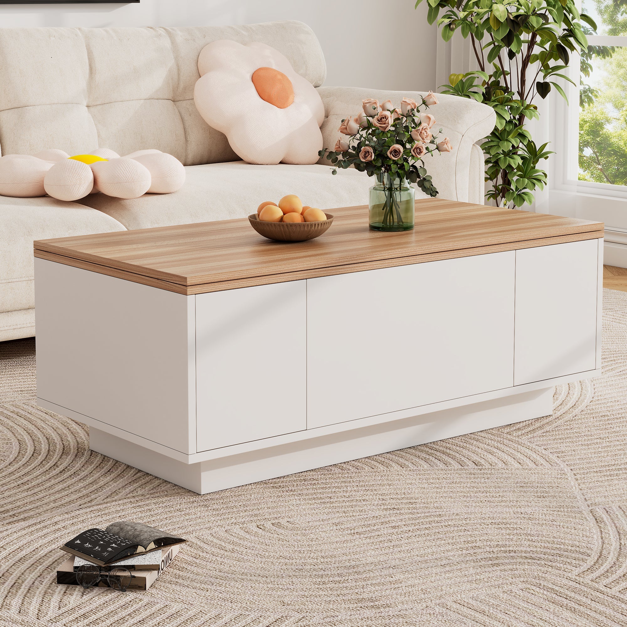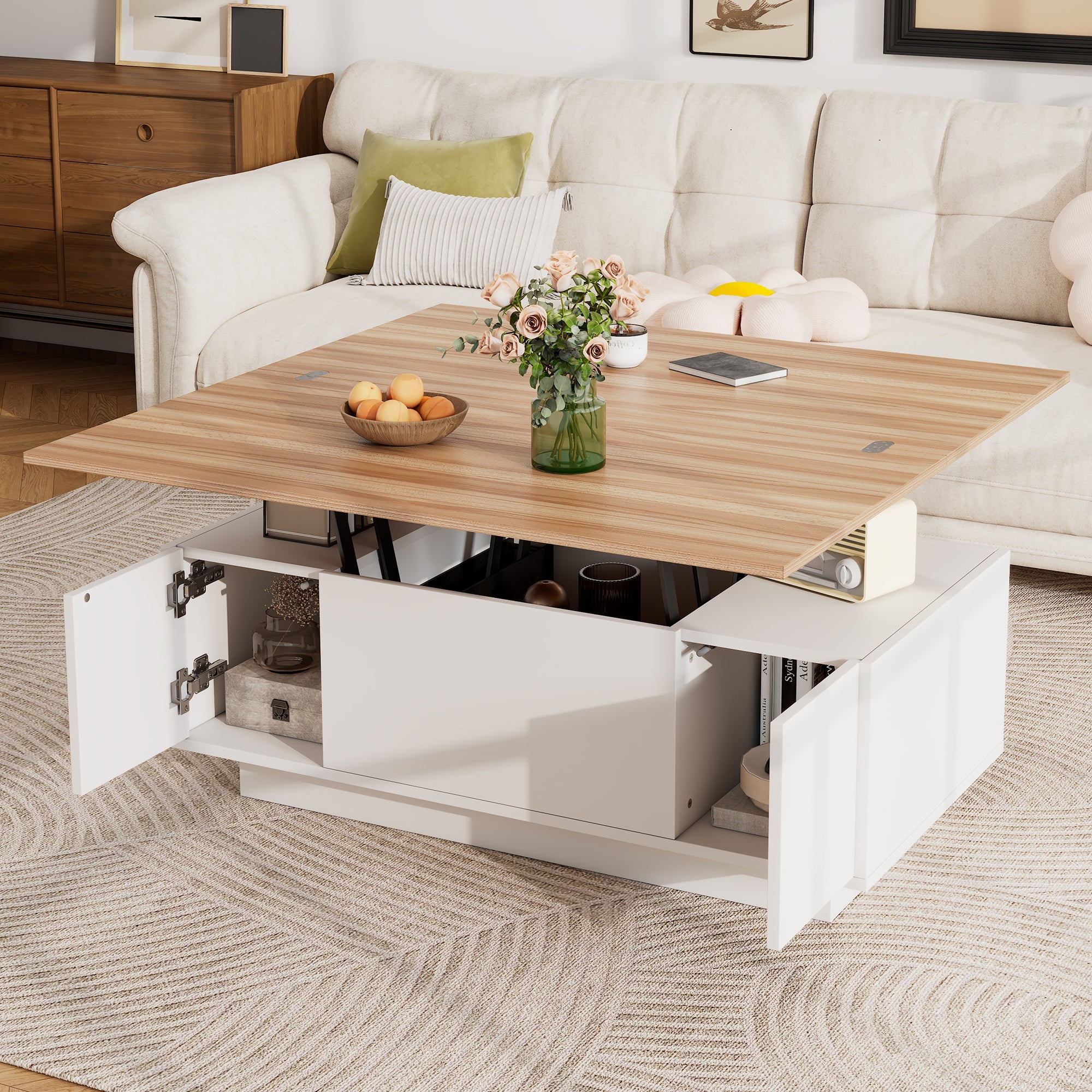 Lift Up Coffee Table Hidden Storage, 2 Lifting Platforms, White + Wood Particleboard
