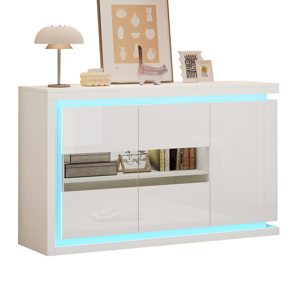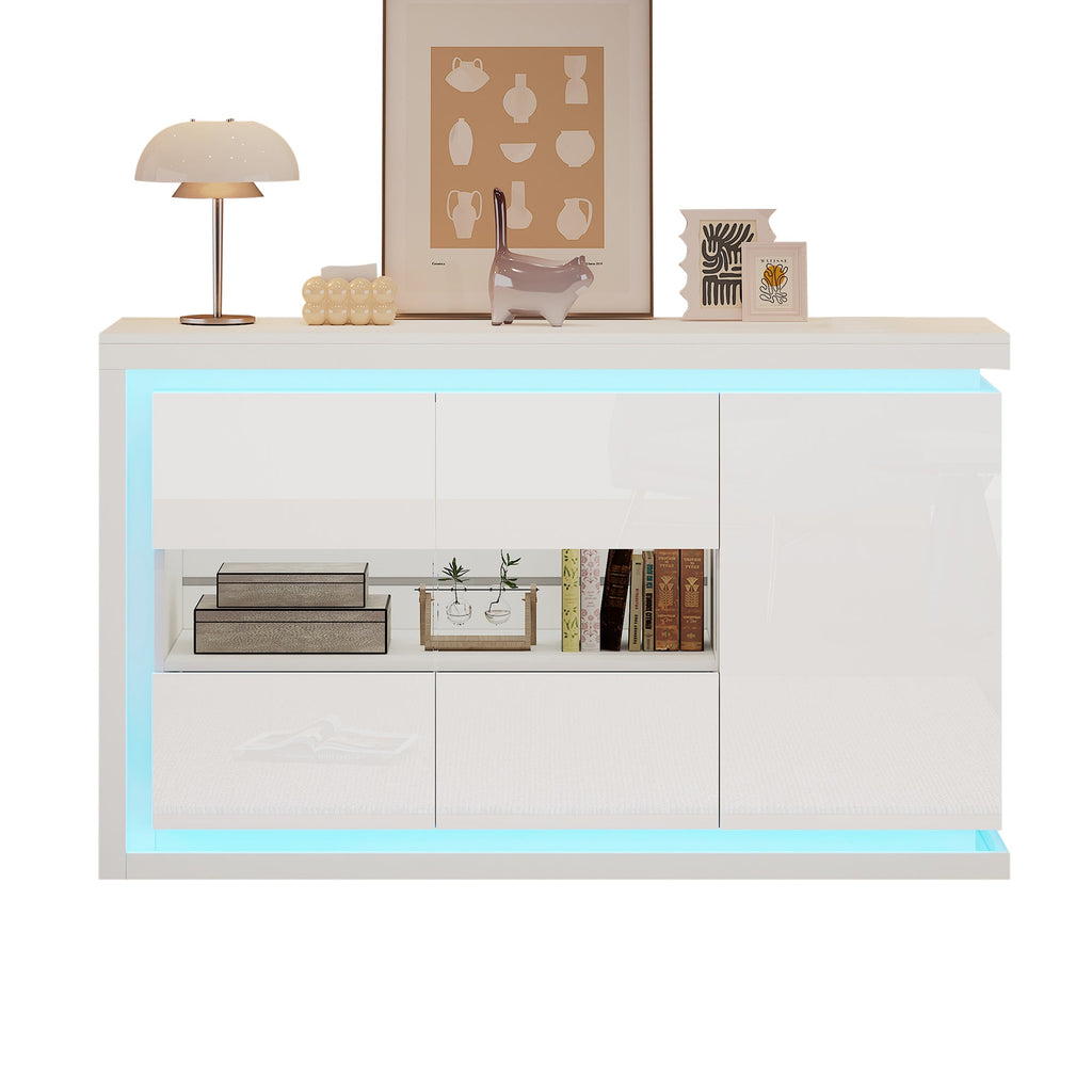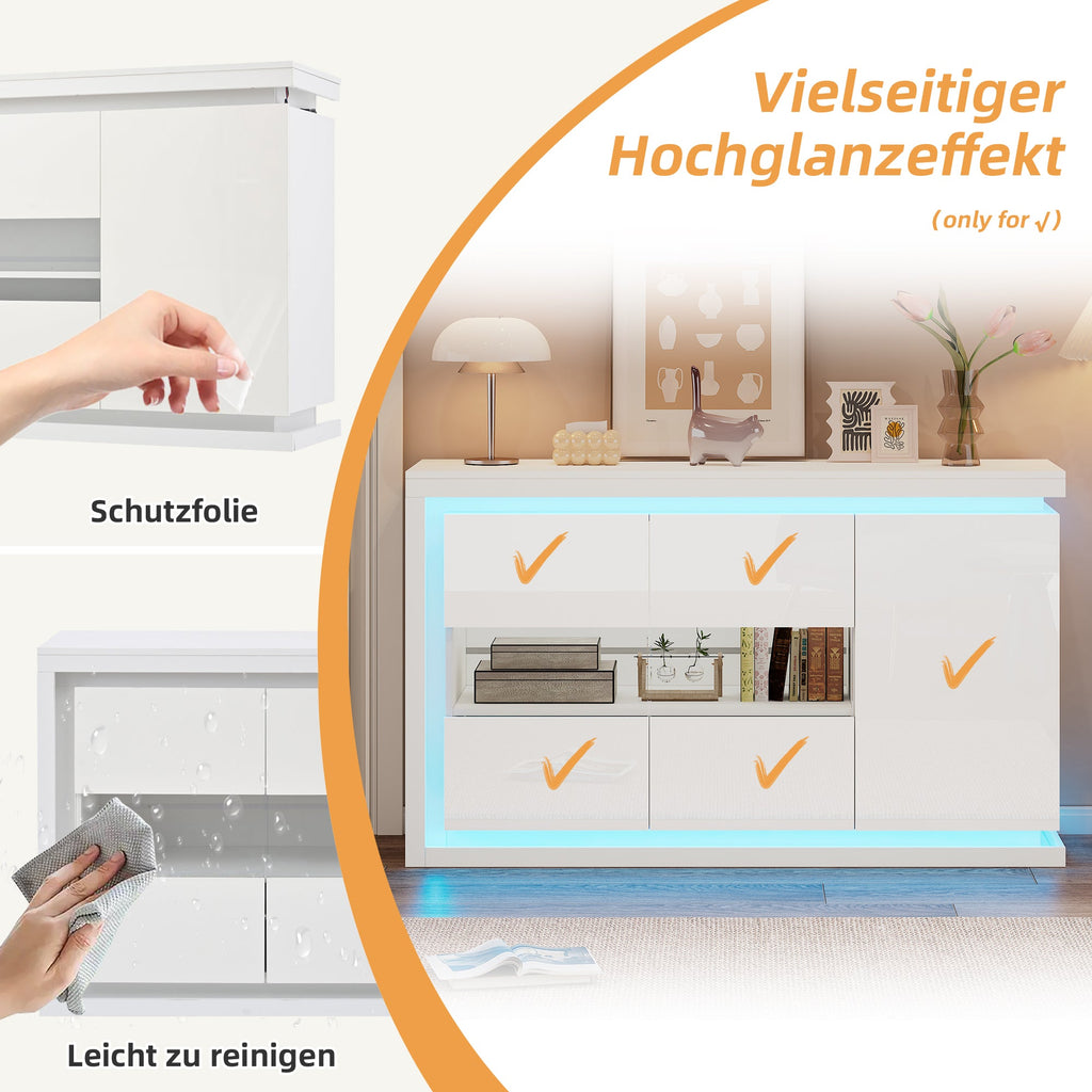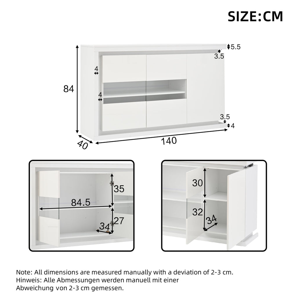 This modern living room sideboard measures 140 x 40 x 84 cm and features three doors. Two of the doors are transparent and crafted from tempered glass. The LED light strips are controlled by remote control, creating an atmospheric ambiance in your living space. The white section of the front door has a high-gloss finish. The three sides boast a hollowed-out design that beautifully complements the LED light strips, adding a stylish touch.
