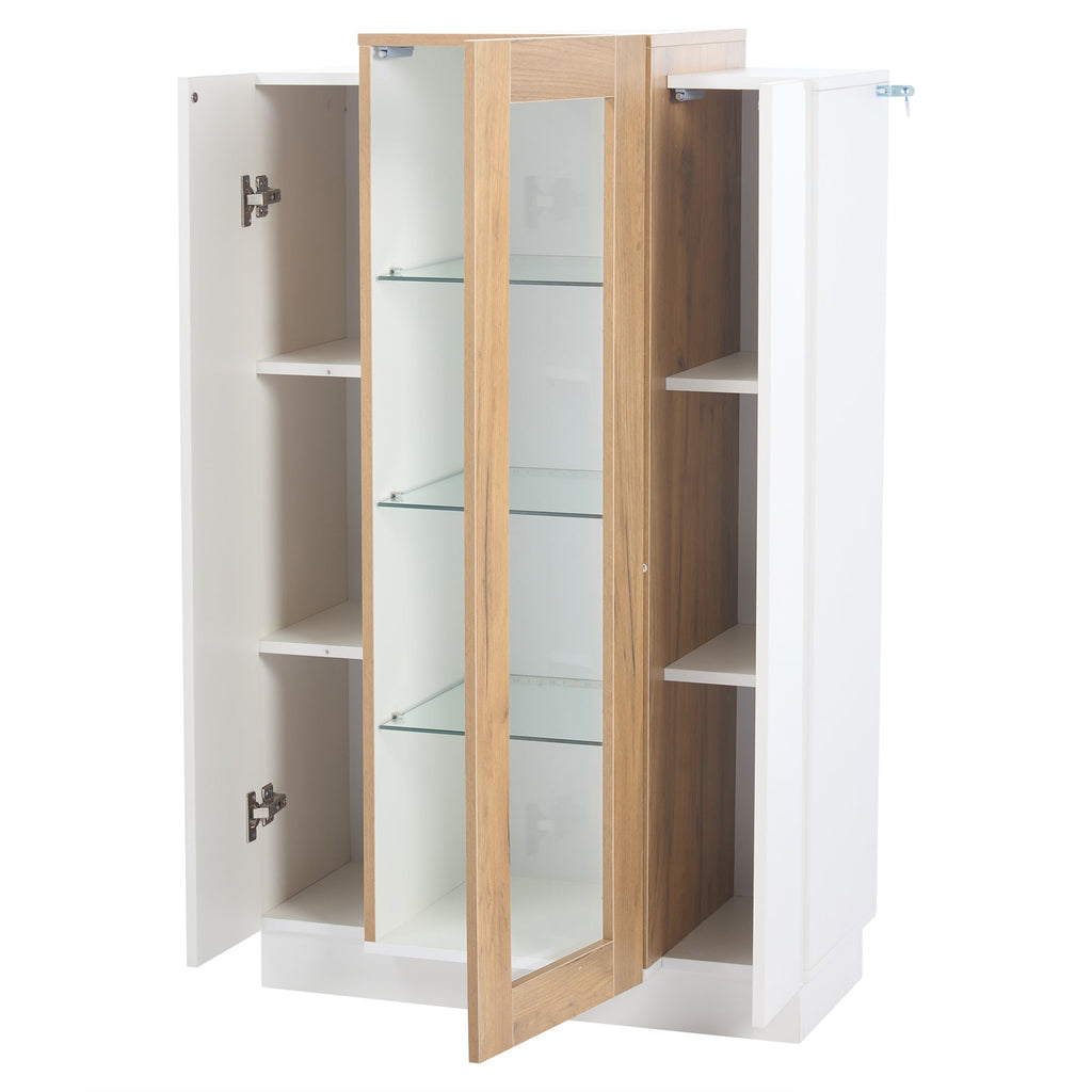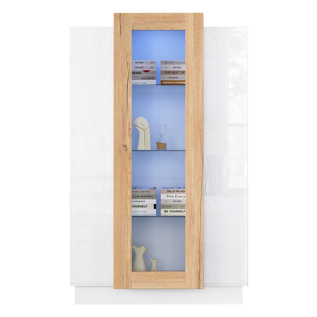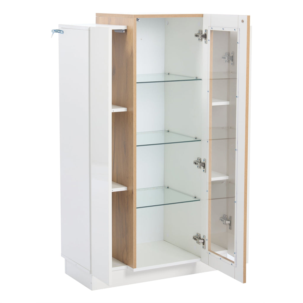 The rebounder switch and particle board material ensure easy interaction and durability. The white wood grain color scheme is suitable for multiple styles. The glass partition and acrylic ensure safety. The modular design is easy to disassemble and assemble, making it ideal for displaying books and collections.