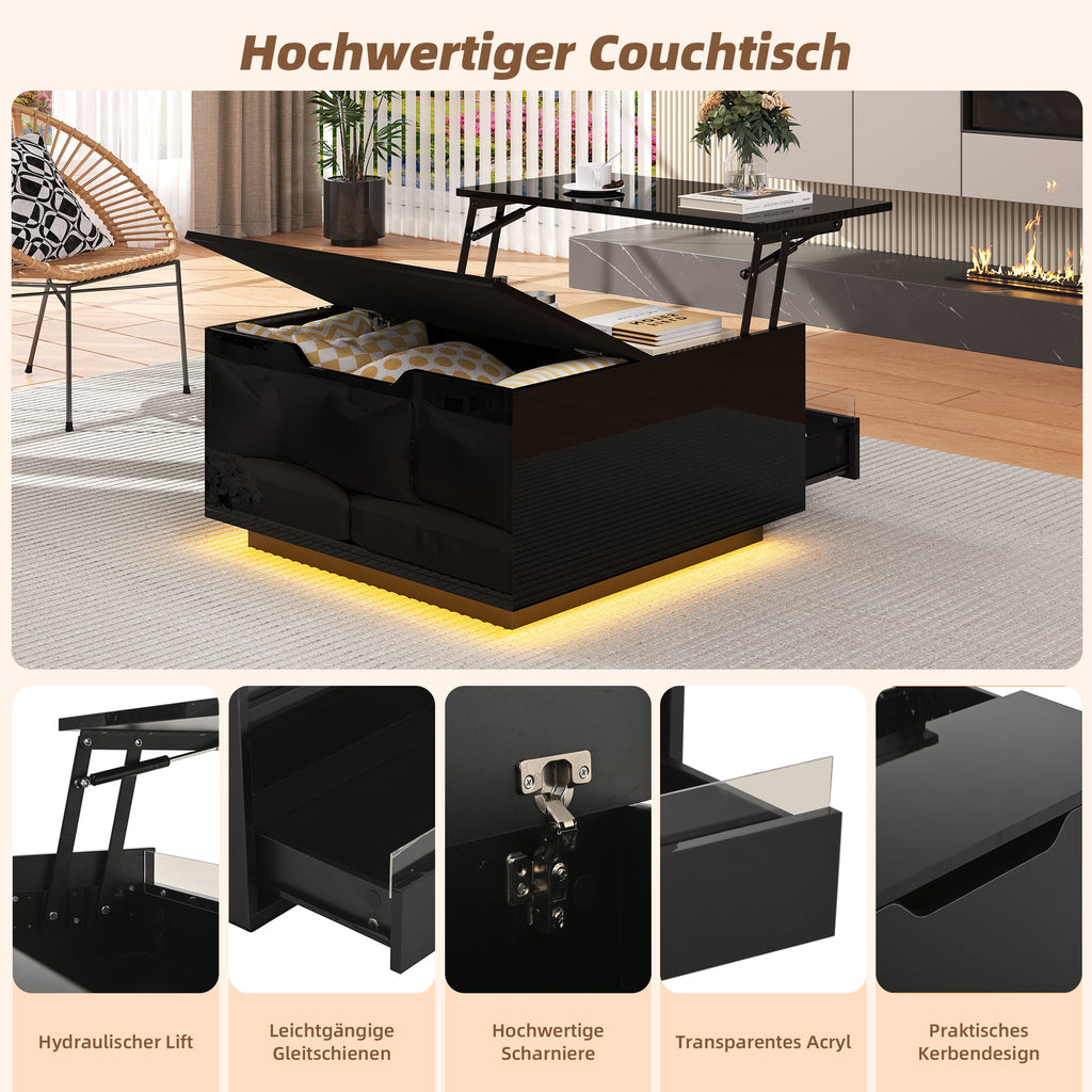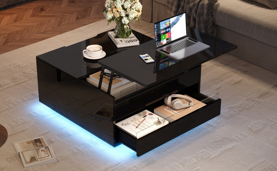Living Room Coffee Table, Liftable with LED Light Strip, 1 Drawer, Hidden Storage & Flip-Up Doors, High-Gloss Black