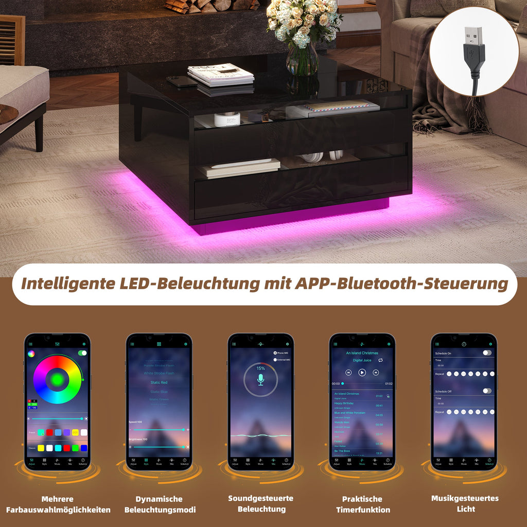 Elevate your living space with our modern 70 x 70 x 38 cm square coffee table. This versatile piece features a unique two-part desktop: one section offers a convenient lifting tabletop that extends to approximately 53 cm, perfect for dining or working, while the other provides a foldable desktop with ample hidden storage. Crafted with a high-gloss finish (limited to the top and surrounding edge) and a convenient drawer, this coffee table combines style and functionality. All transparent elements are made from durable acrylic, enhanced by an acrylic perspective design and an LED light strip controllable via a mobile app, creating a vibrant ambiance. Constructed from high-quality particleboard, this coffee table boasts a recommended total load capacity of 30 kg.