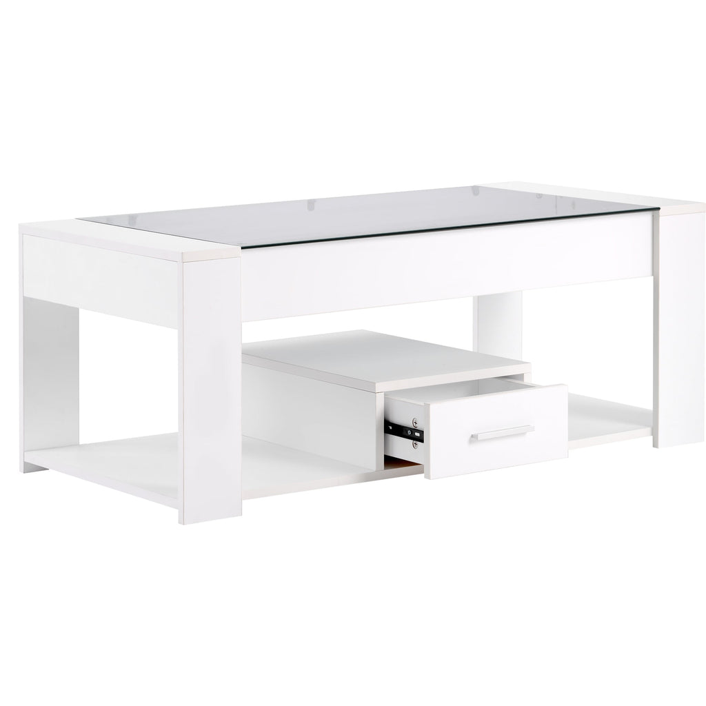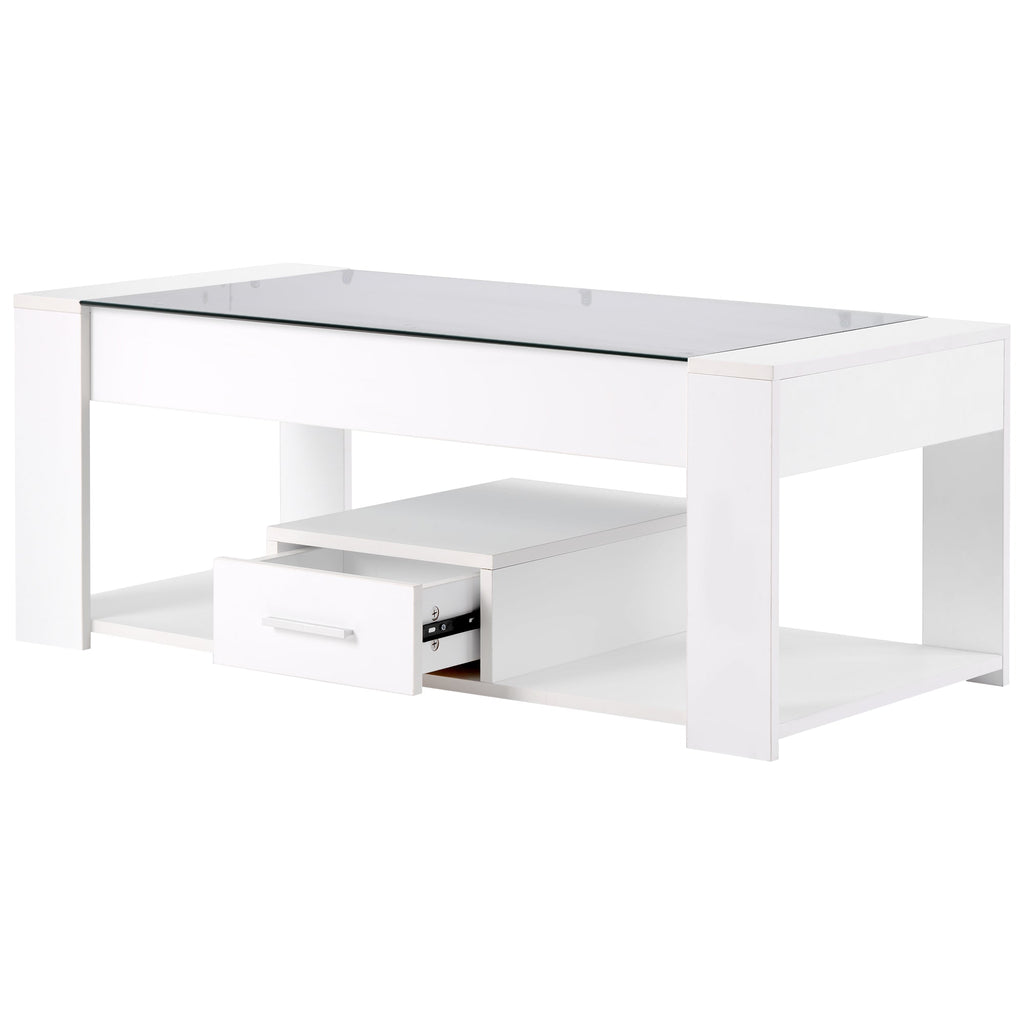 Living Room Coffee Table with Glass Top, Lockers, and Storage, White