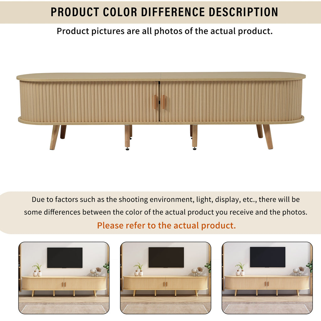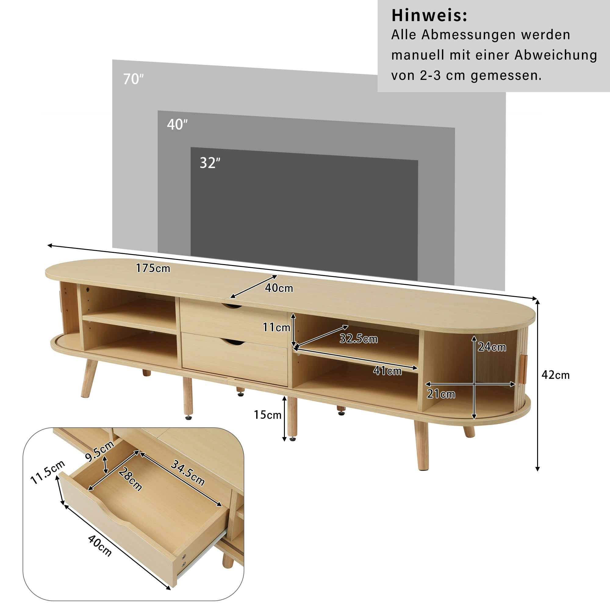 This light walnut TV cabinet, crafted from environmentally friendly MDF, features a delicate wood grain with a matte finish. Its unique oval design offers an artistic alternative to traditional square cabinets, enhancing modern home aesthetics. The central double drawer, combined with vertical, embossed sliding doors on both sides, provides versatile open and closed storage for audiovisual equipment, books, and decorative items. The curved sliding doors conceal adjustable dividers for customized organization. Eight solid wood legs ensure stability, with the four middle legs being height-adjustable to accommodate various floor conditions. With a robust load capacity of 30 kg, this cabinet supports most TV and audio equipment. Its compact size of 175 x 40 x 42 cm makes it ideal for small to medium-sized apartments.