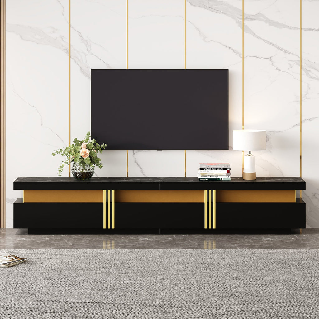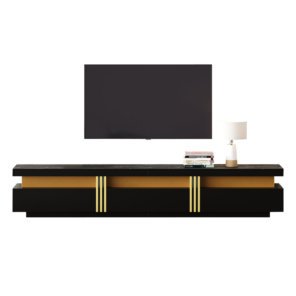This elegant TV cabinet measures 200 cm long, 40 cm wide, and 42 cm high, making it ideal for large TVs up to 90 inches. The marble-effect tabletop adds a luxurious touch and offers a sturdy storage surface with a weight capacity of up to 30 kg.