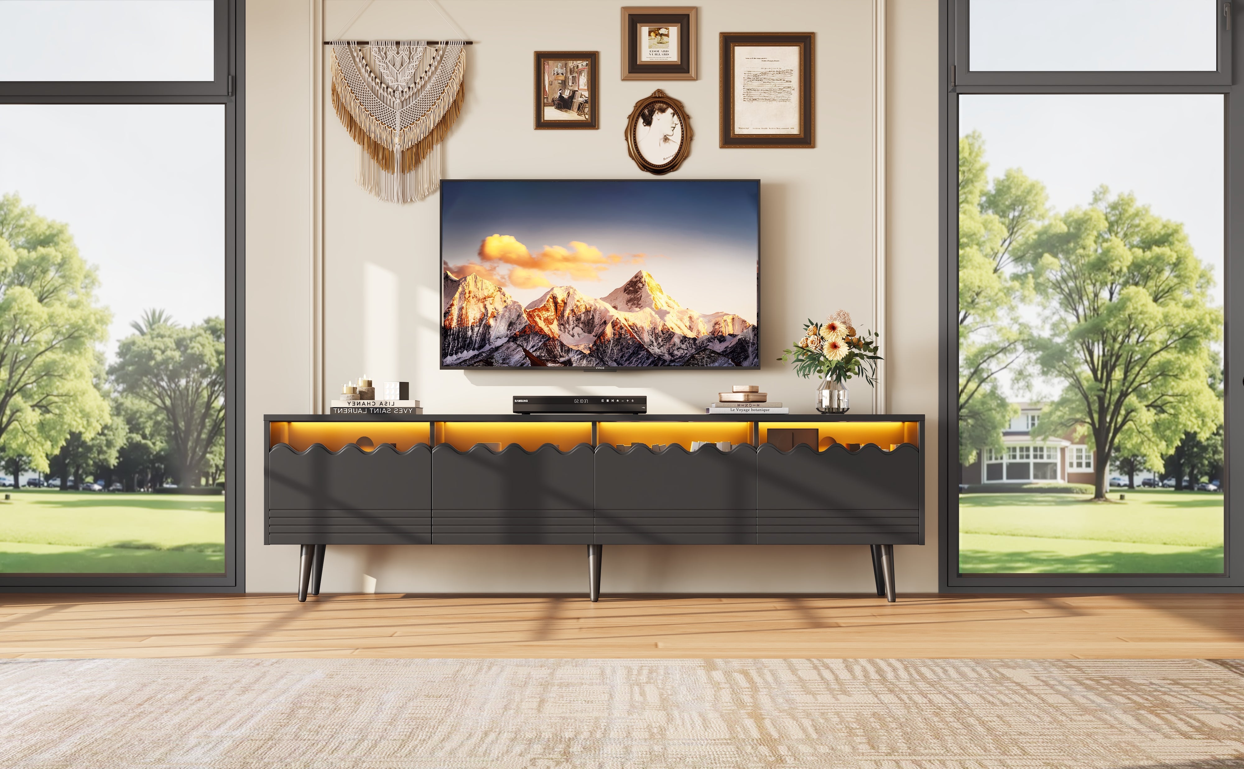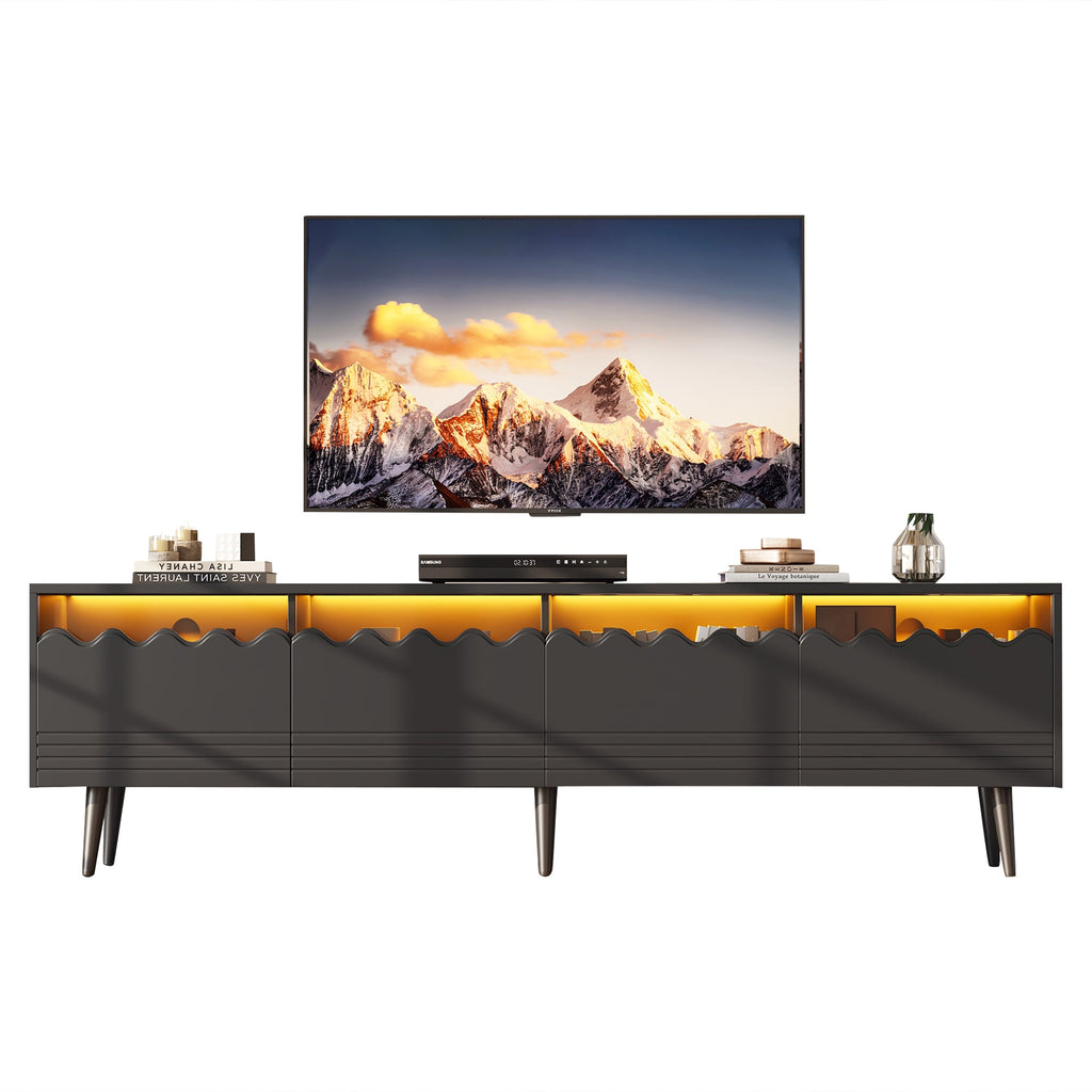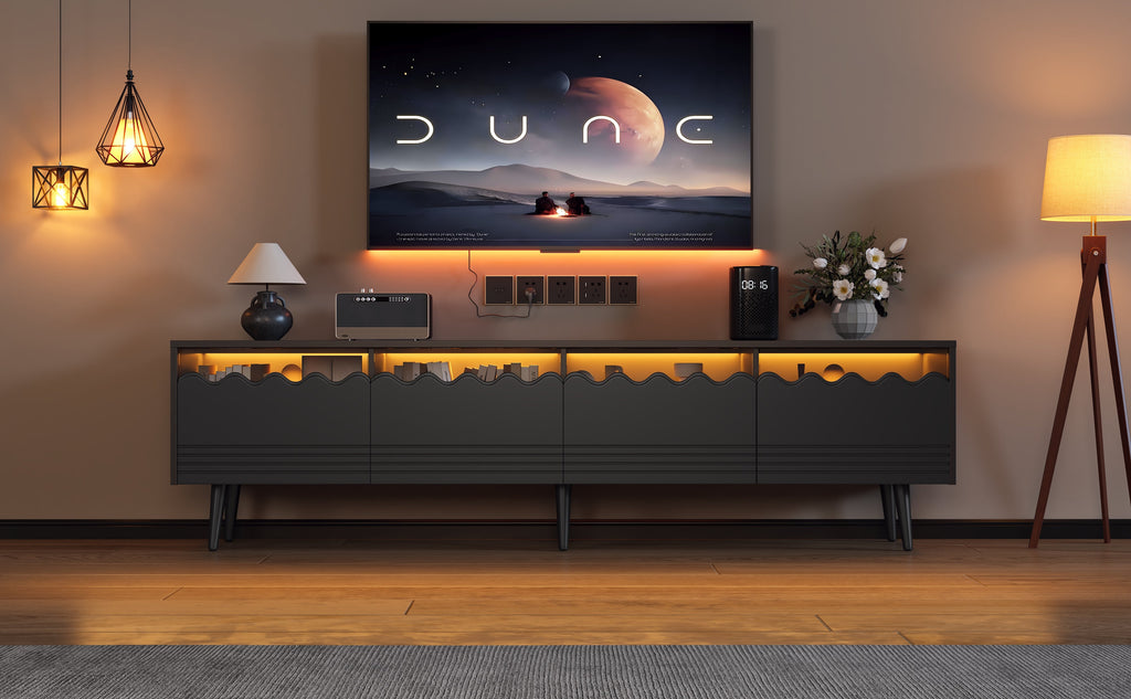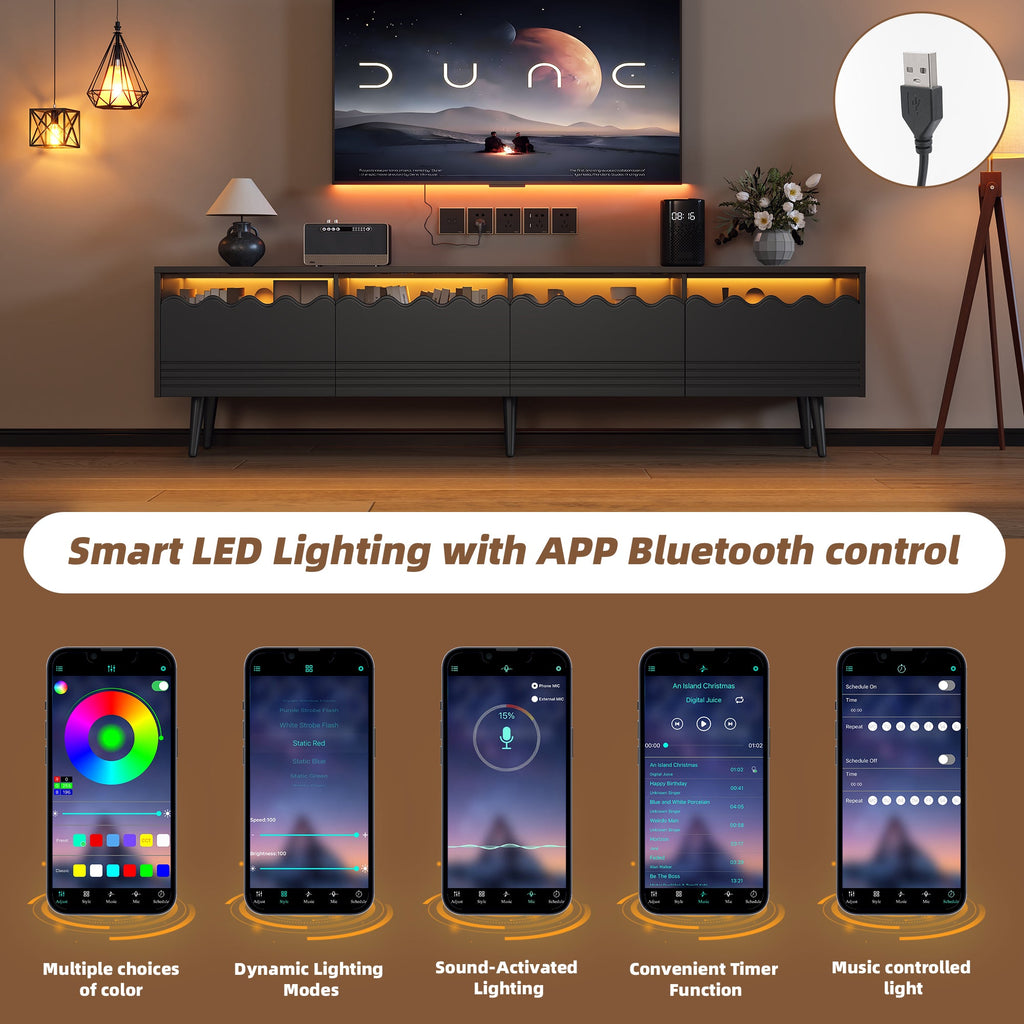 An app-controllable LED light strip creates ambiance with the help of tempered glass. The rebounder drawer is both practical and beautiful. The six legs can stably support 40 kg. The all-black cabinet, glass, and variable lighting effect are suitable for a variety of home decors.