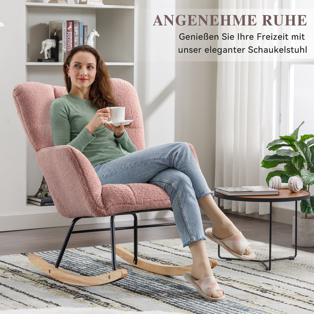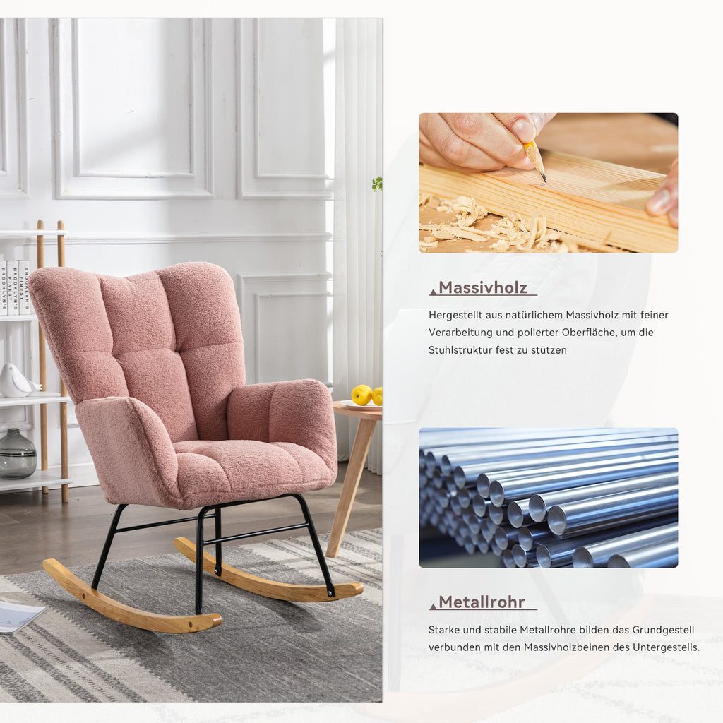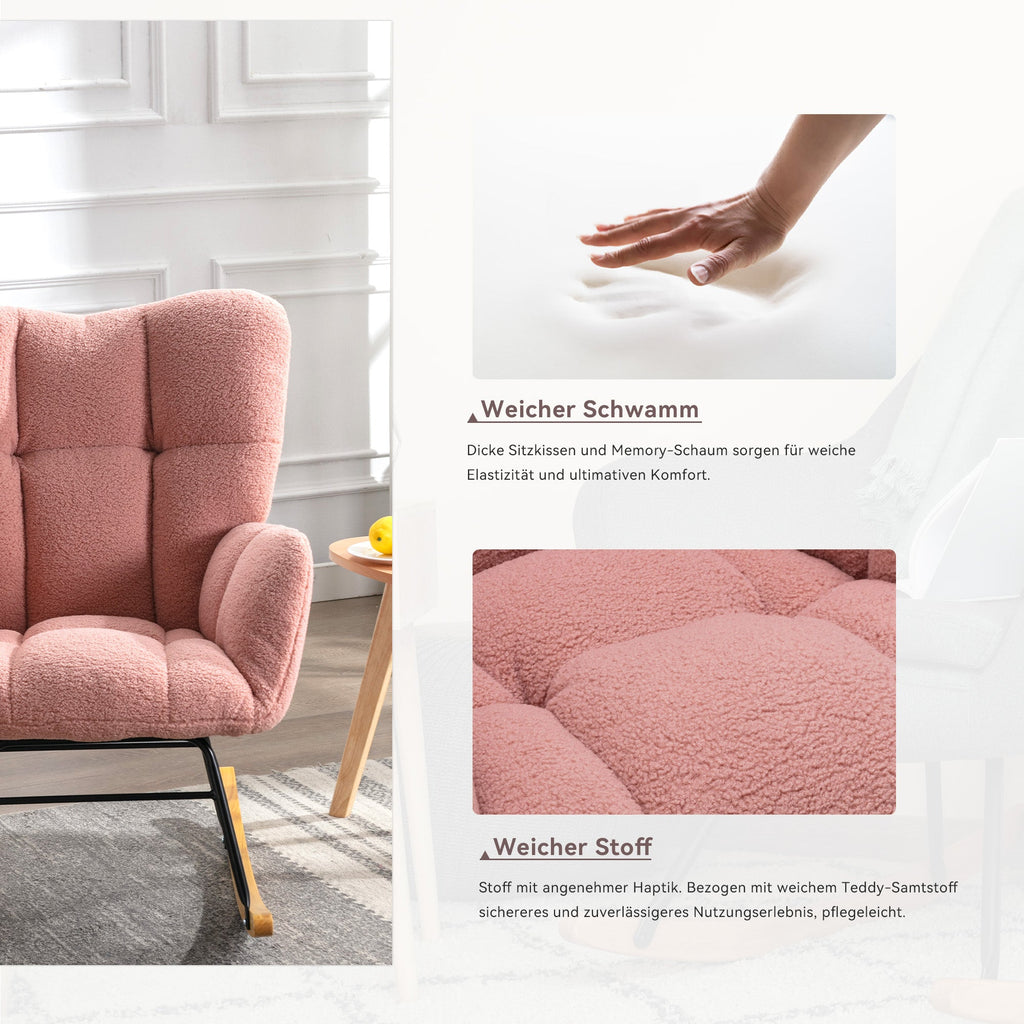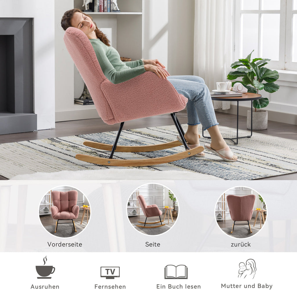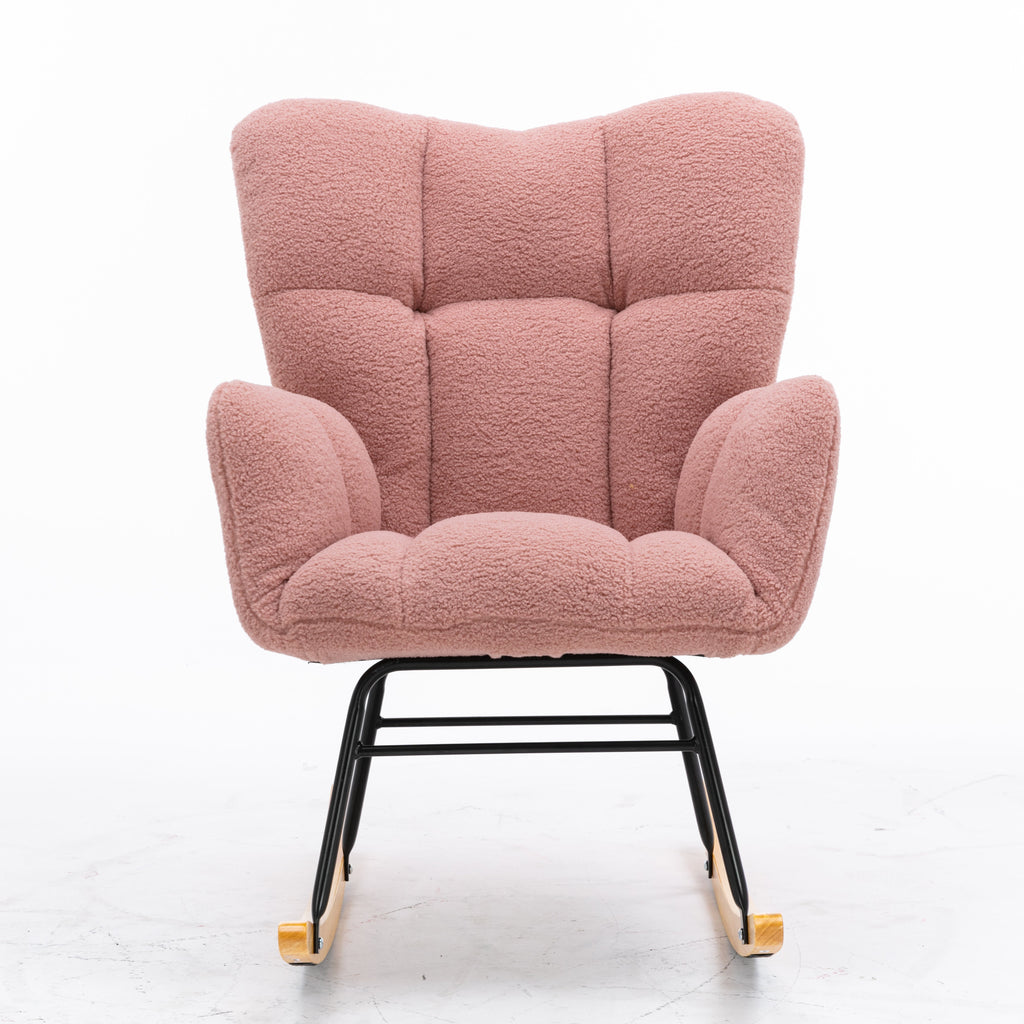 Mid Century Modern Rocking Chair, Tufted Teddy Fabric, Padded Seat, Pink