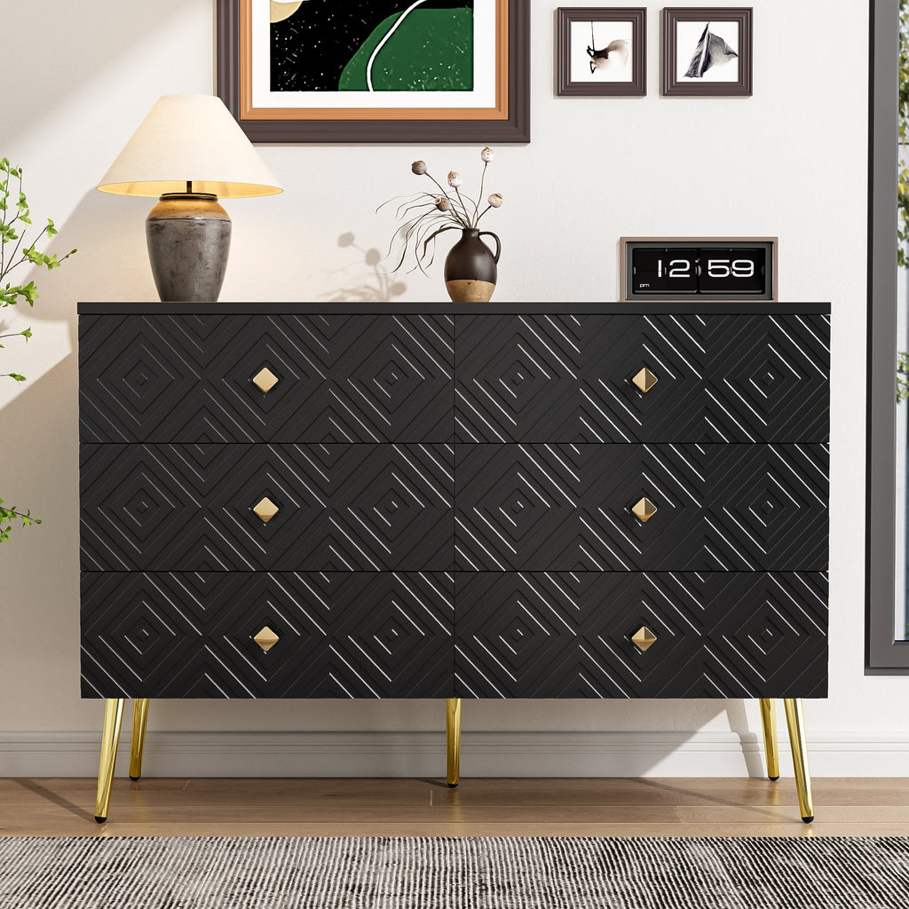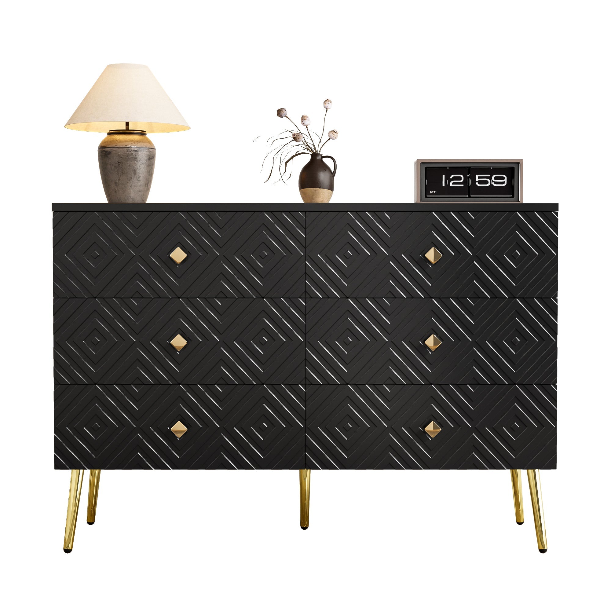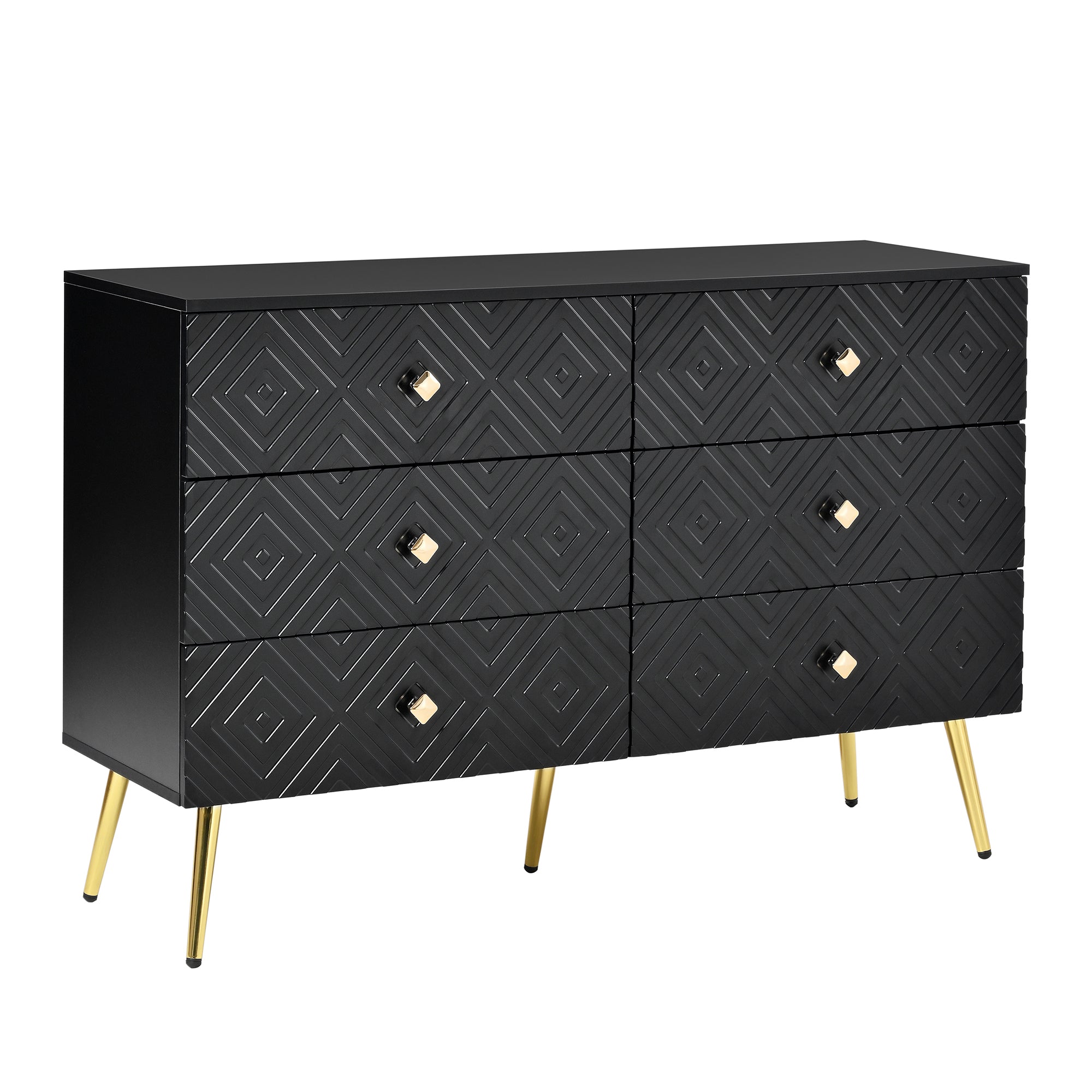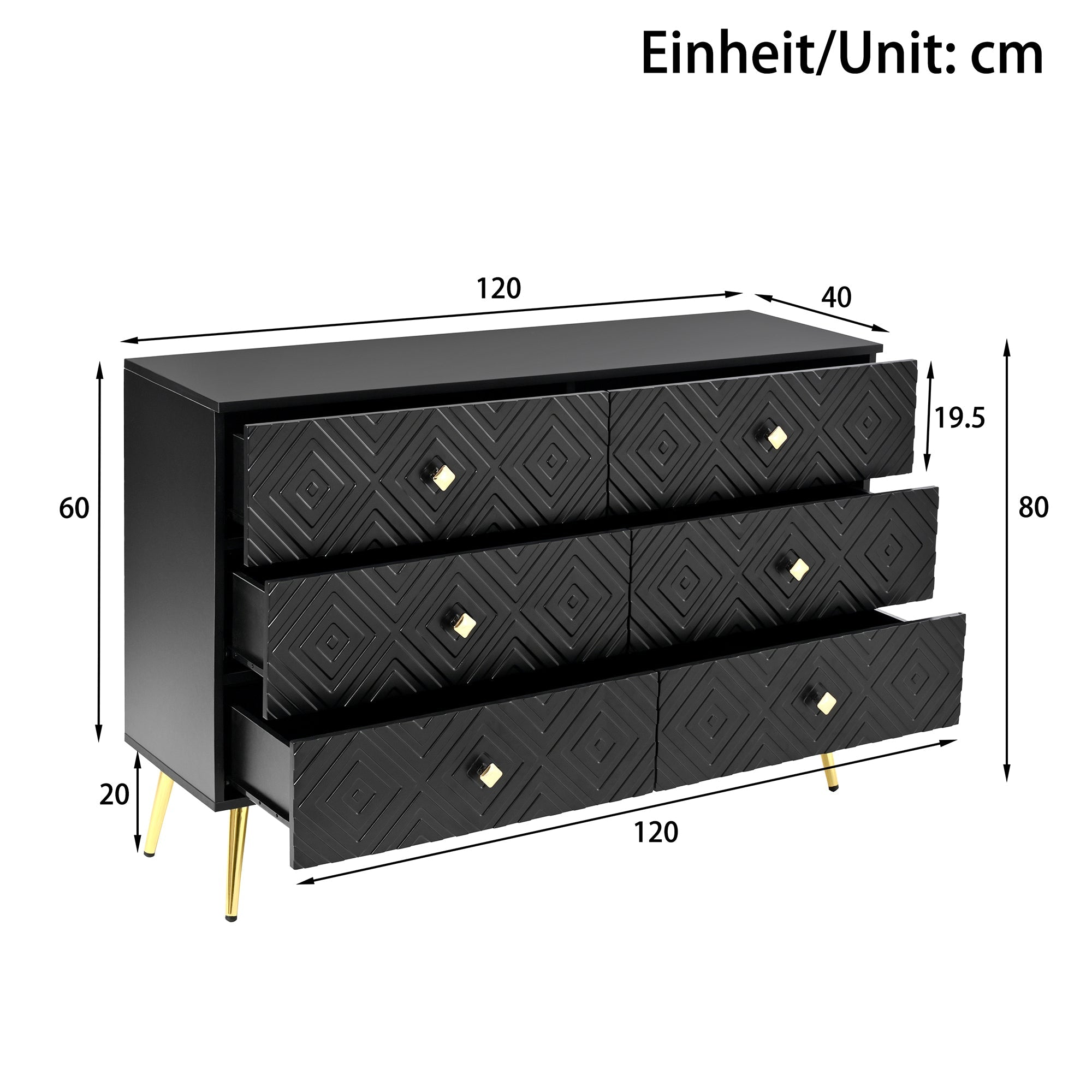 Modern 6-Drawer Chest, 120x40x80cm, Black with Gold Metal