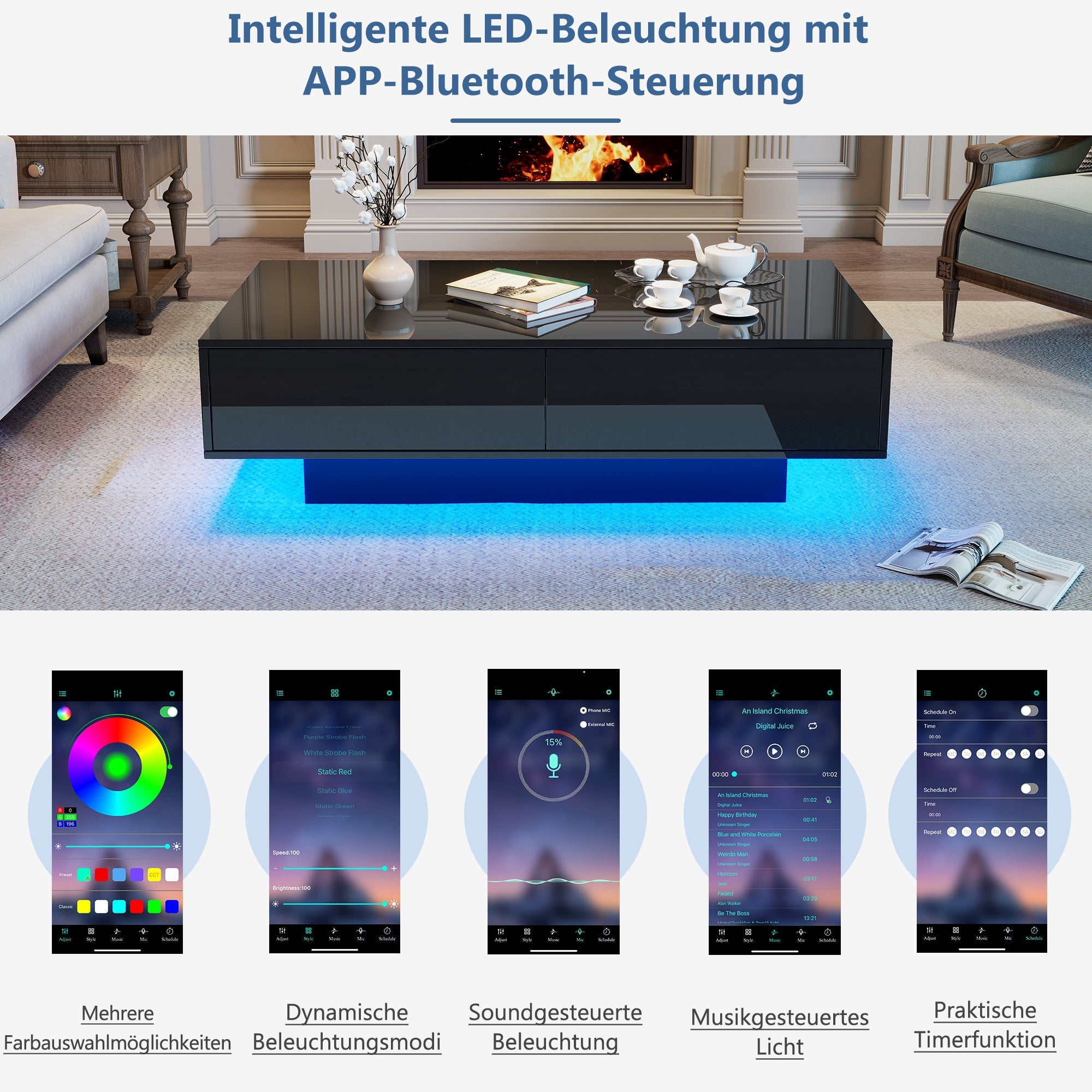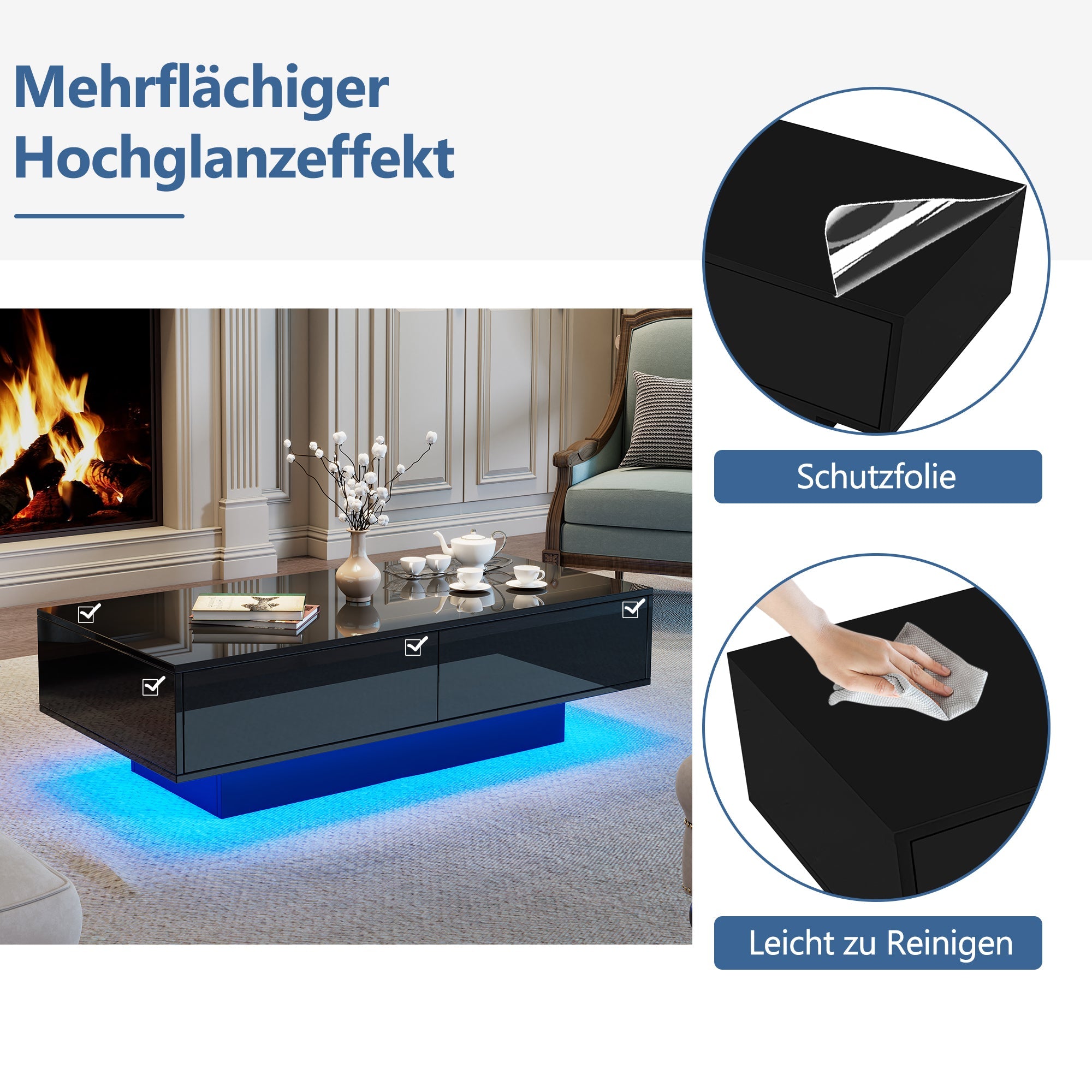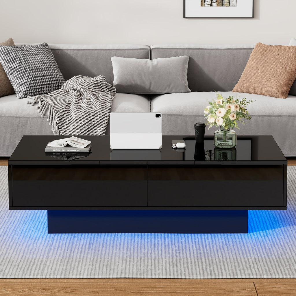 Modern Coffee Table, 115x55x34cm with 2 Drawers, LED Lighting, Black High-Gloss