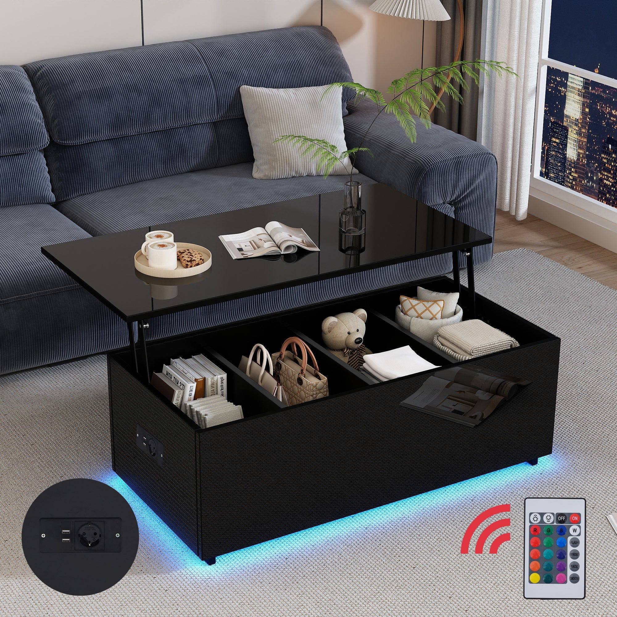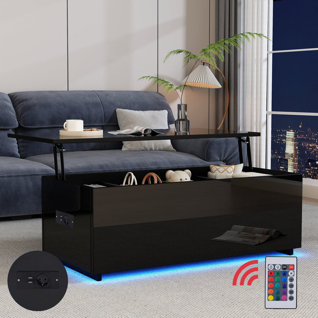 Modern Coffee Table with LED, Storage, and Lift, Black High-Gloss