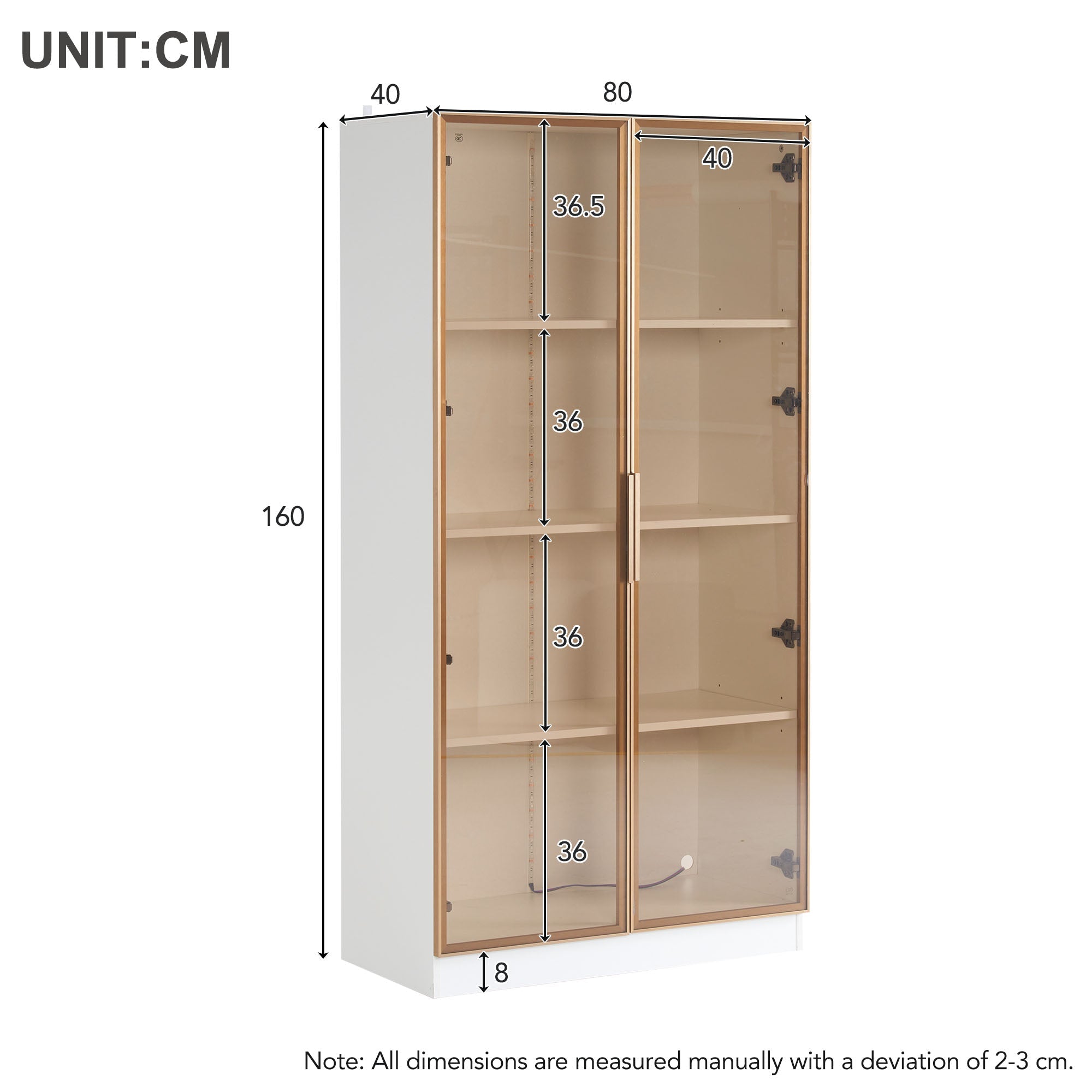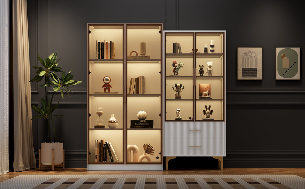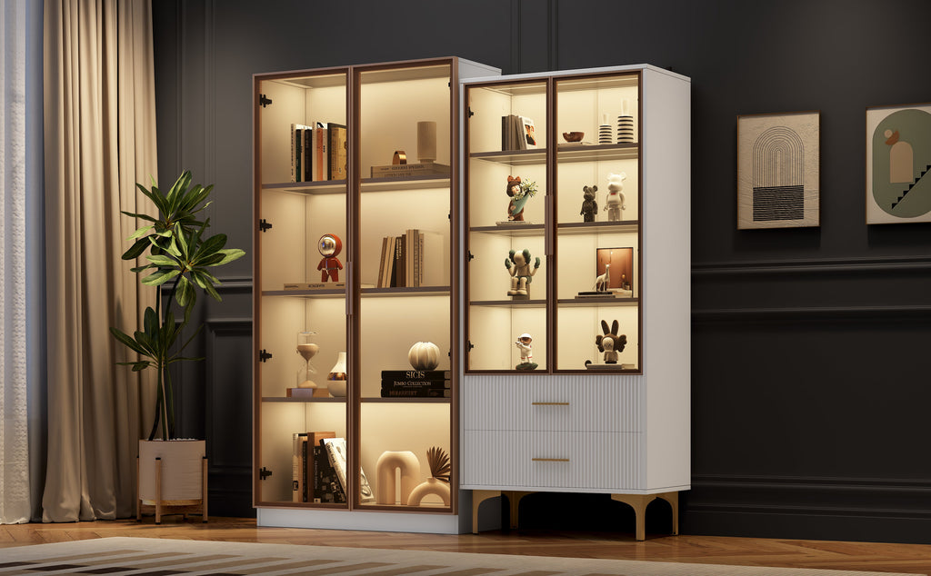 Modern Living Room Set: Two Glass Display Cabinets with LED Lighting, Adjustable Shelves, White Platinum Finish