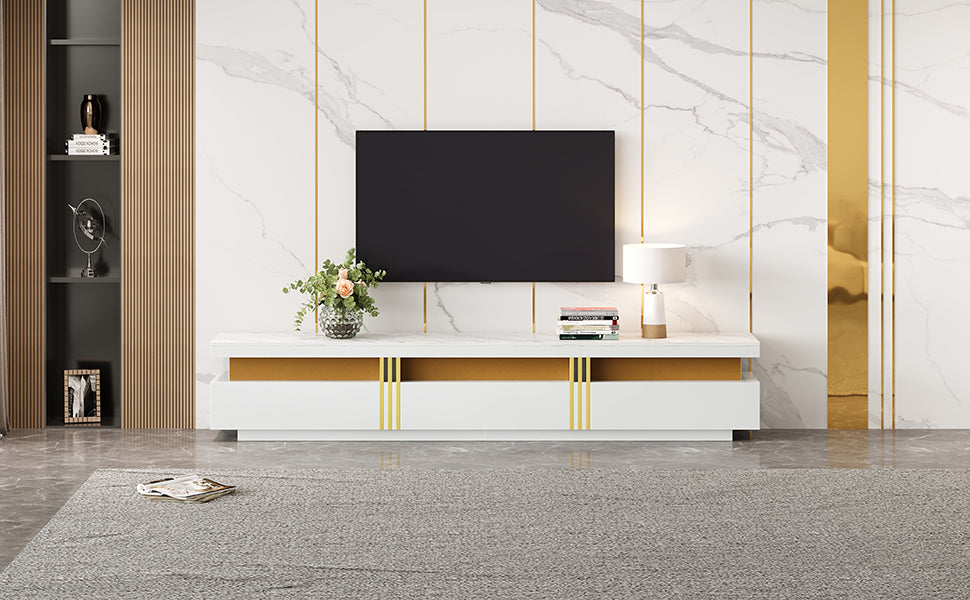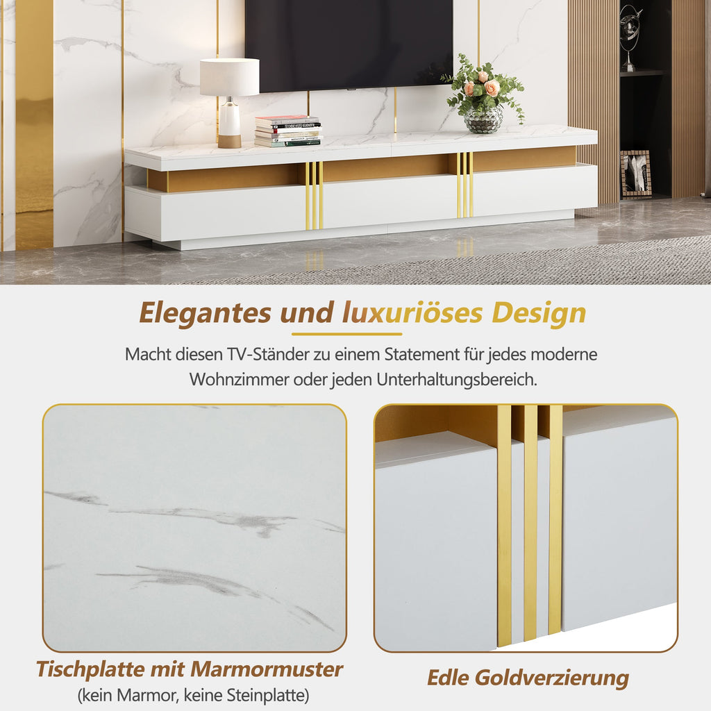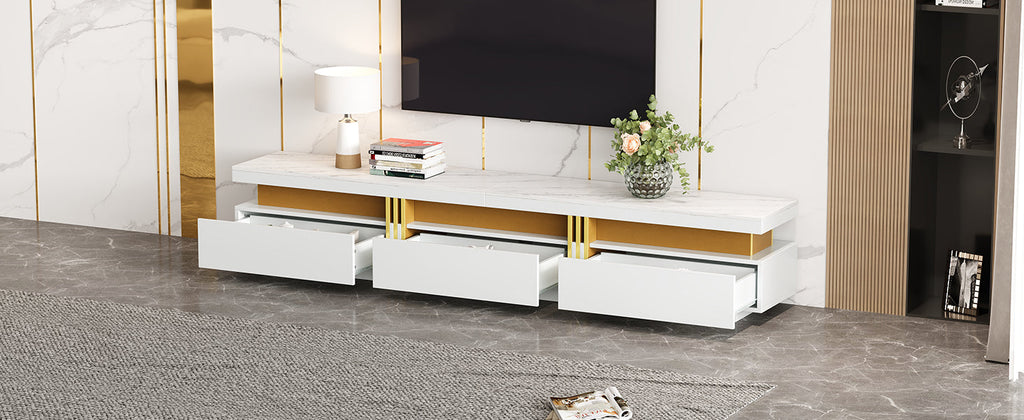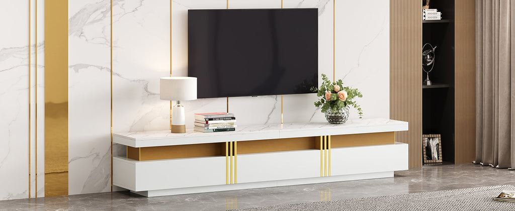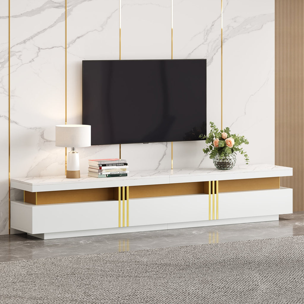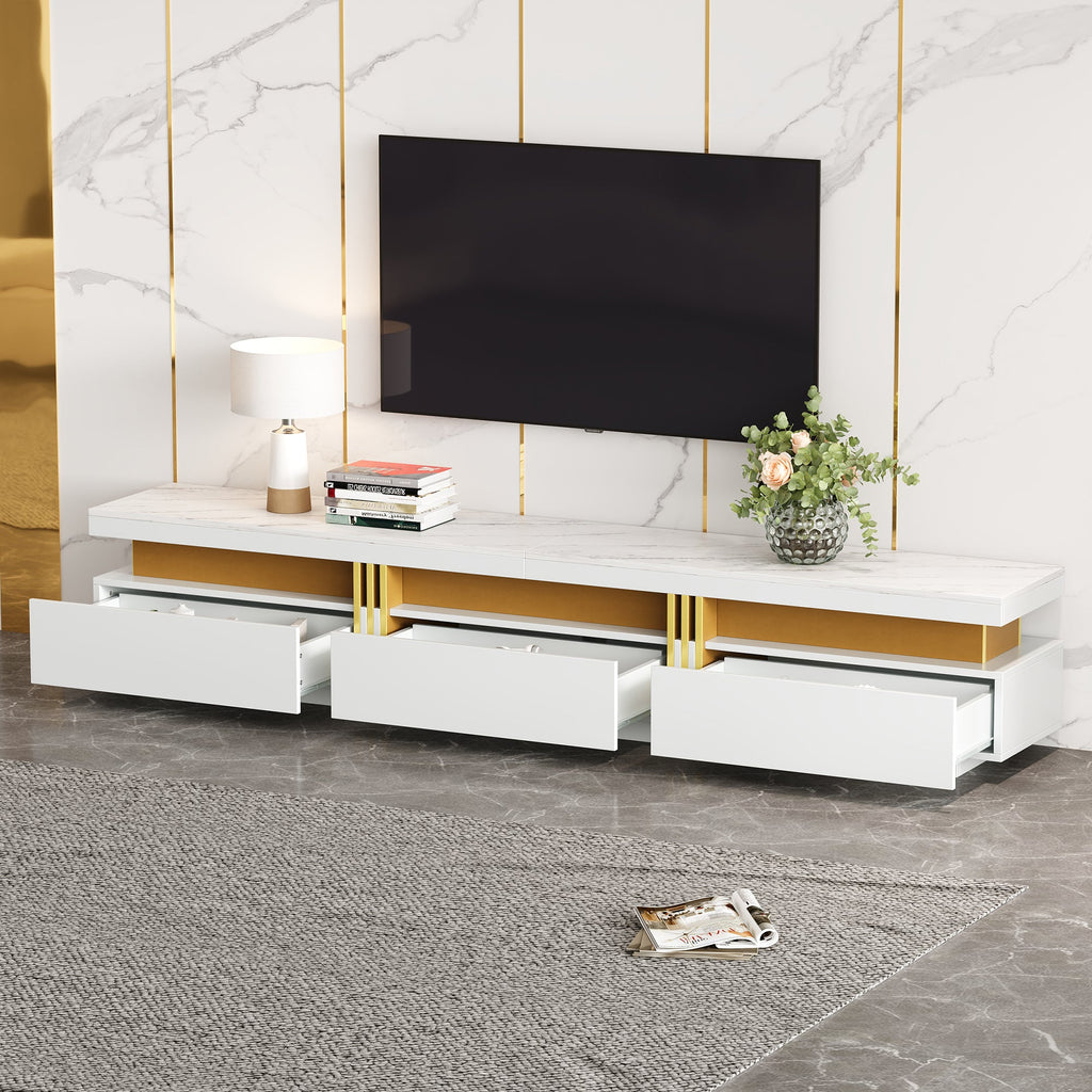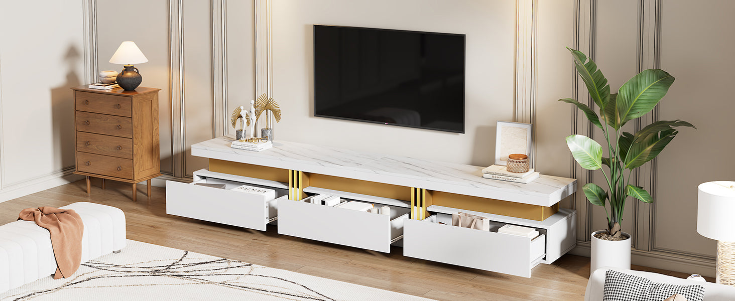 Modern Lowboard TV Cabinet, 90-inch TV, 3 Drawers, Cable Management, Marble Look