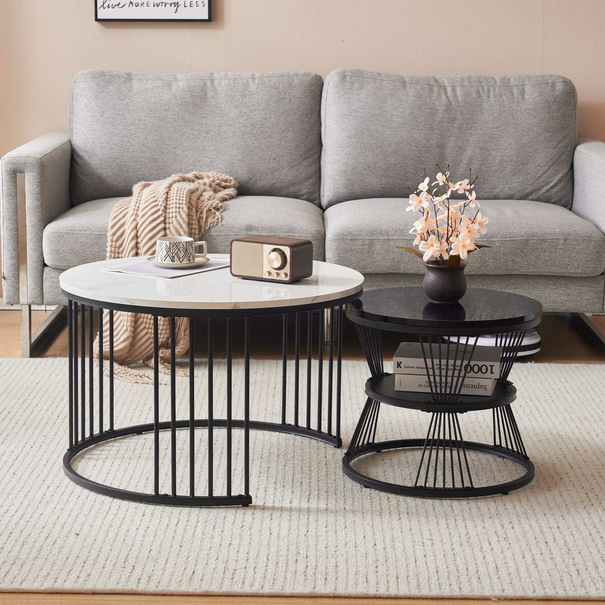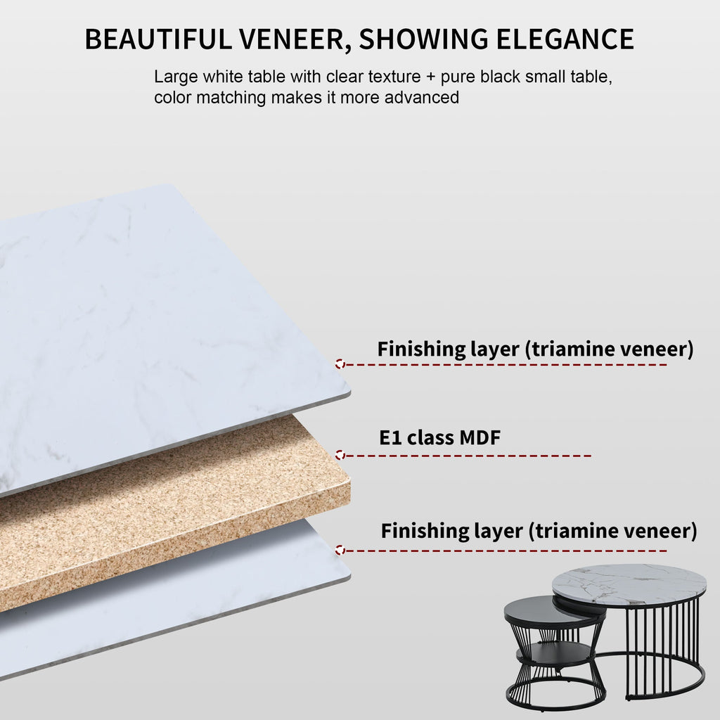 Modern Nesting Coffee Table Set, Round End Tables, Set of 2, Marble Veneer Black Frame