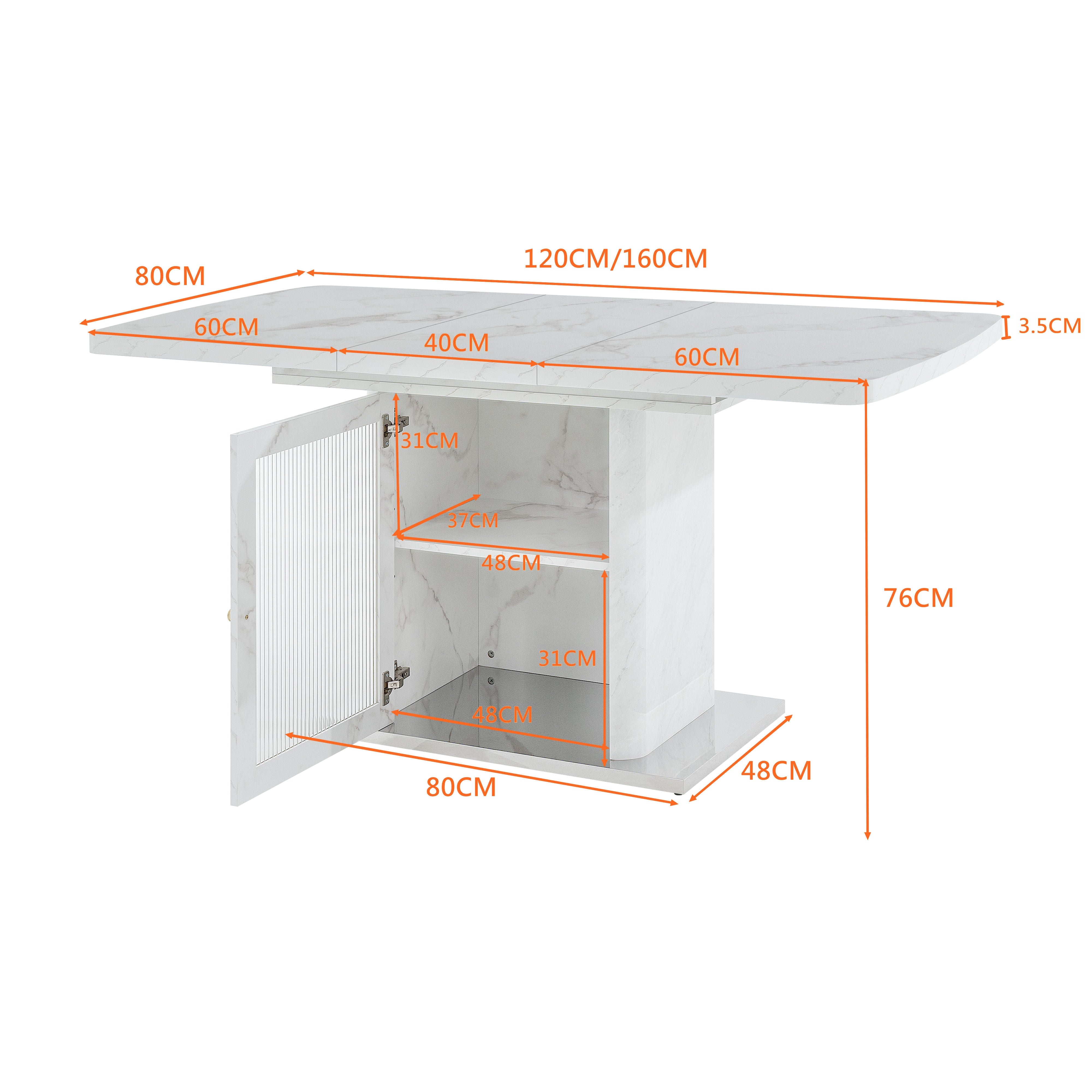 Modern Rectangle Dining Table 120-160cm Stretchable Storage Cabinet White Marble Top Metal Base