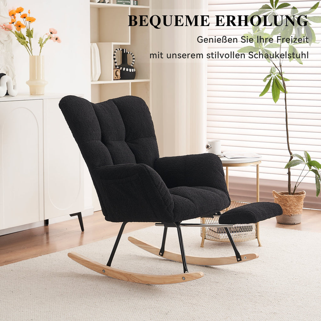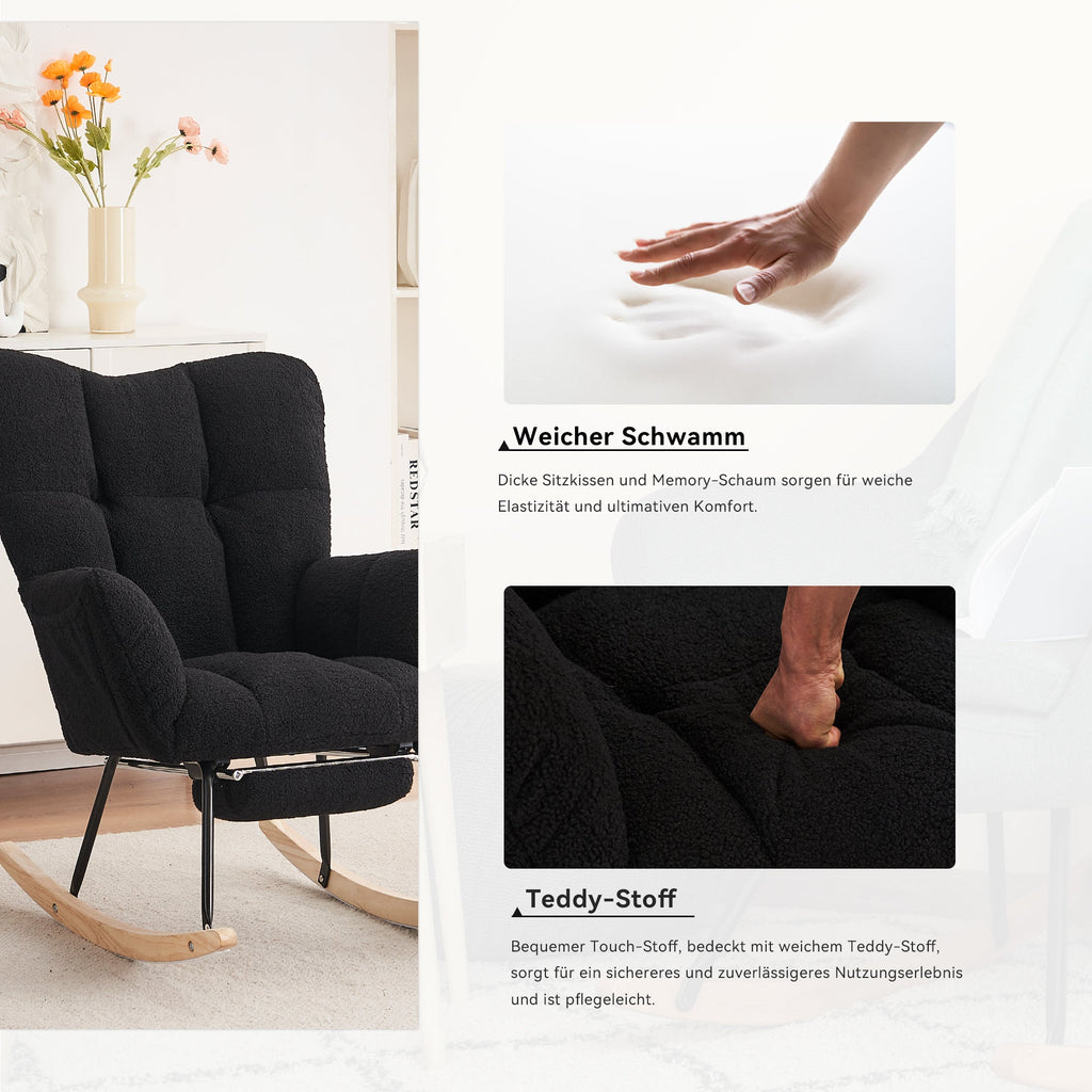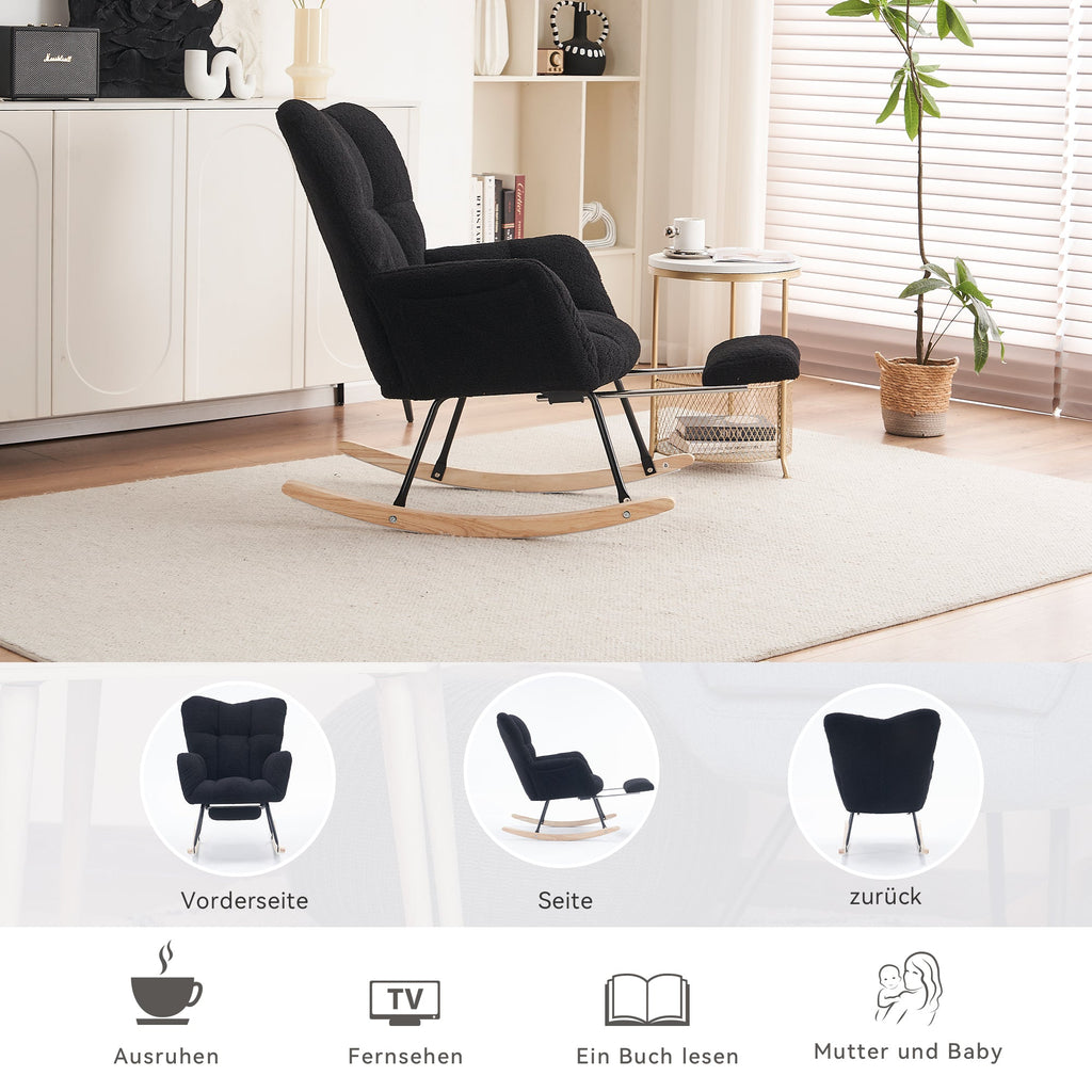 Modern Rocking Chair, Upholstered with Extendable Footrest, Black Teddy Taffeta