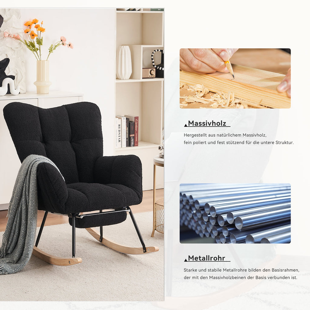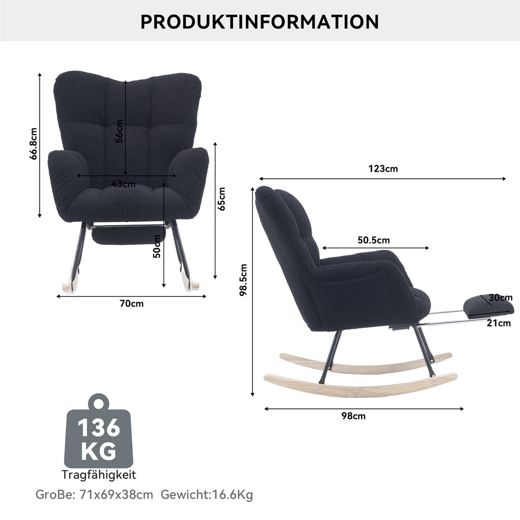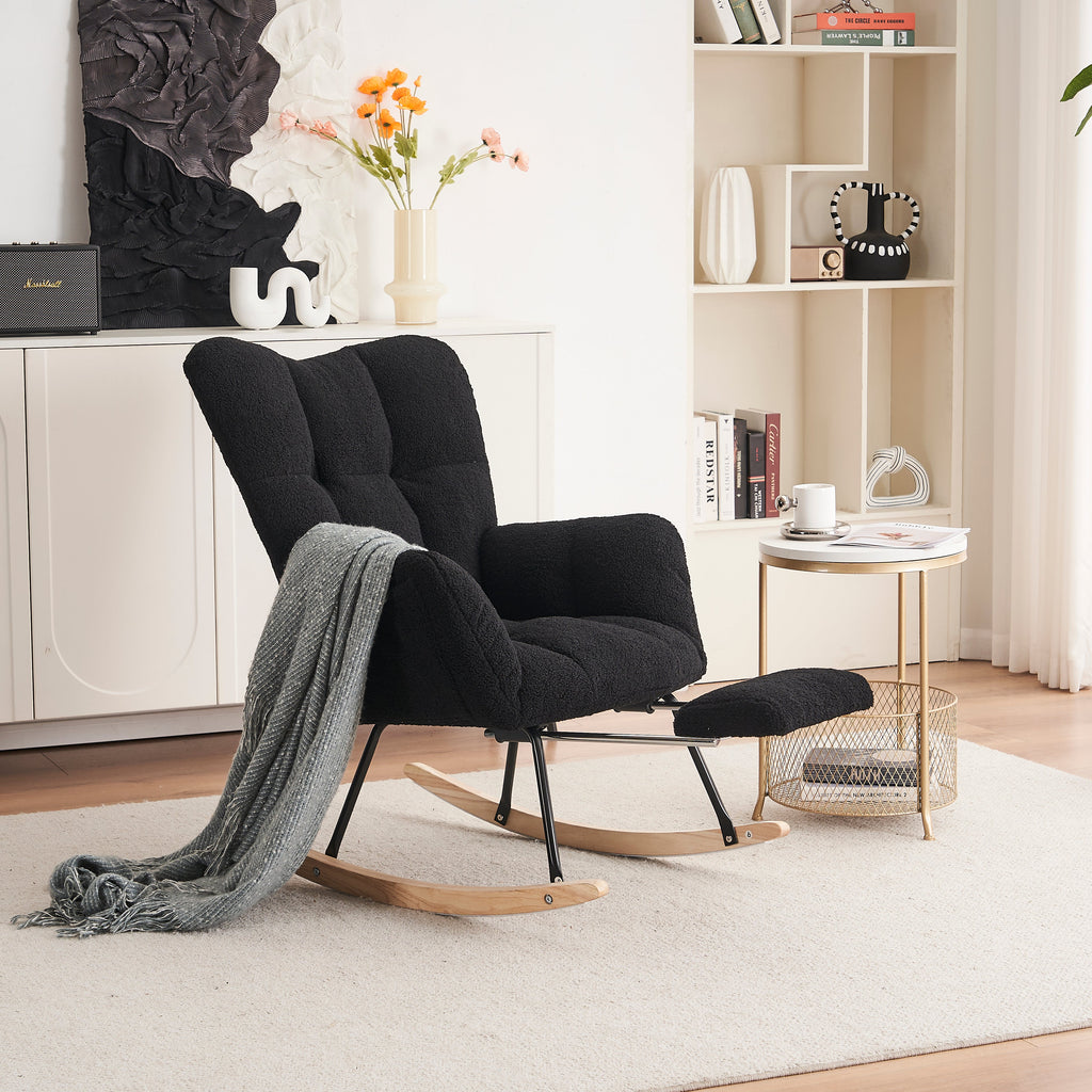 Modern Rocking Chair, Upholstered with Extendable Footrest, Black Teddy Taffeta