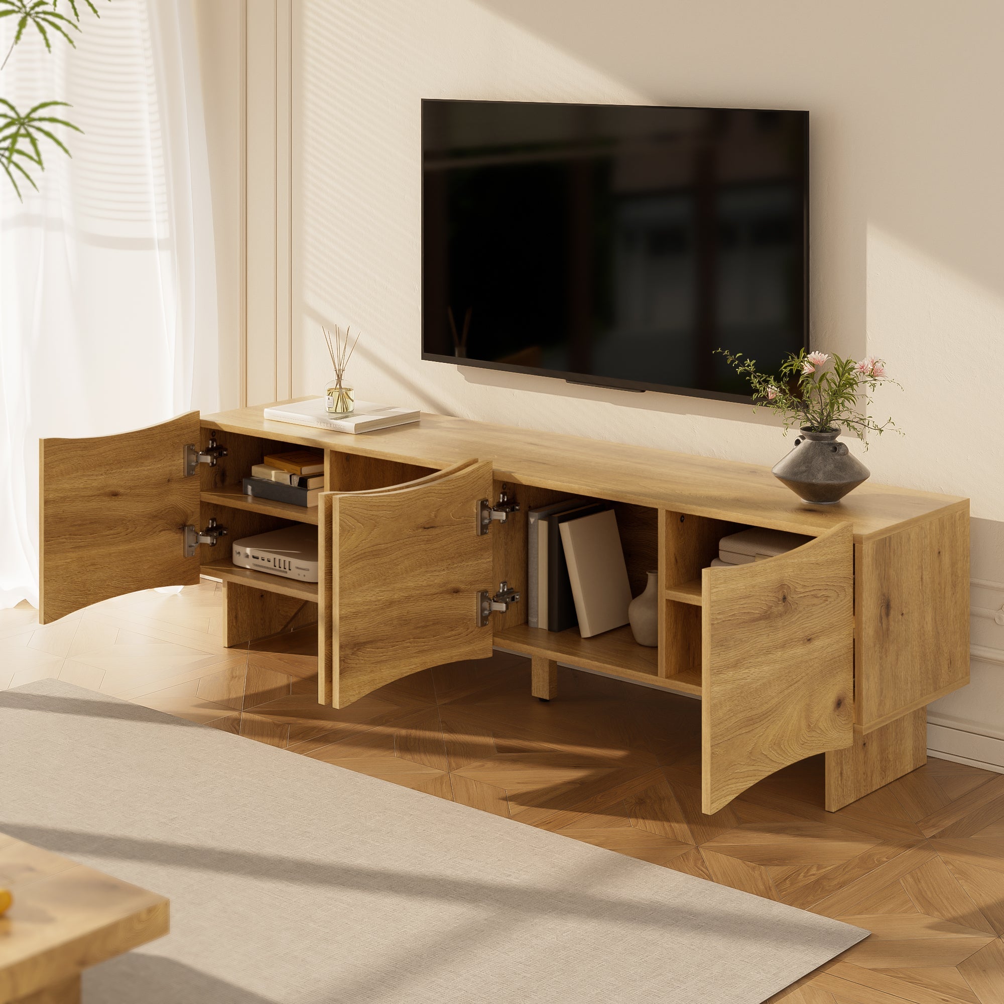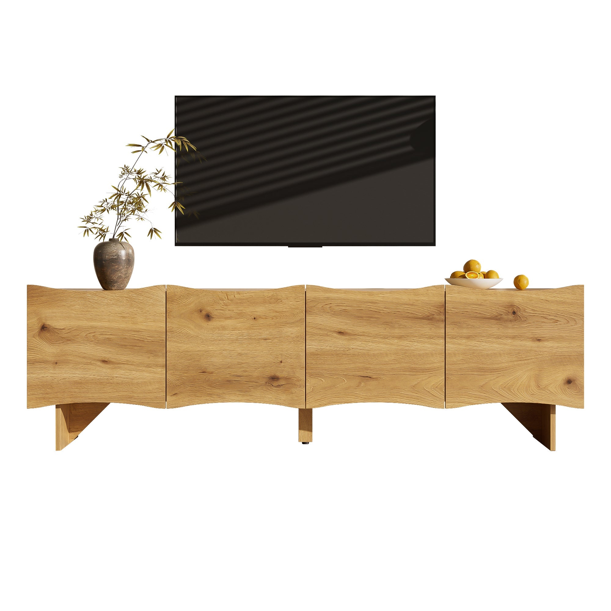 The wavy fronts of this cabinet serve as a decorative focal point, while the four doors provide ample storage space for your media devices, DVDs, books, and decorative items. A practical feature is the integrated cable management system: each of the four doors conceals a separate cable hole, allowing for neat routing and concealment of wires. This thoughtful design helps keep your living area tidy and clutter-free.