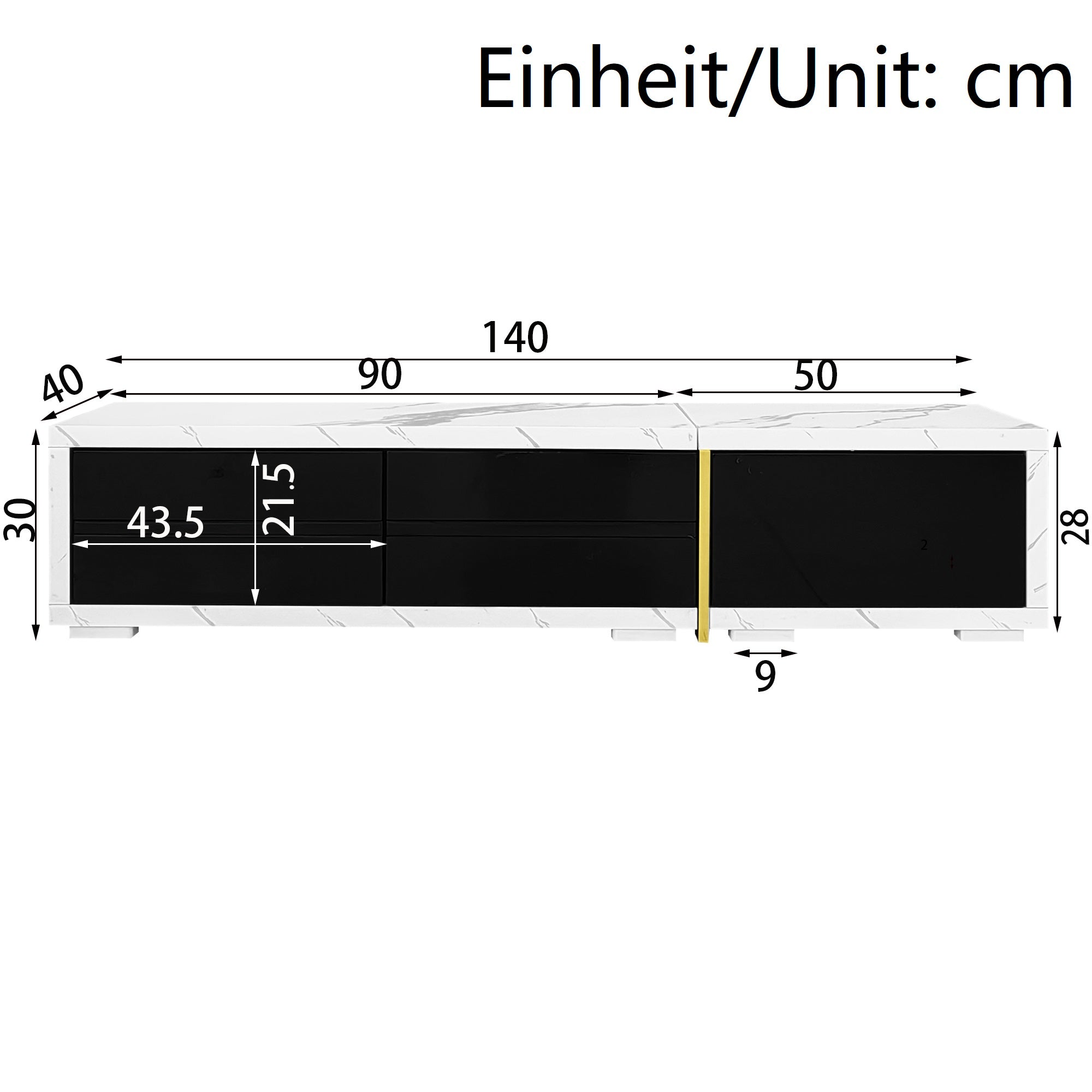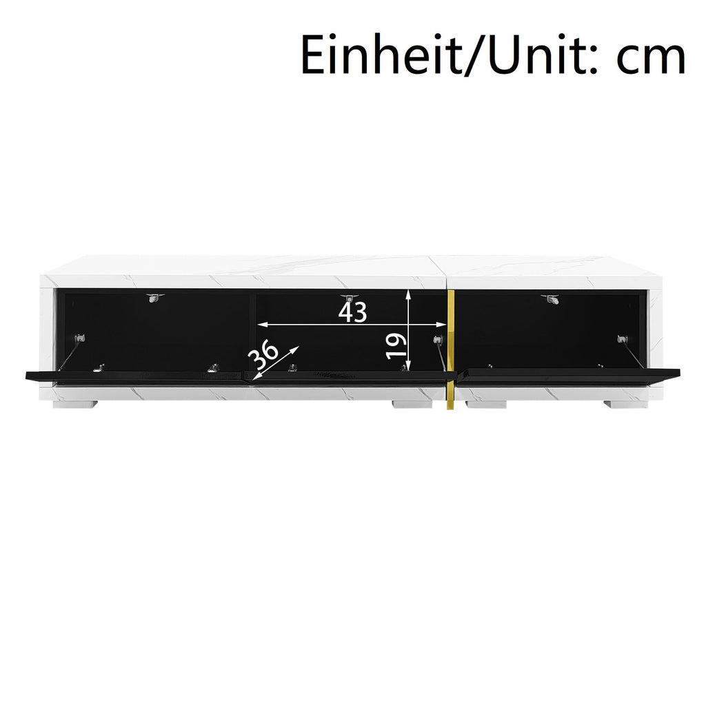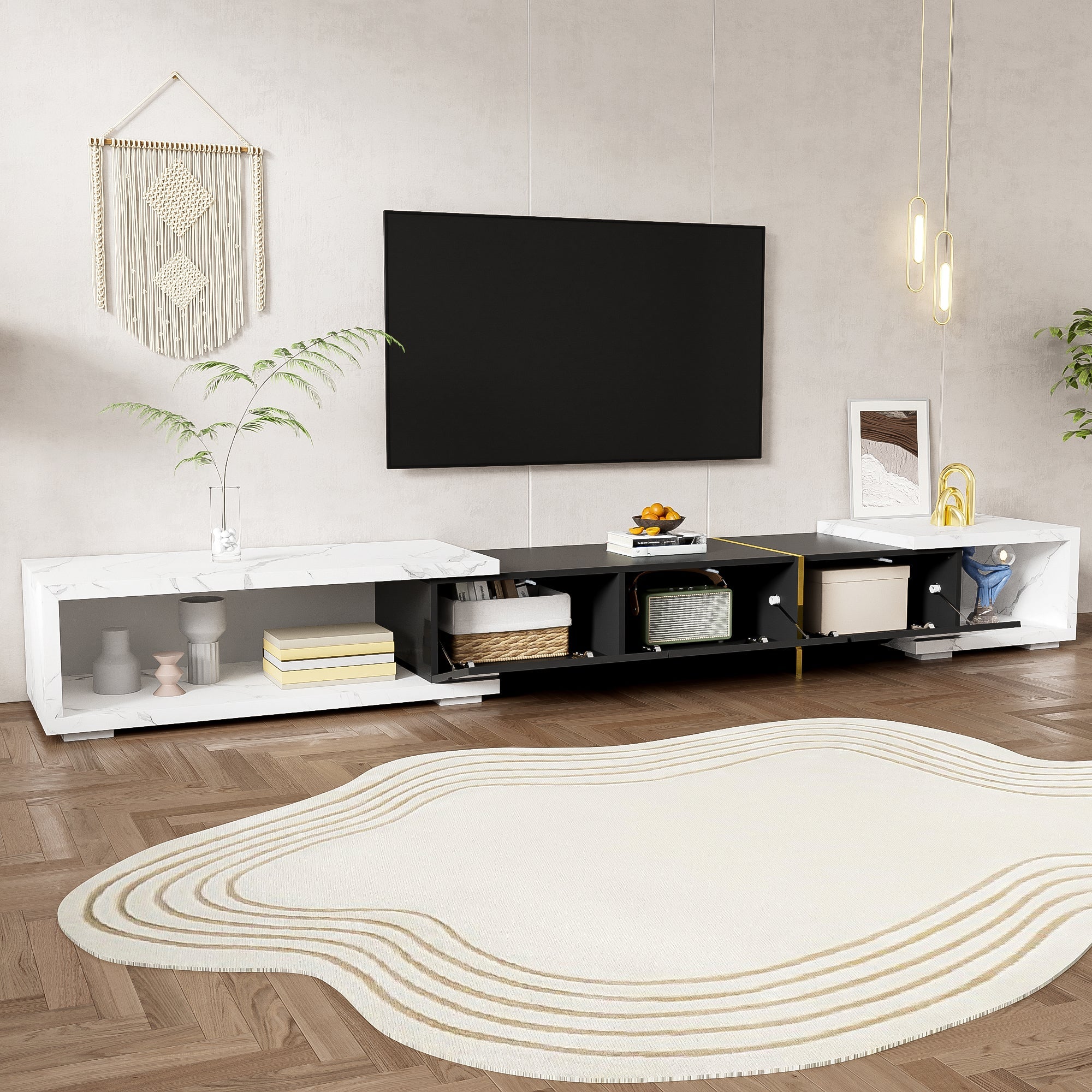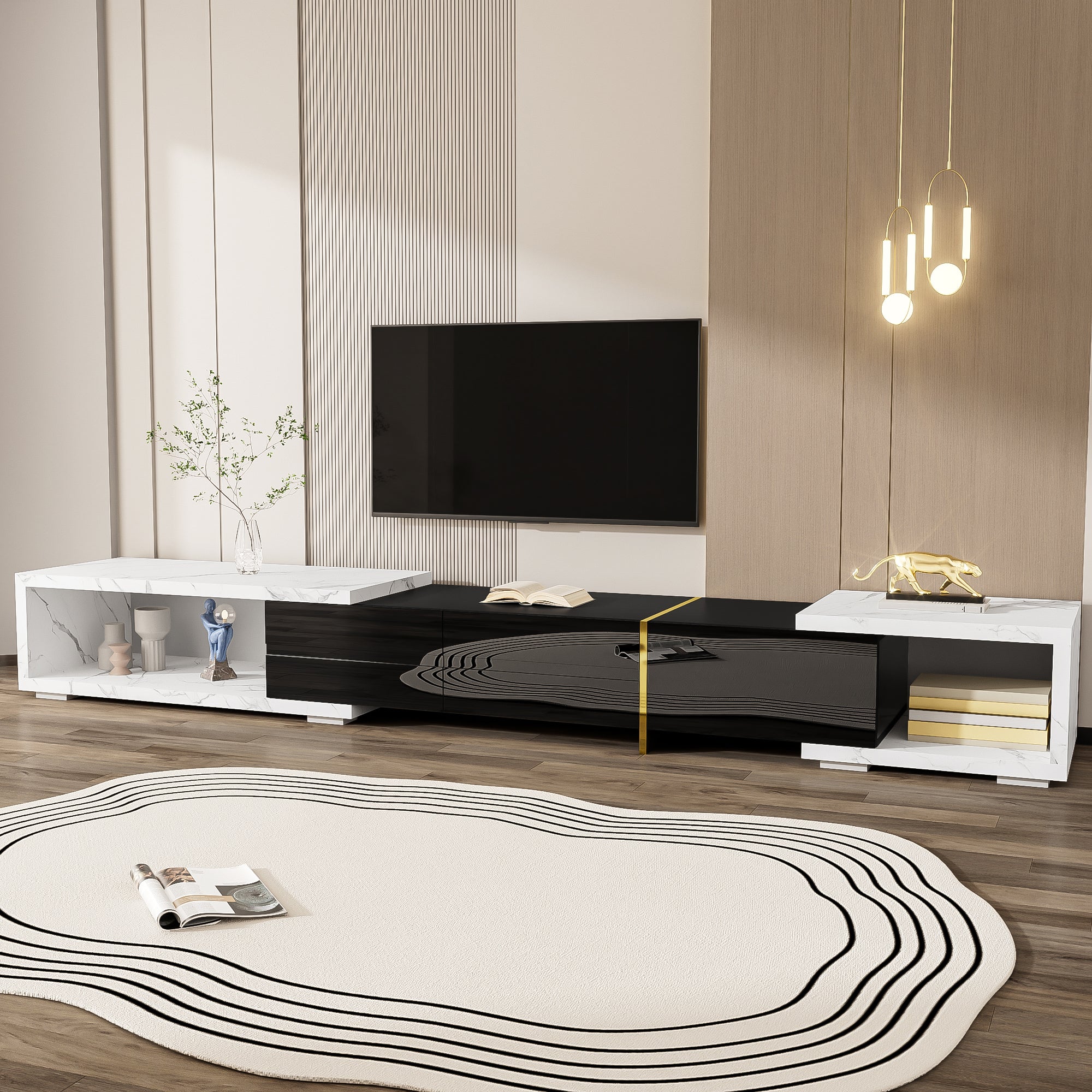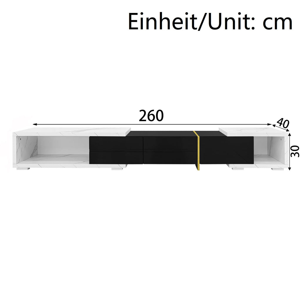 Modern TV Cabinet, Variable Length (140-260 cm) with Rotating Function, White Marble Look & Black High-Gloss Finish