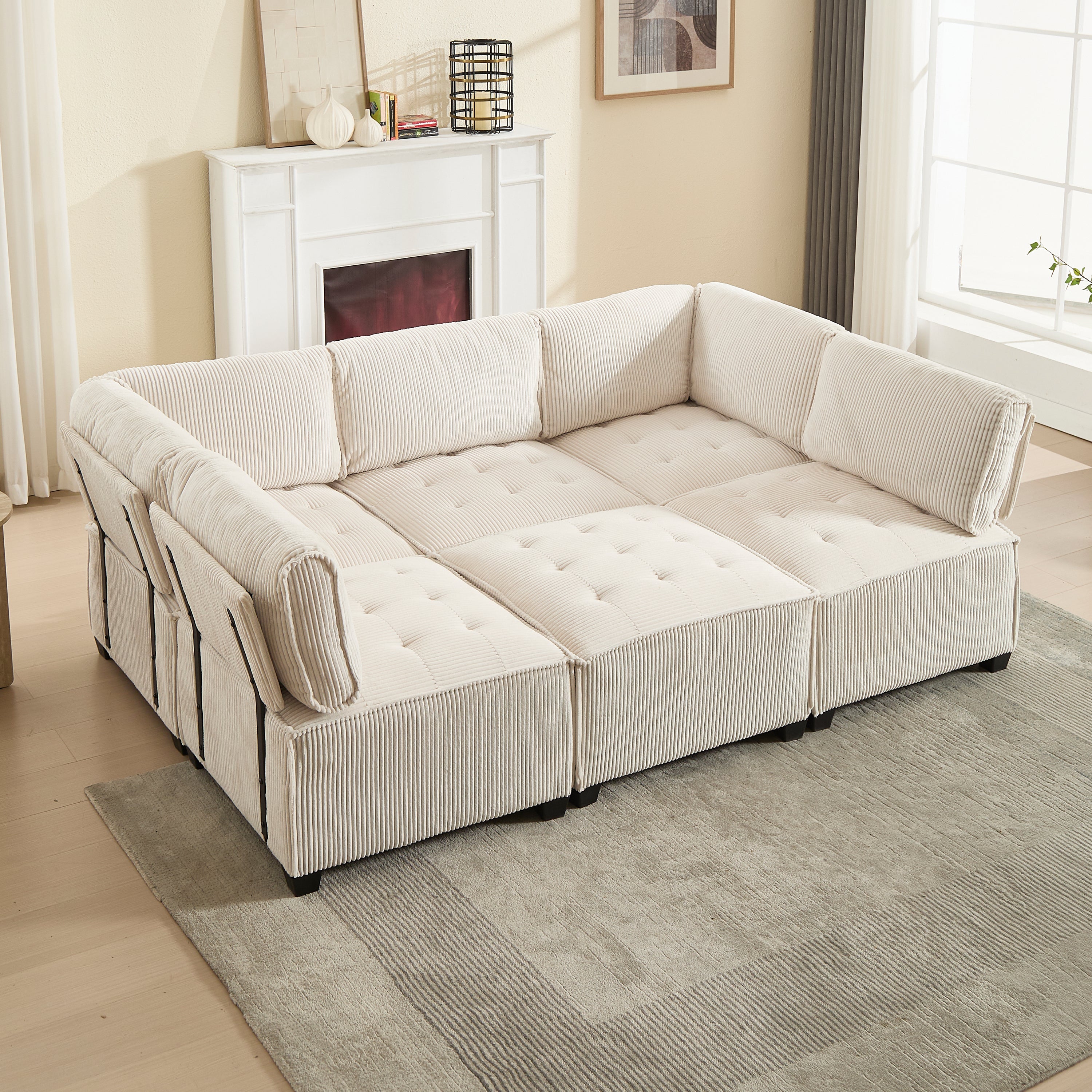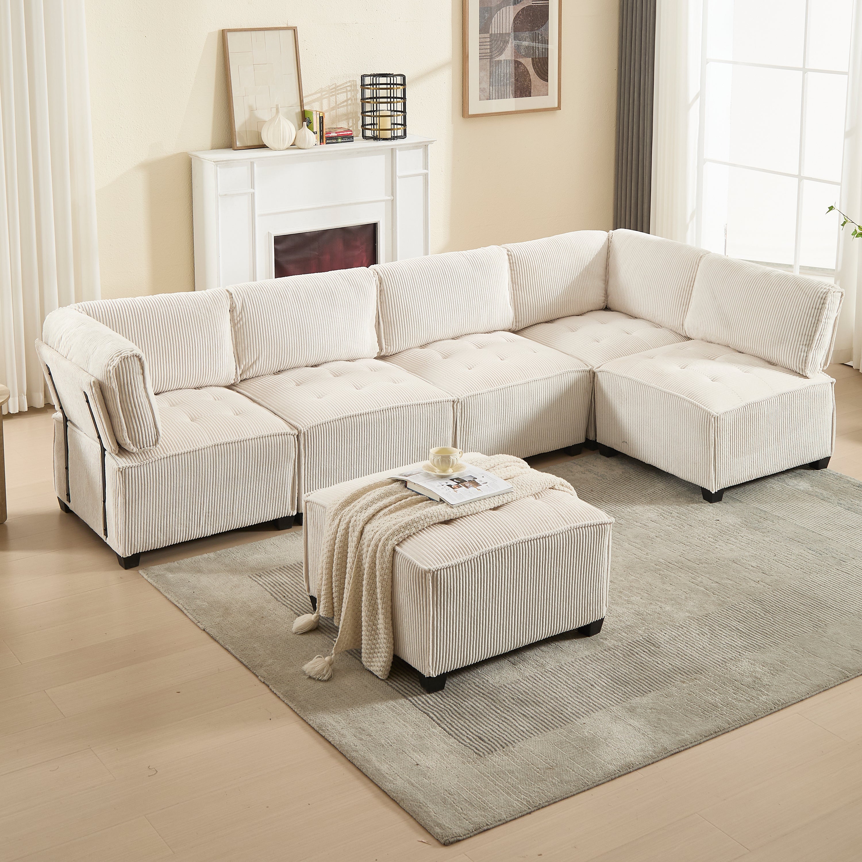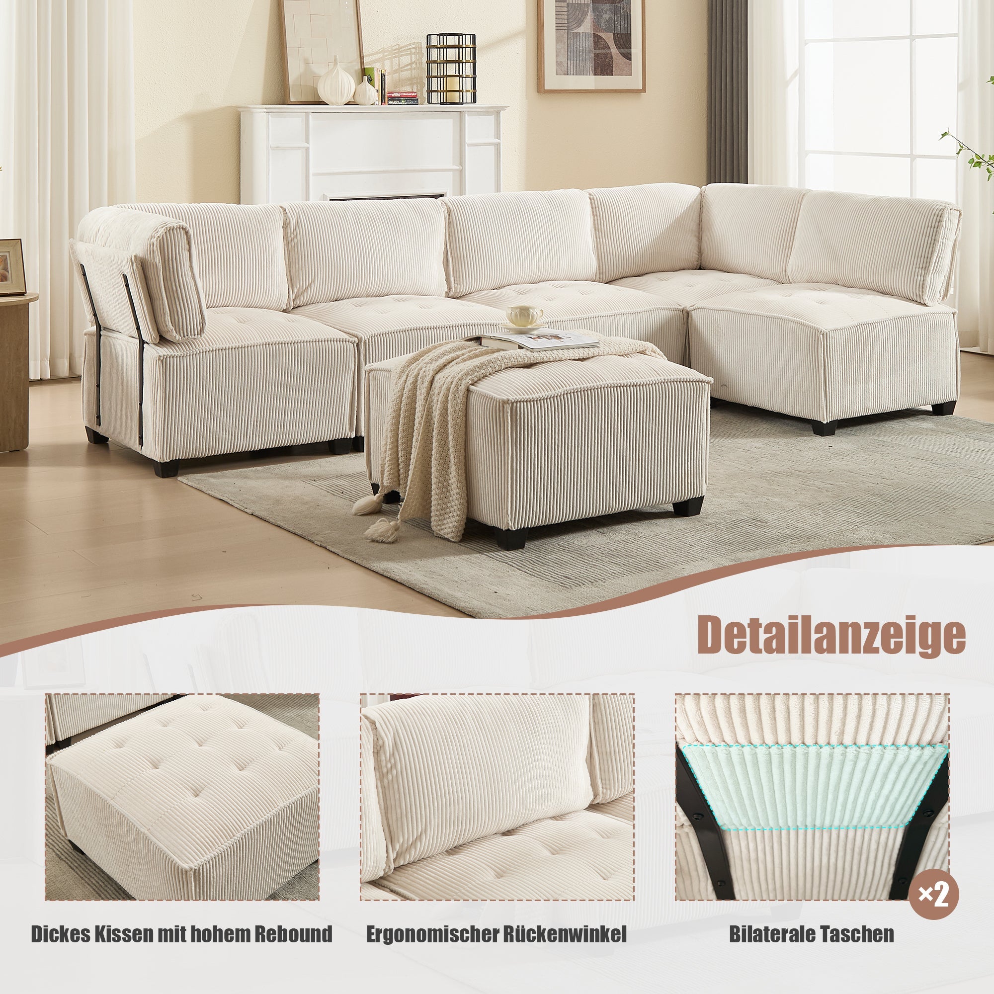 Modular 6-Seater Sofa 308cm Ergonomic Storage Pockets Corduroy, Beige