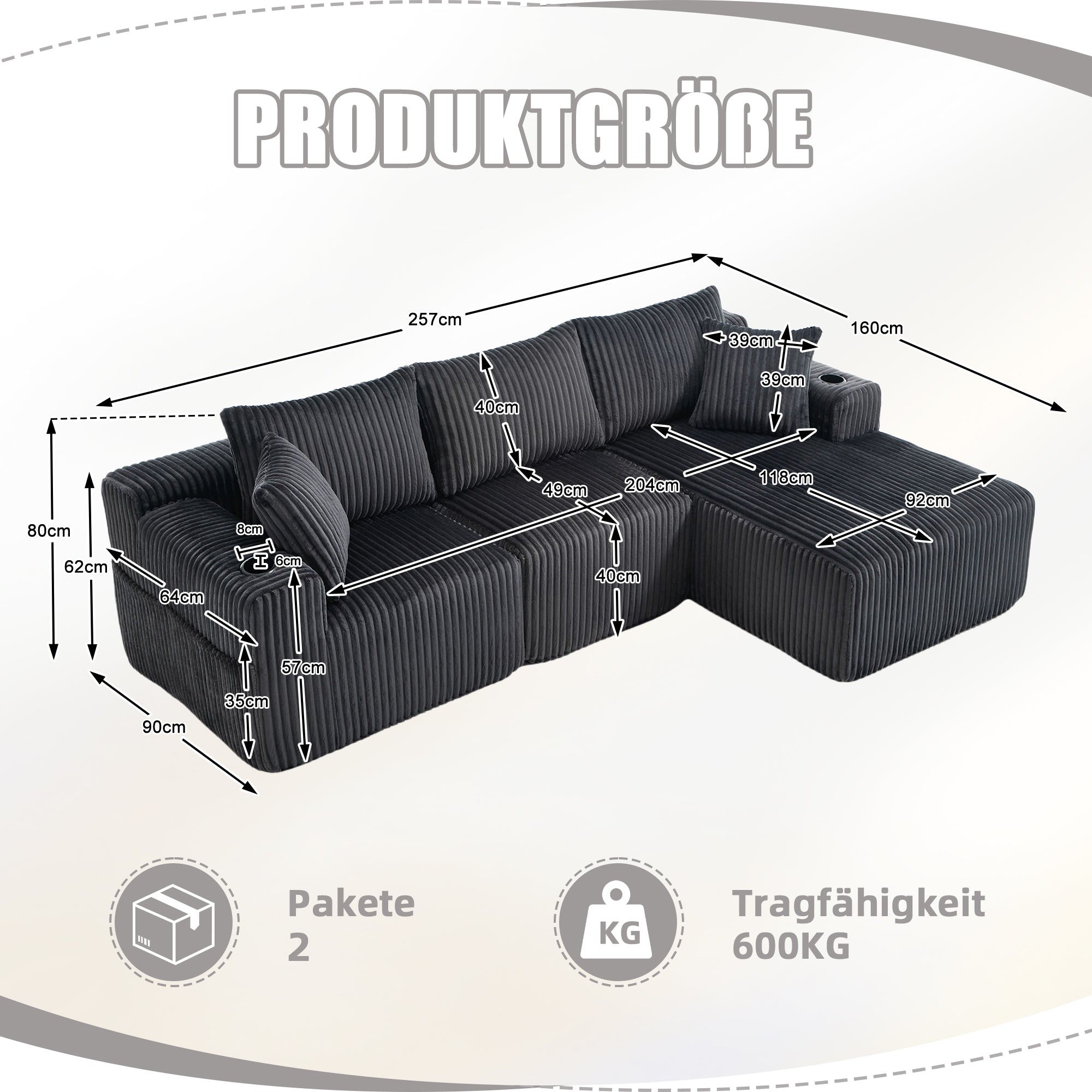 Modular Sofa Set Chaise 2-Seater Side Pockets Corduroy