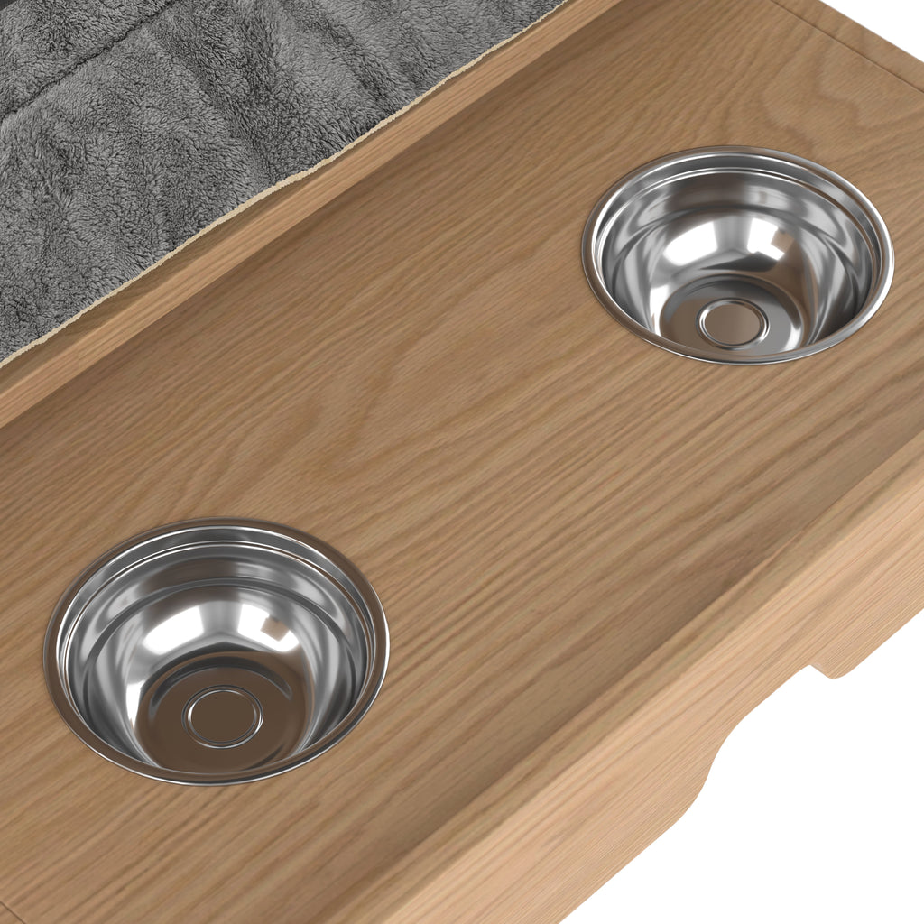 Package Contents: One cabinet, two stainless steel dog bowls, one dog mat.