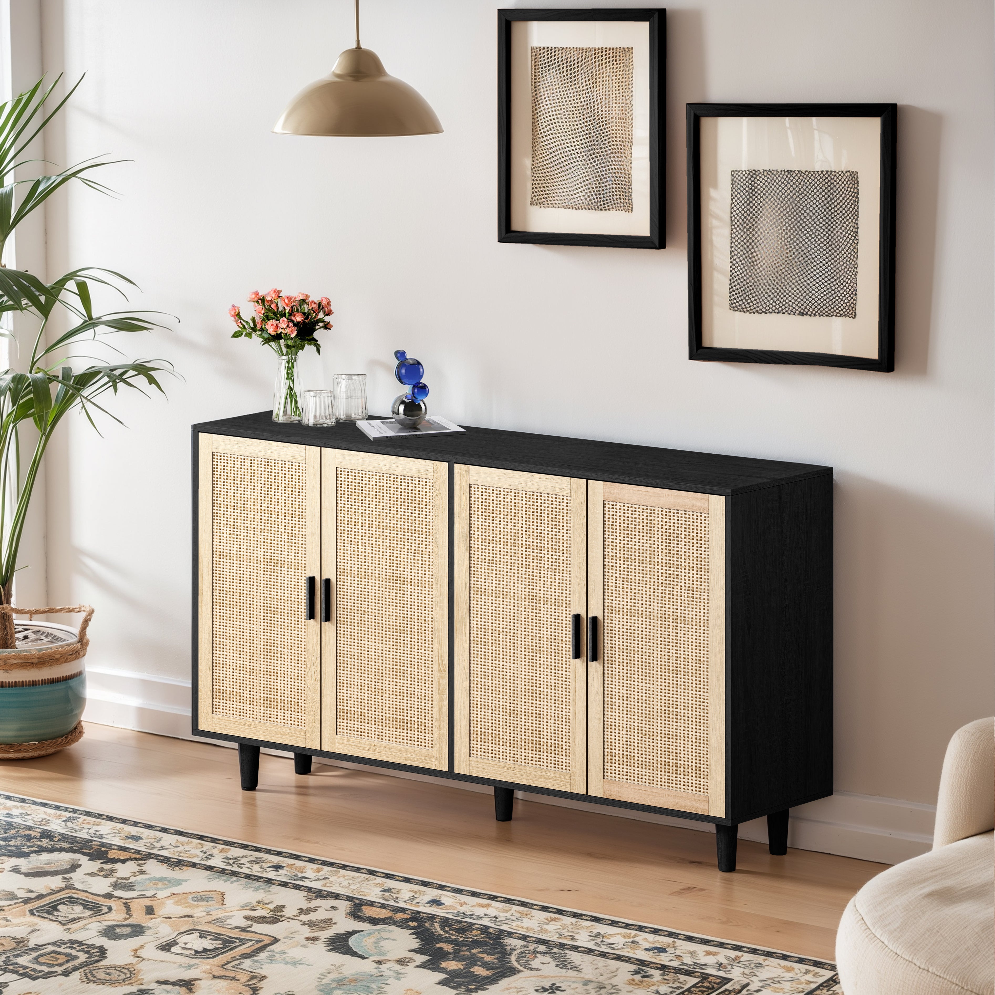 This storage cabinet is made of high-quality particleboard and features four decorative rattan doors. Its interior design is sensible and offers ample storage space to keep your living area tidy and organized. The decorative rattan doors are both stylish and functional, making this piece a great addition to your home decor. The cabinet's simple structure also makes it easy to install, even if you're using it for the first time. Overall, this cabinet is an attractive and practical addition to any home.