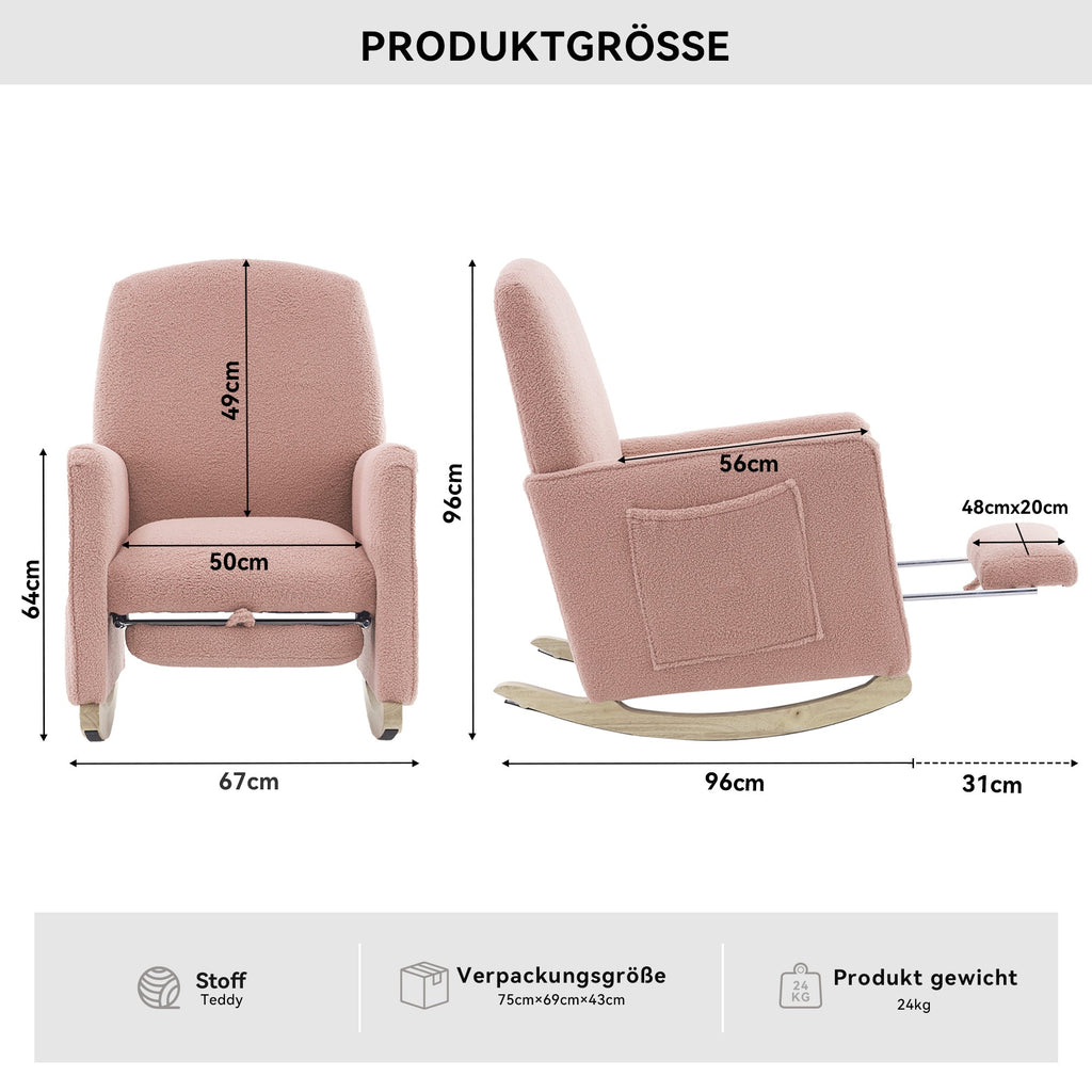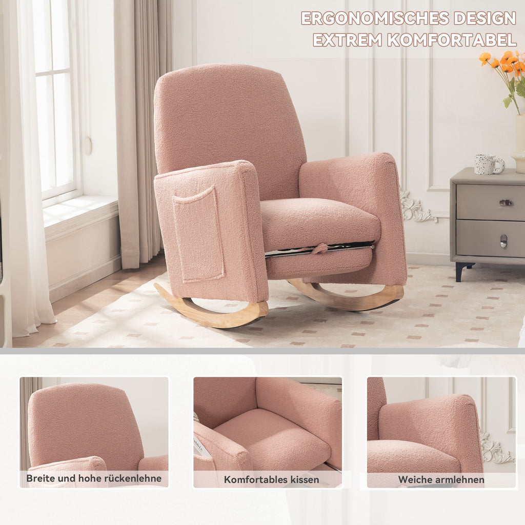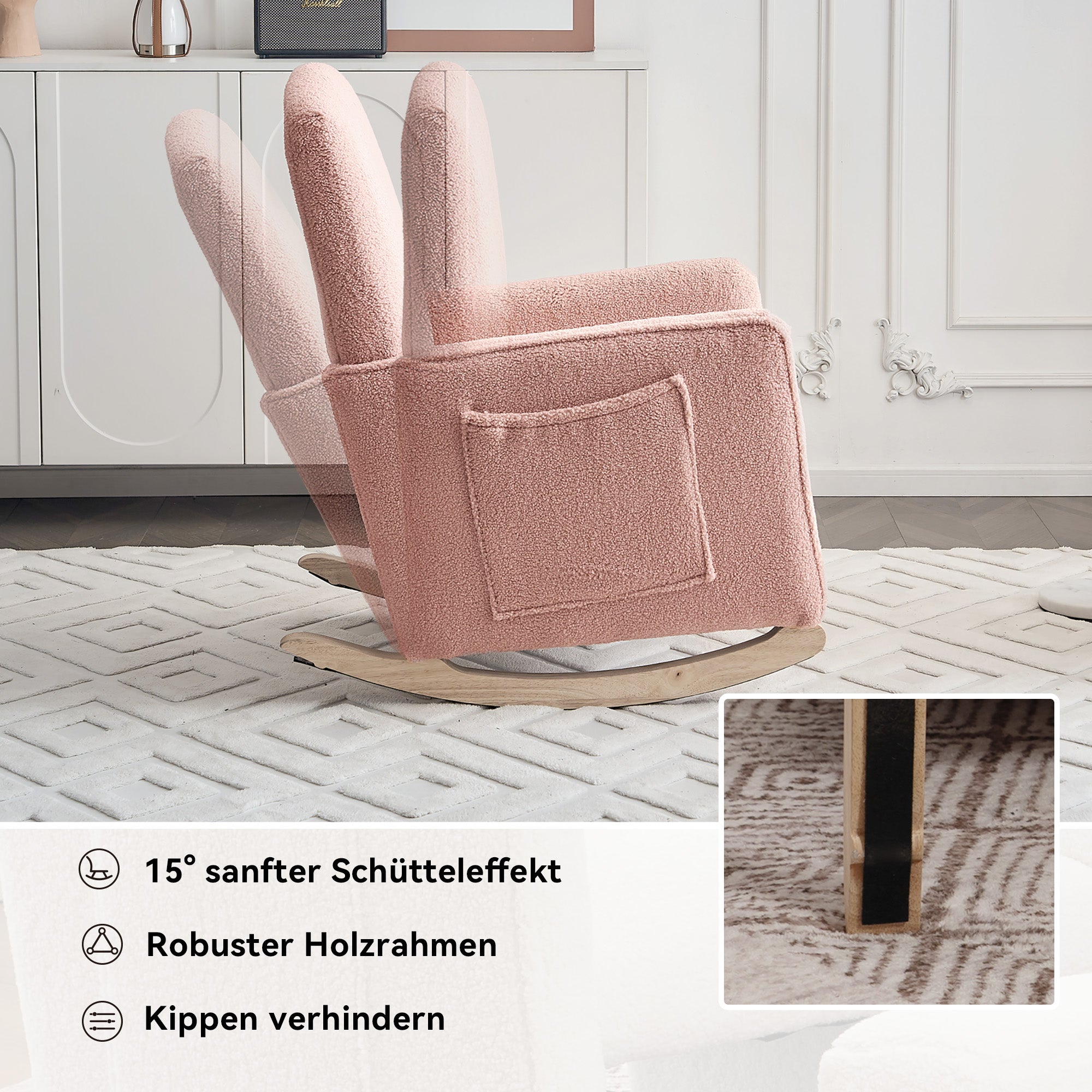 Rocking Chair with Stool, Indoor Recliner with High Backrest, Pink Teddy Fabric