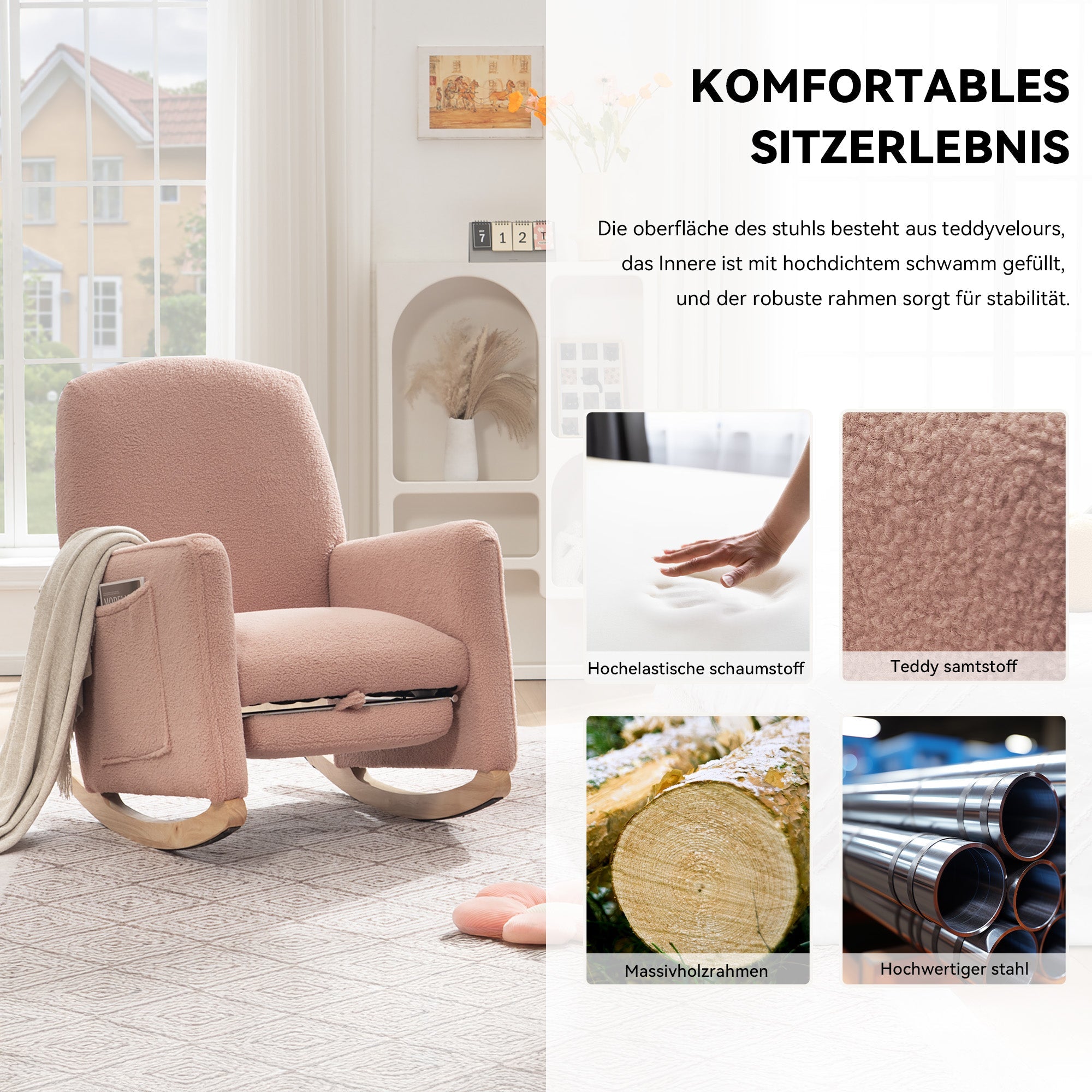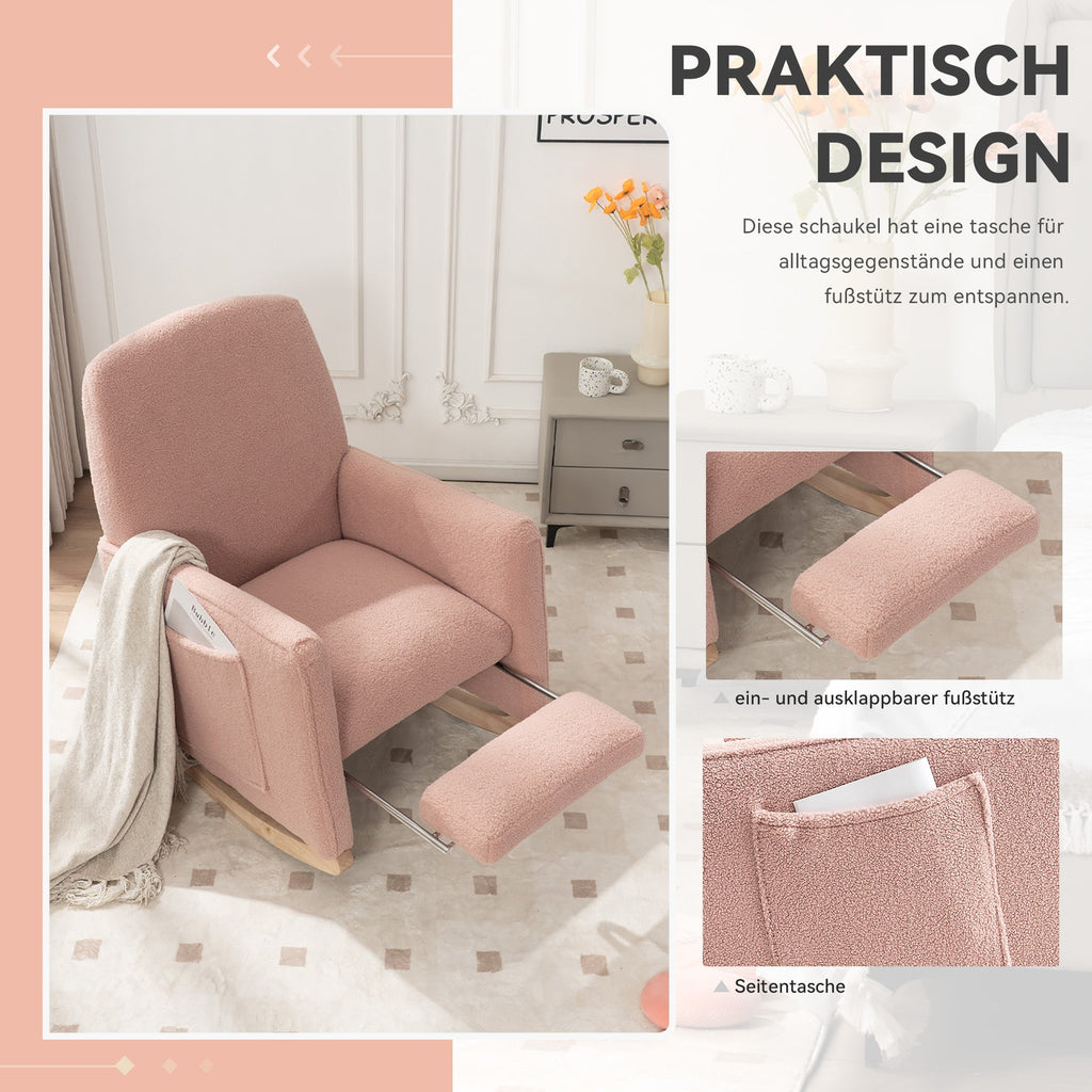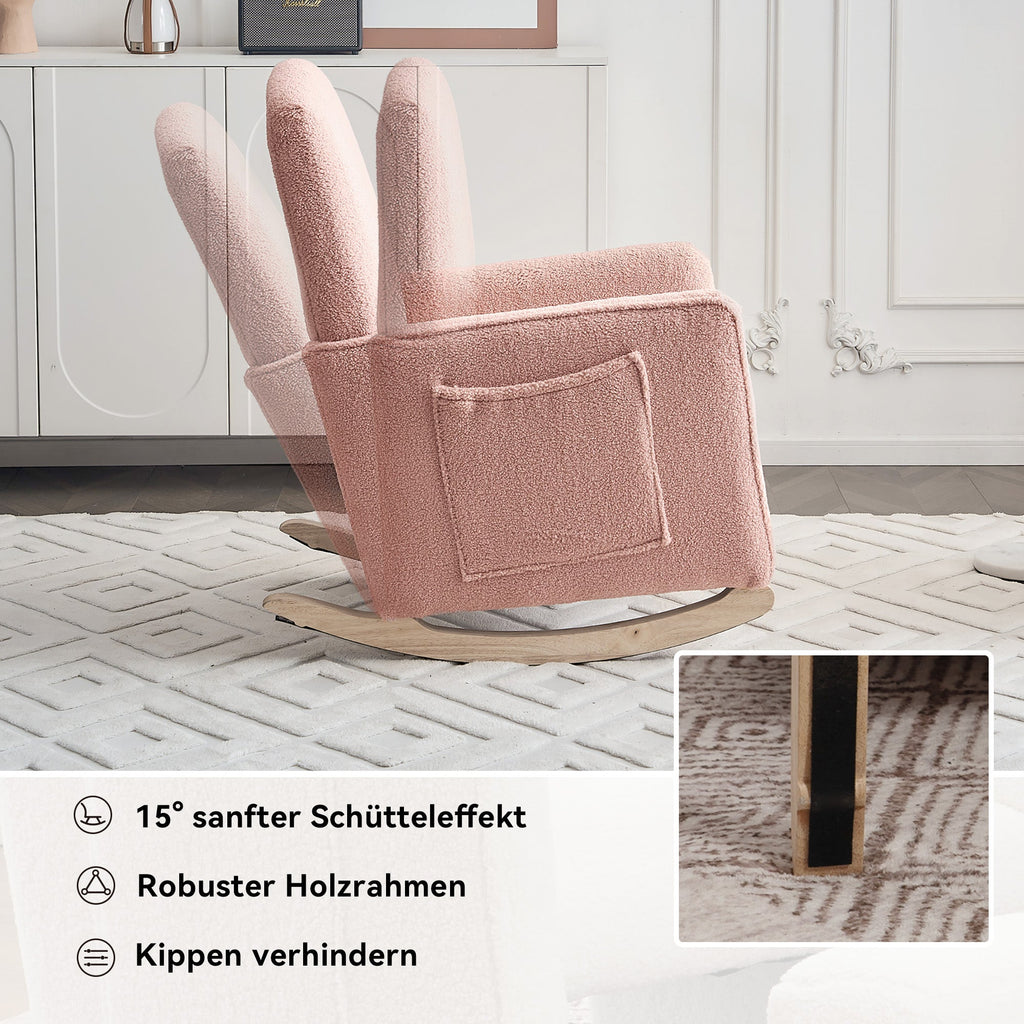 Rocking Chair with Stool, Indoor Recliner with High Backrest, Pink Teddy Fabric