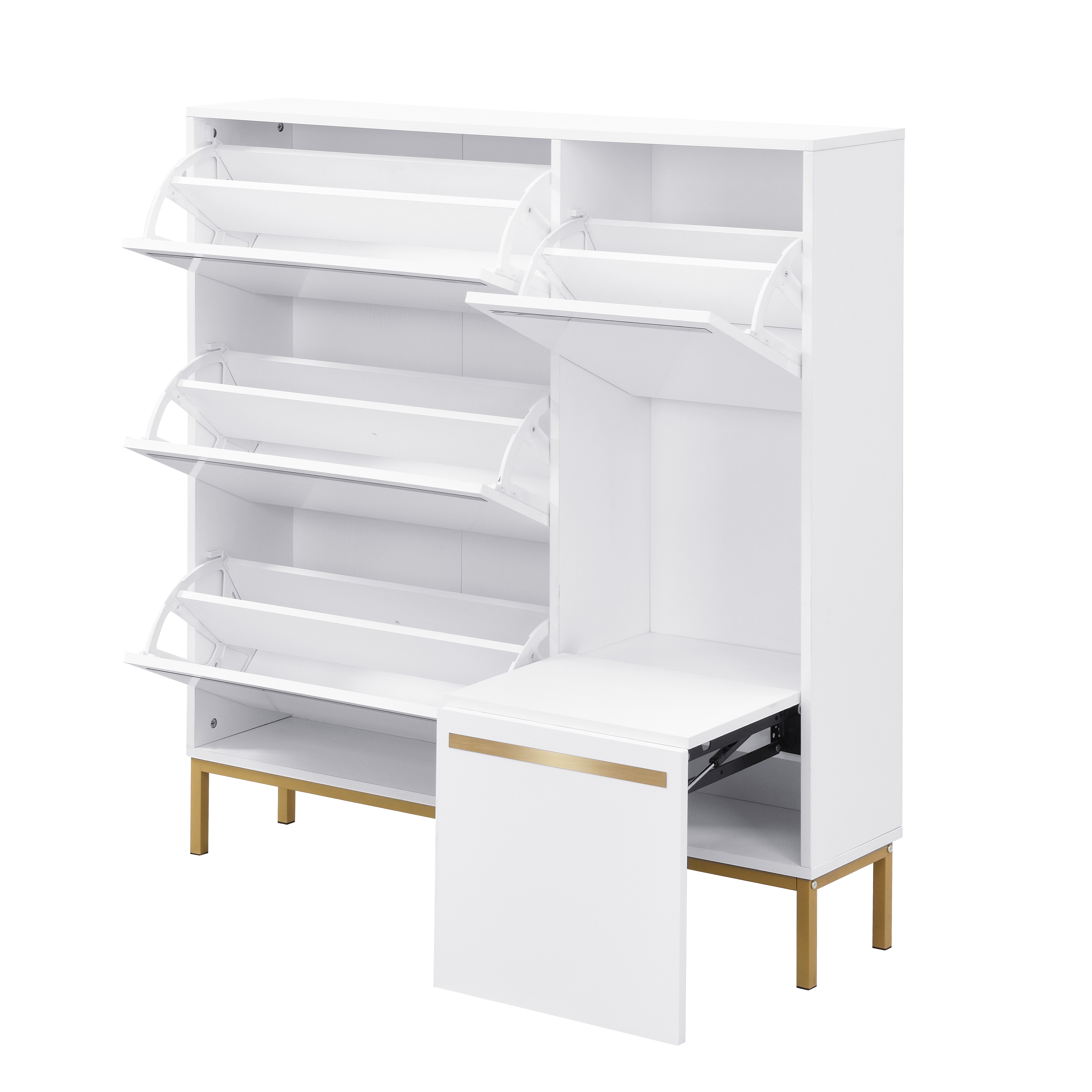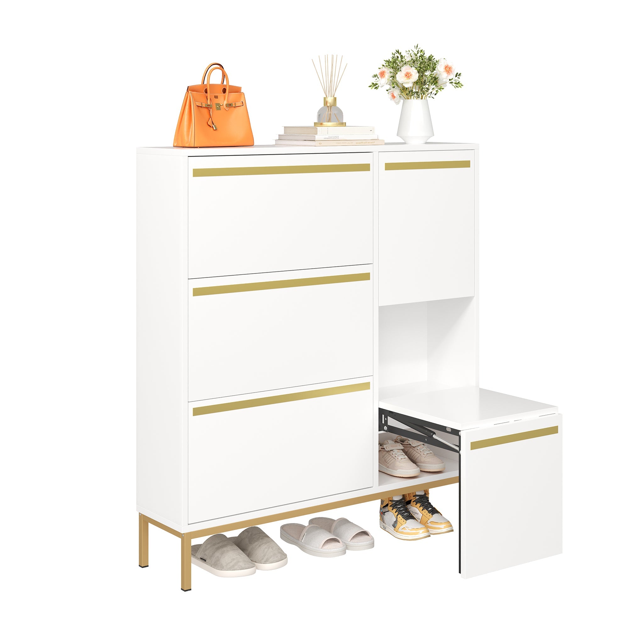 A special highlight is the hidden pull-out bench for comfortably putting on and taking off shoes. This space-saving addition blends seamlessly into your wardrobe, offering additional functionality without taking up more space. The beauty of the cabinet lies in the unique metal strips on the door, which, combined with the white cabinetry, create a sleek and light luxury aesthetic. It will enhance any entryway, hallway, or bedroom. Not only is this cabinet durable, but it also exudes timeless elegance, serving as a practical storage unit as well as a personalized addition to the home.