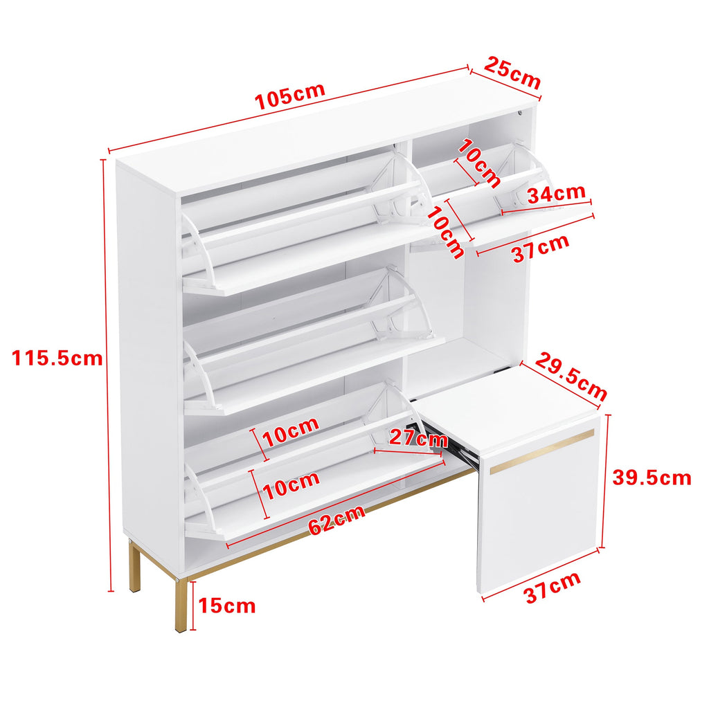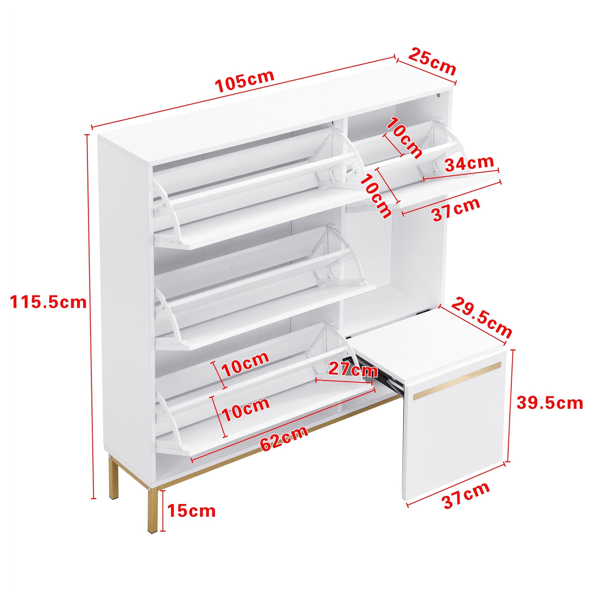 This stylish, glossy shoe cabinet combines functionality with elegant design, offering a smart and practical storage solution for your home. Cleverly designed, the shoe cabinet features double shelves, a shoe changing stool, and an open bottom compartment, providing space for 15-22 pairs of shoes in various sizes, suitable for men, women, and children. The open space provides a convenient place for slippers, meeting the needs of every family member.