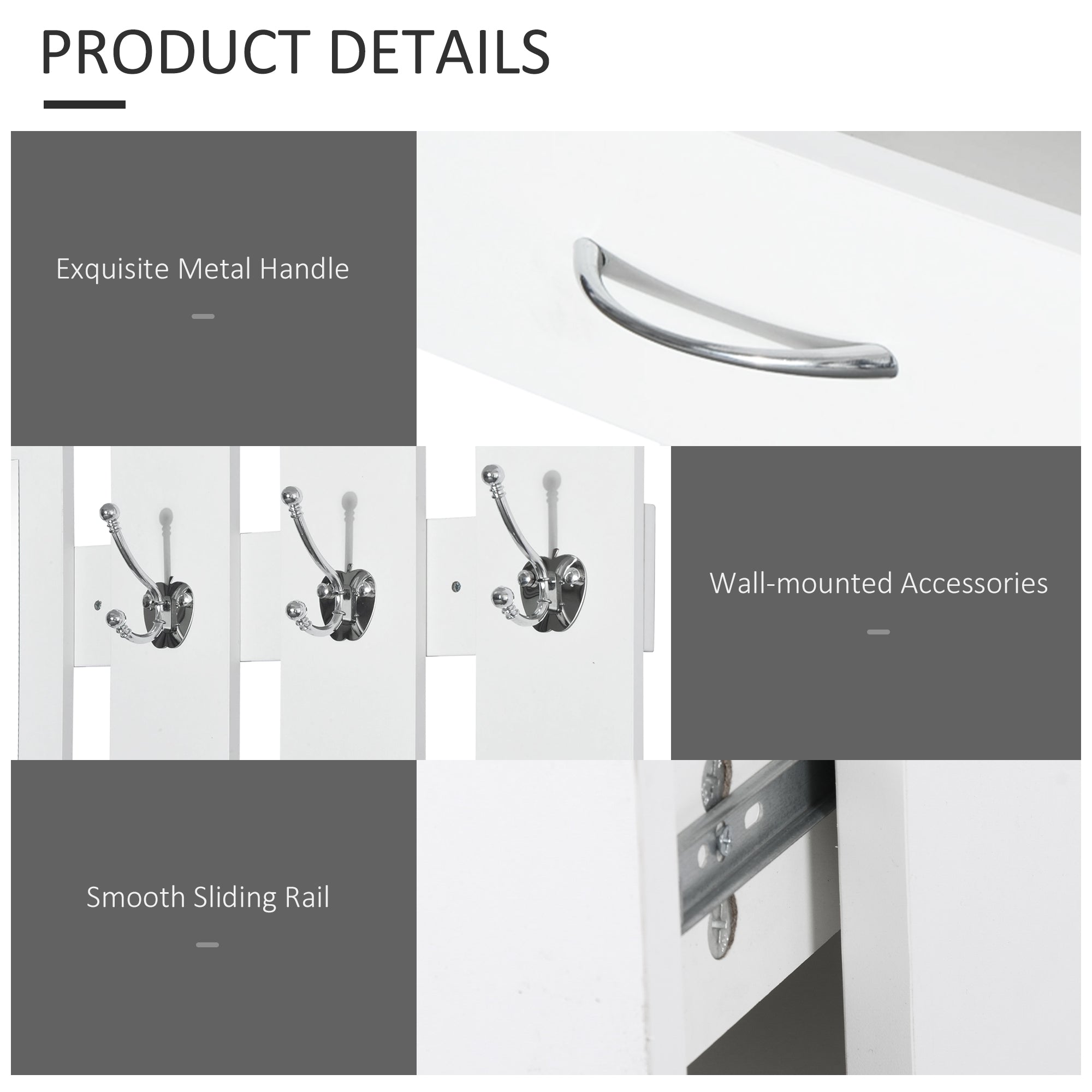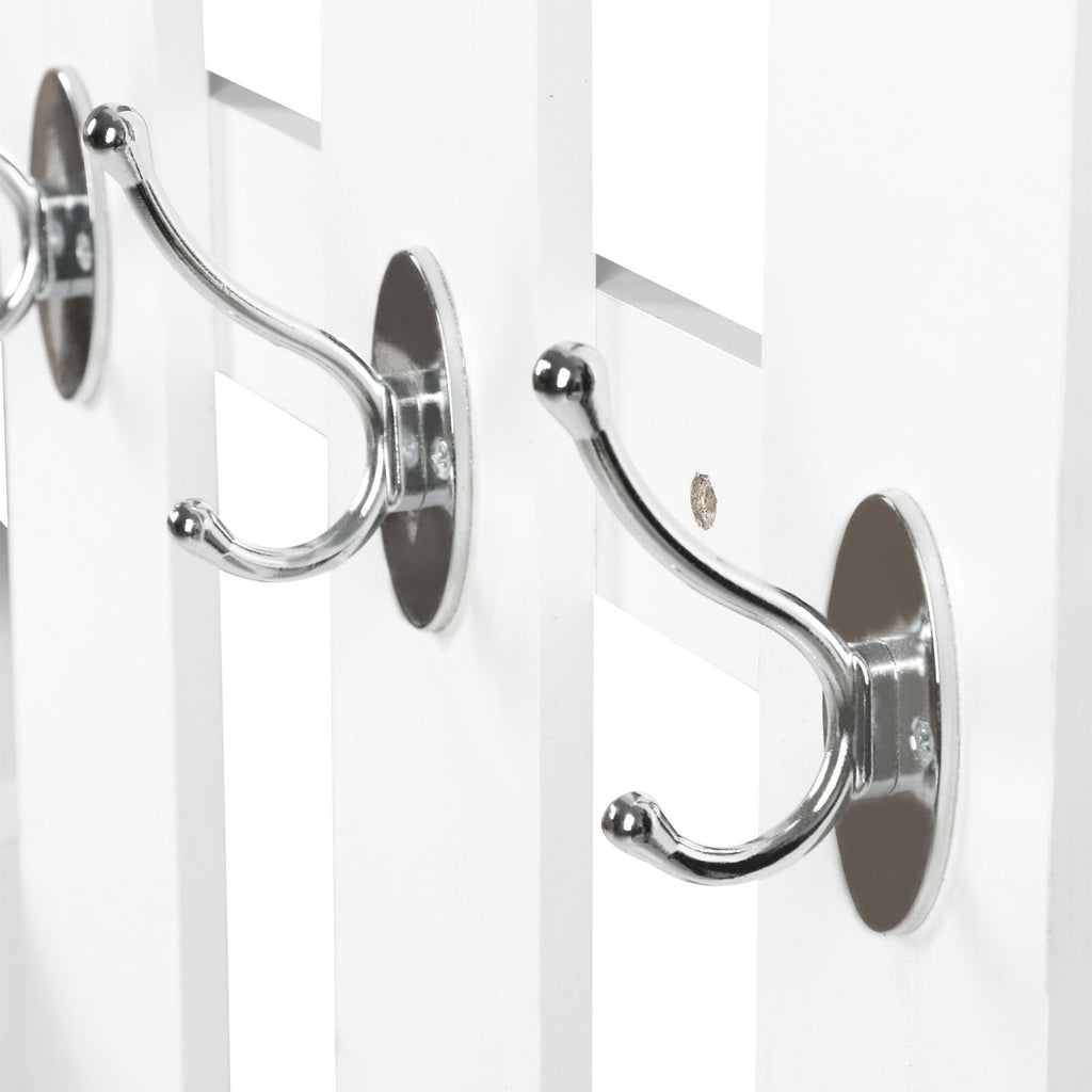 This 3-in-1 unit features a mirror, hanging hooks, and shoe storage.
