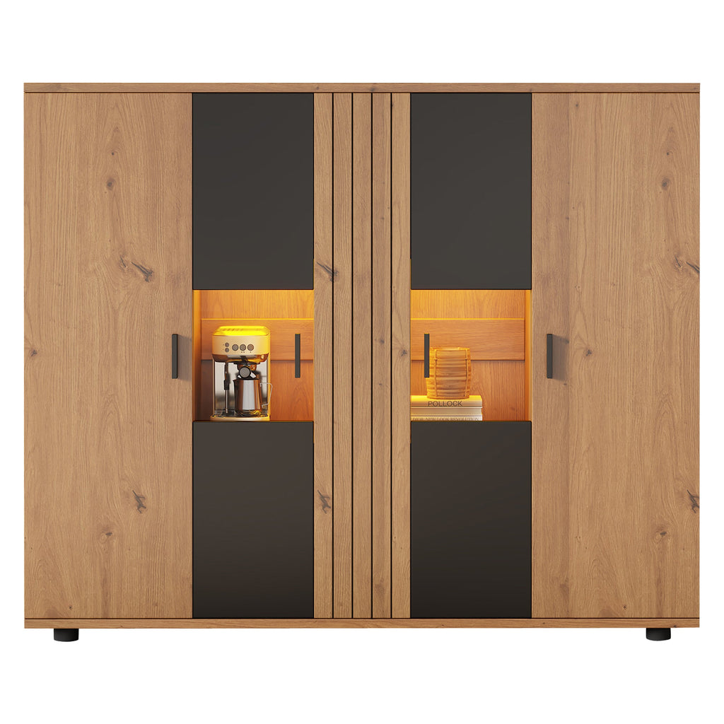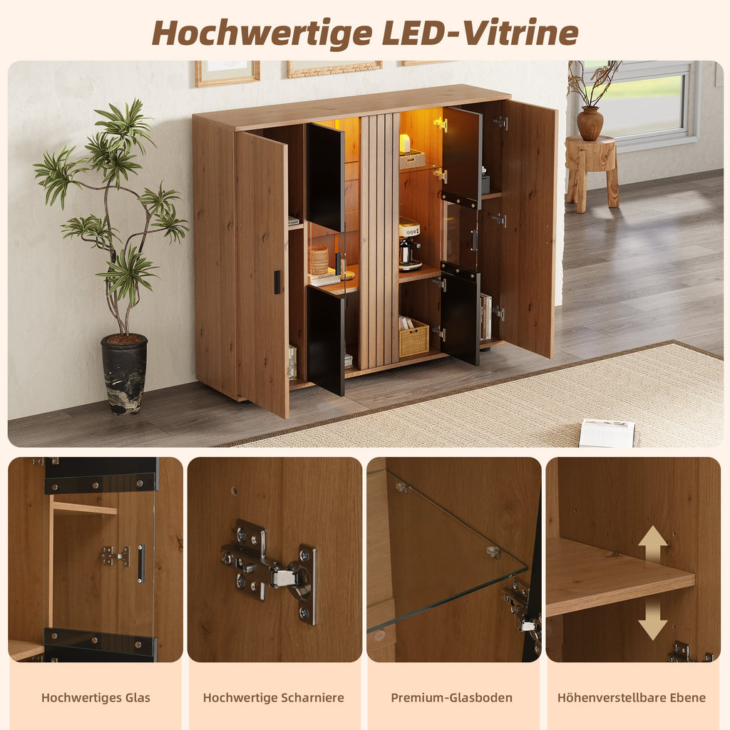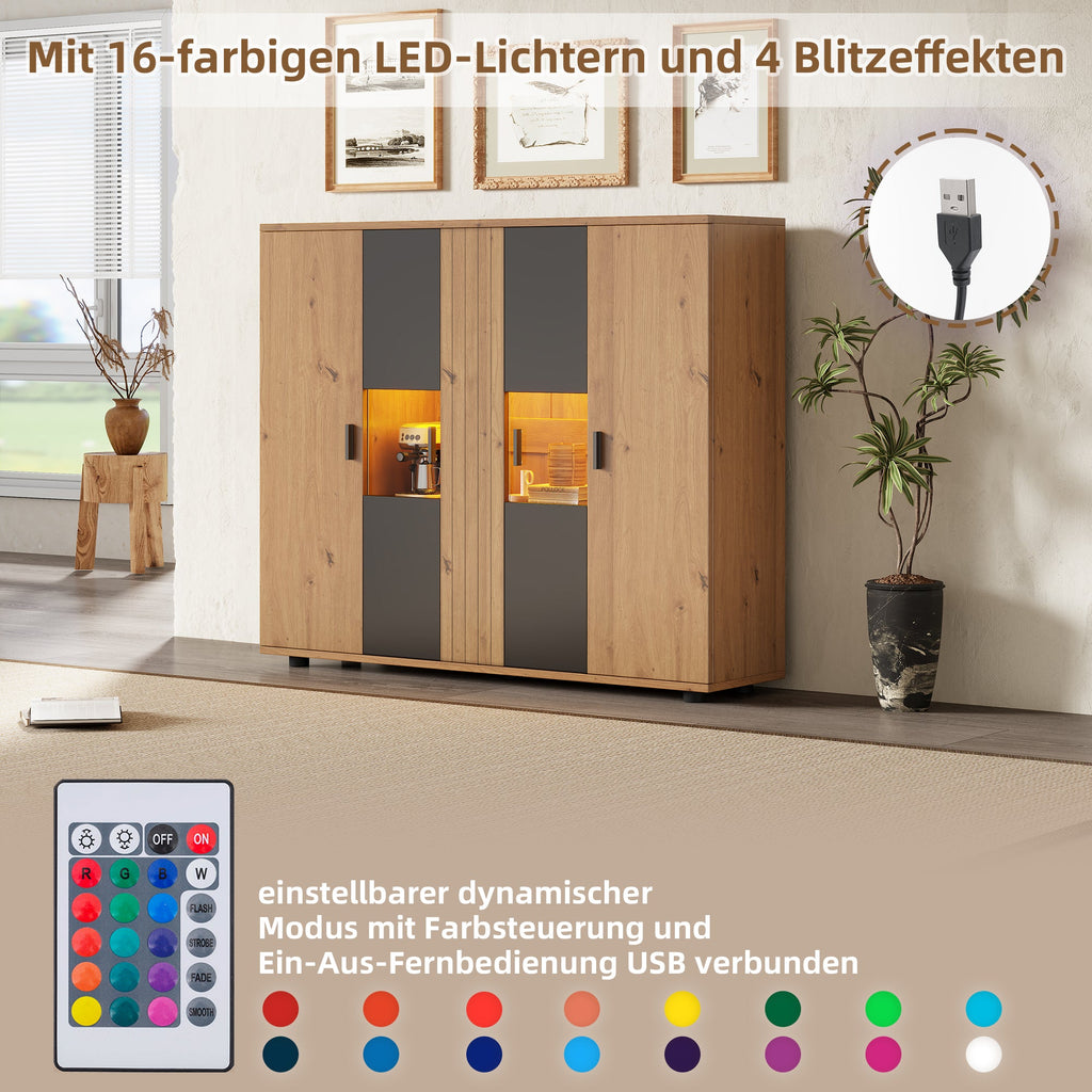 LED light strips, controlled via a mobile phone app, and glass doors enhance the ambiance of any living room. This side cabinet features four cabinet feet and an original wood color combined with a black splicing design. It is constructed from particleboard with a total load capacity of 60 kg.