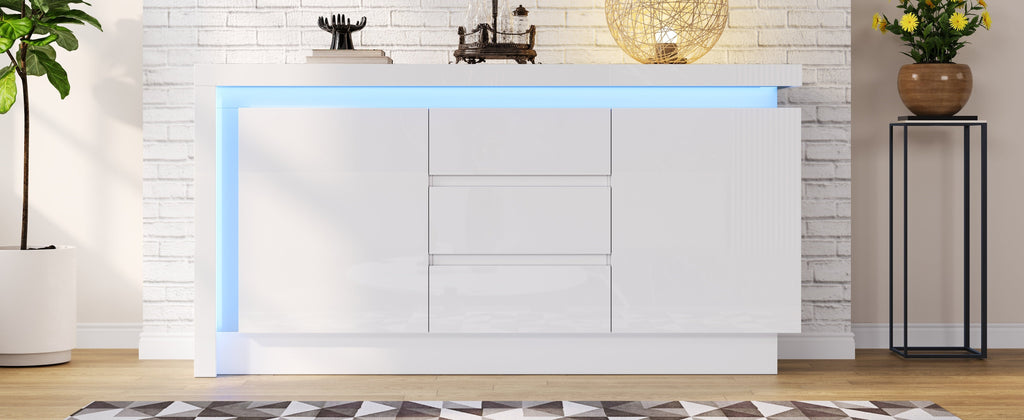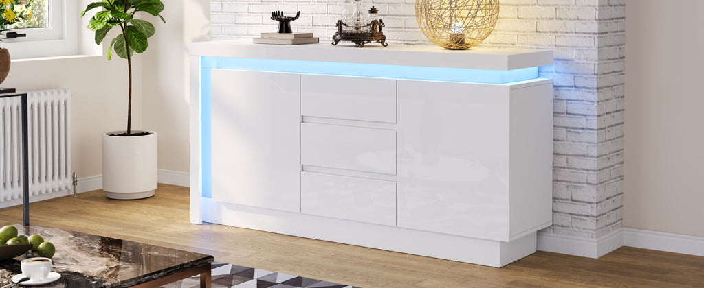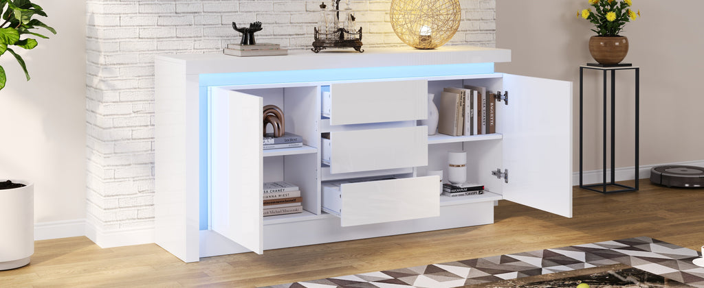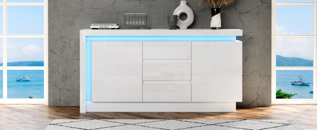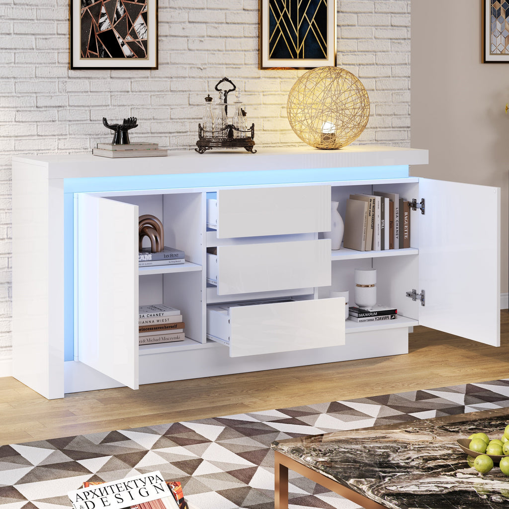 Sideboard, 140x35x72cm, 3 Drawers, 2 Doors, Adjustable Shelves, LED, High-Gloss White