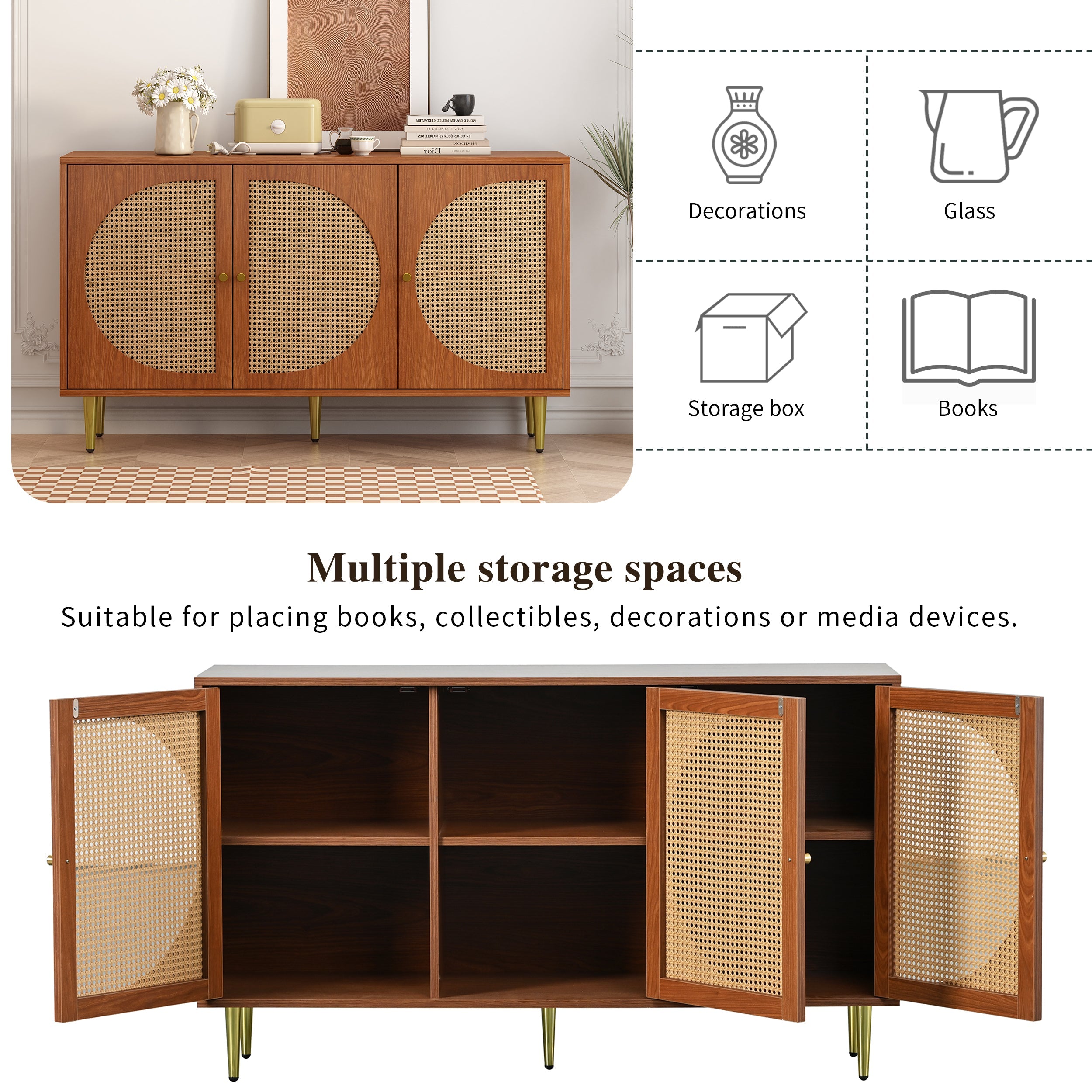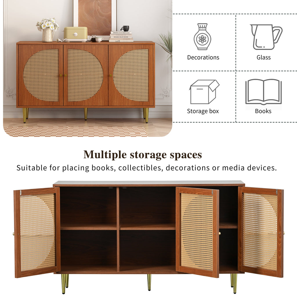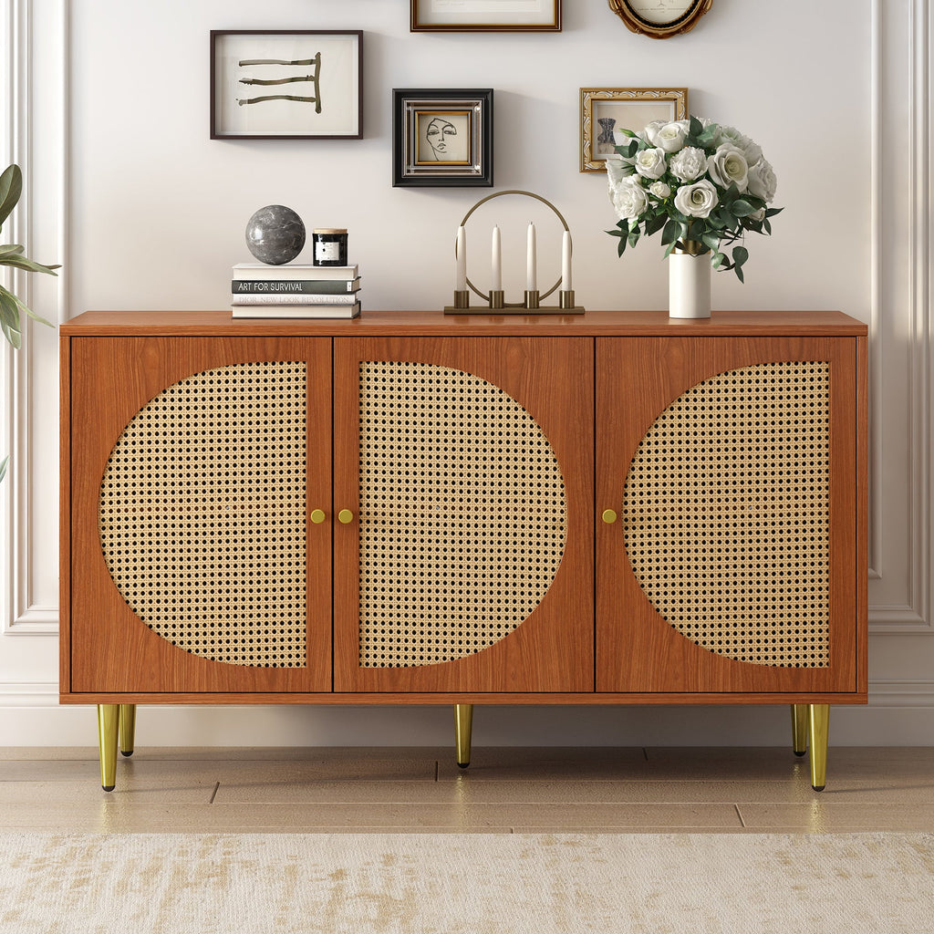 Sideboard, 3 Rattan Doors, Metal Handles, Walnut