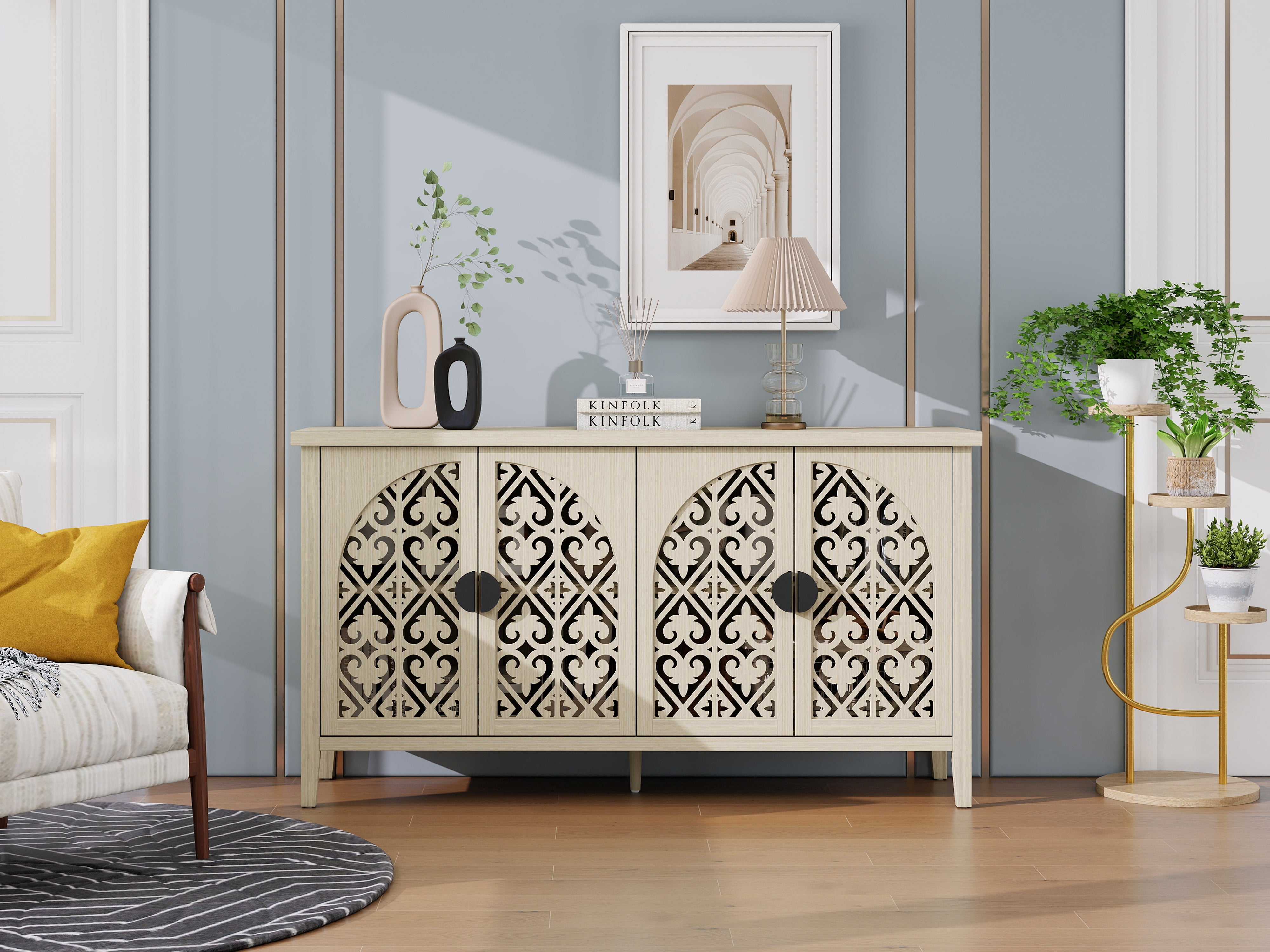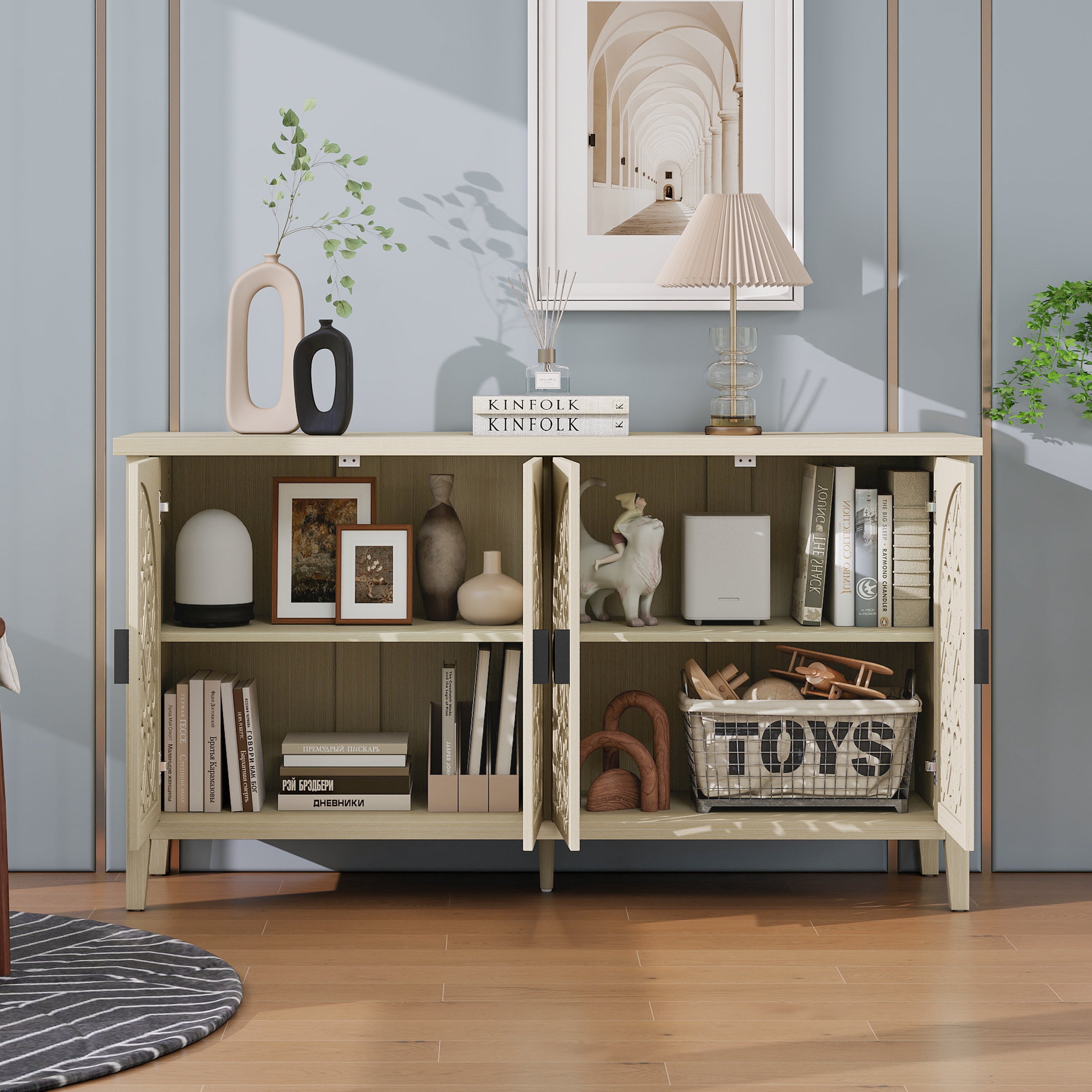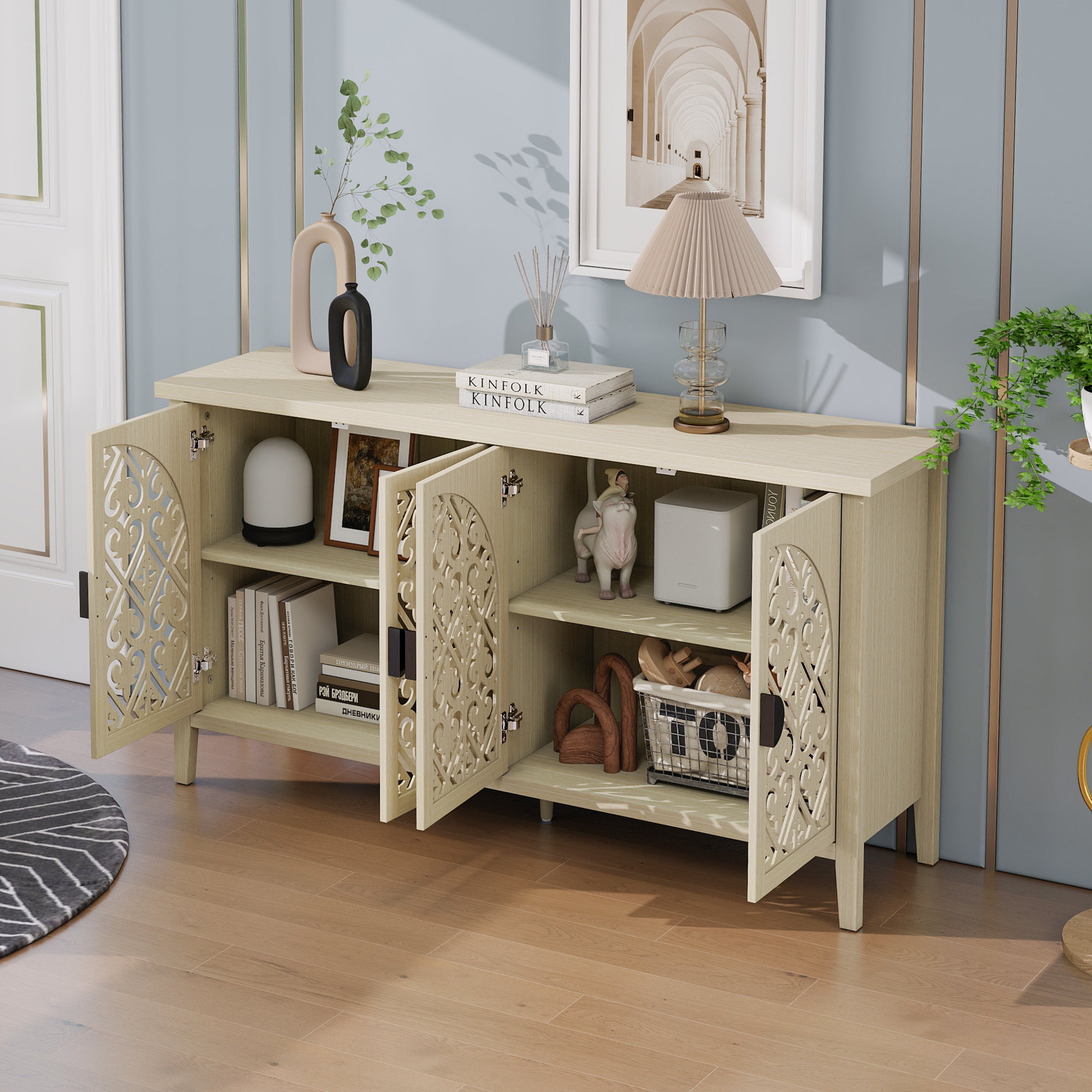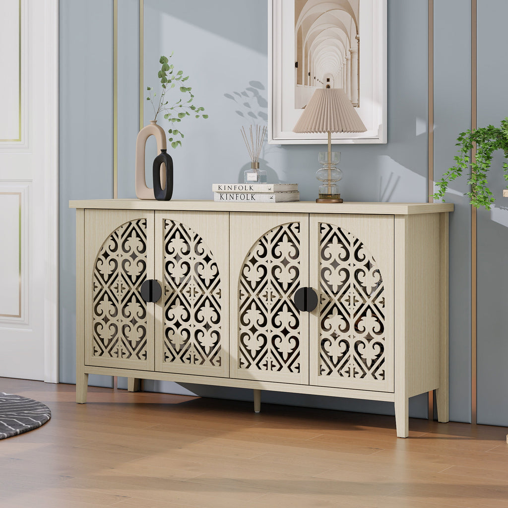 Sideboard, 4-Door Carved & Openwork with 3 Shelves, Natural Wood