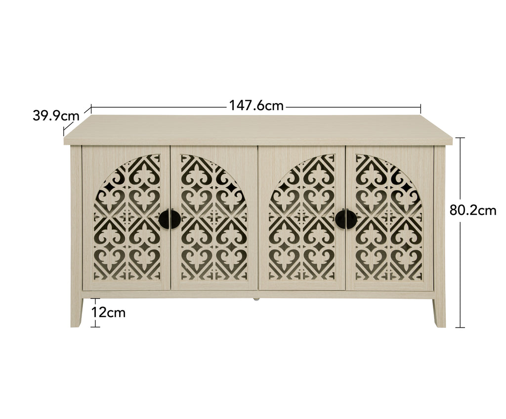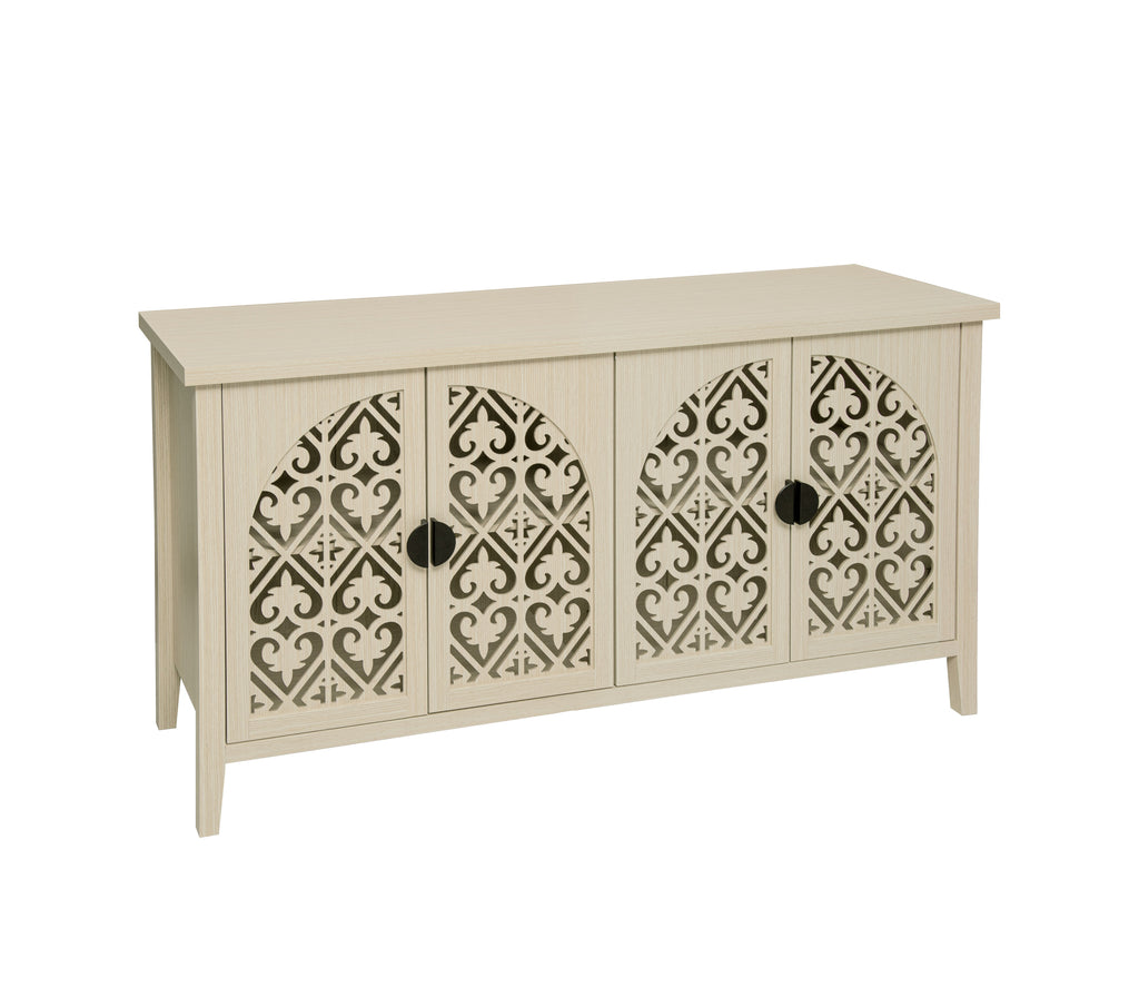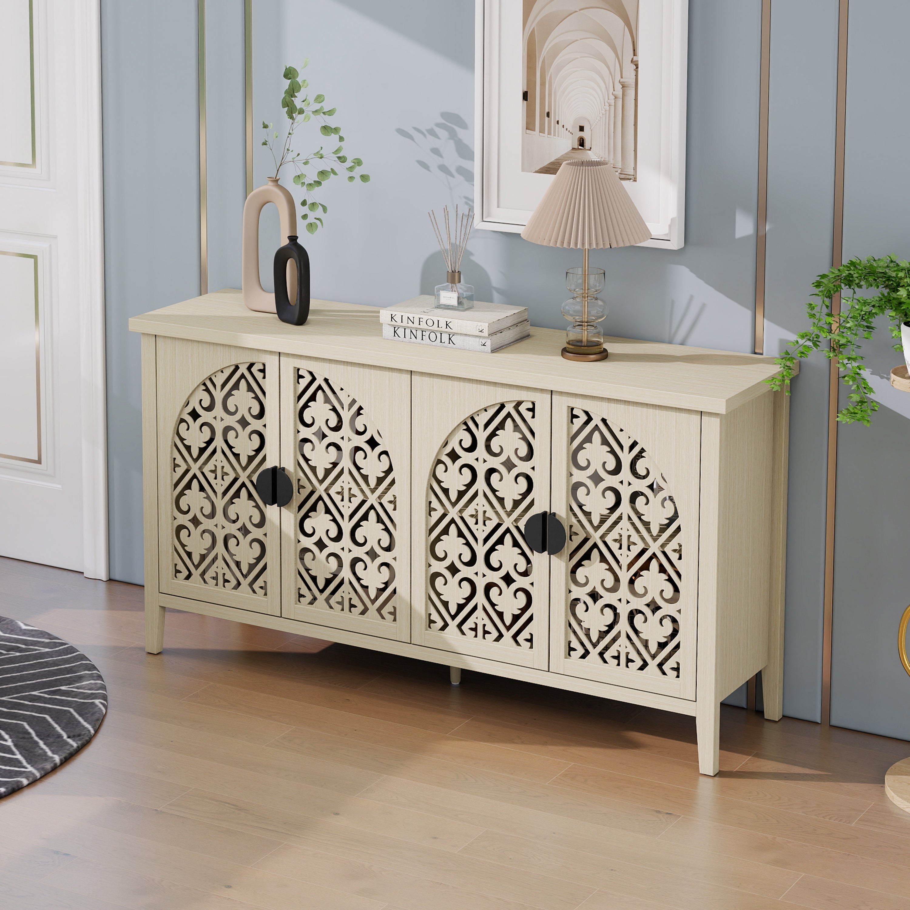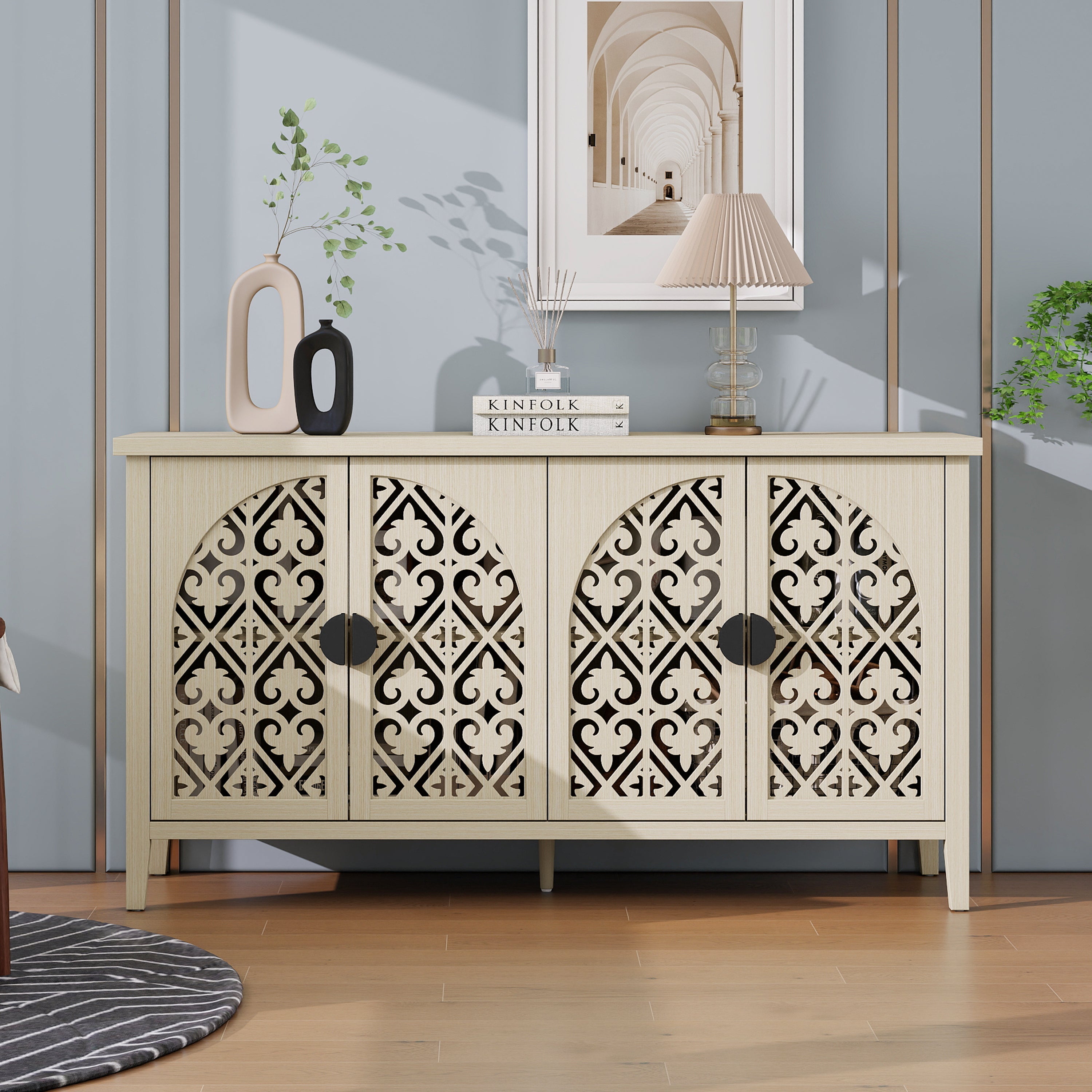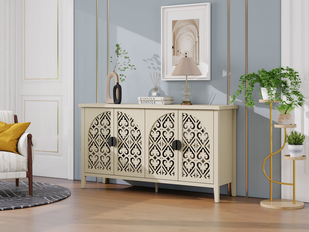 Sideboard, 4-Door Carved & Openwork with 3 Shelves, Natural Wood