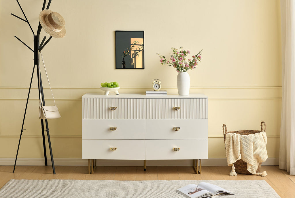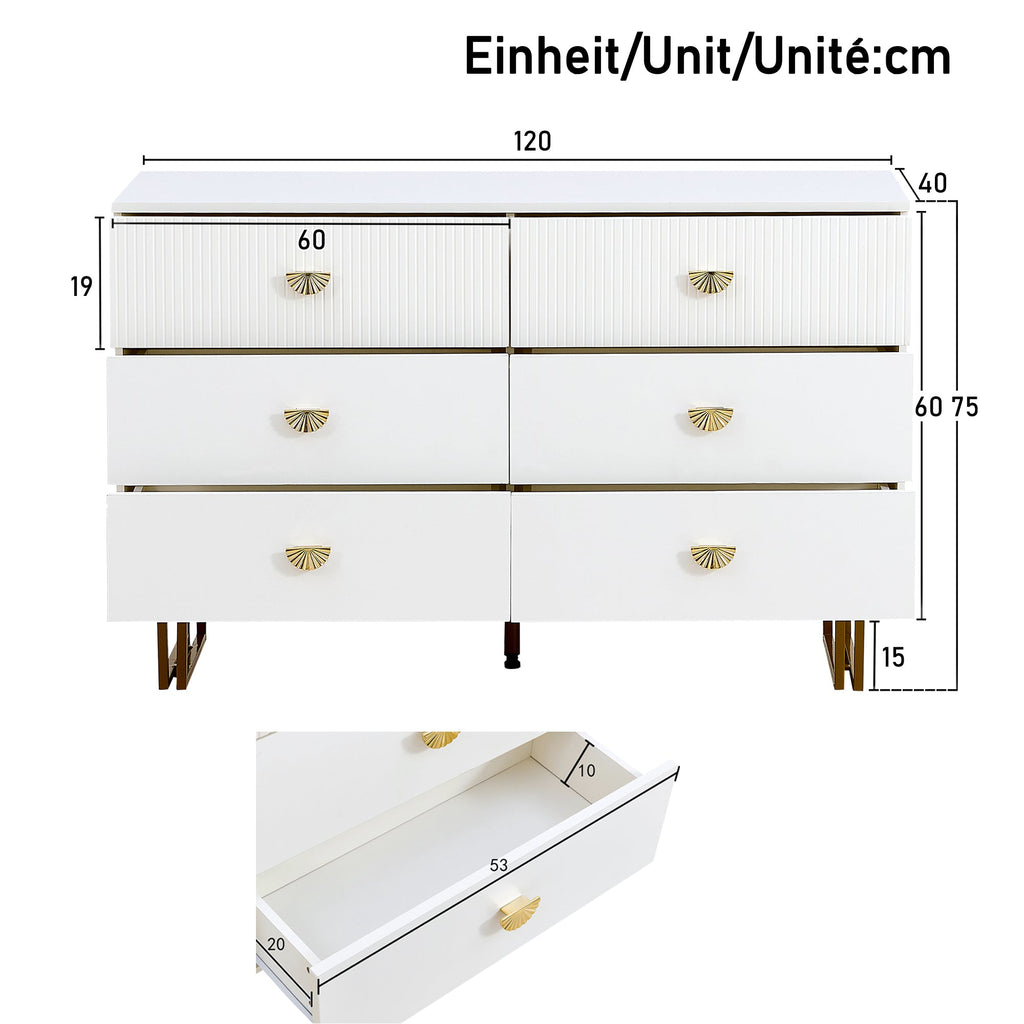 Sideboard, 6-Drawer Elegant Design, White and Gold MDF and Steel